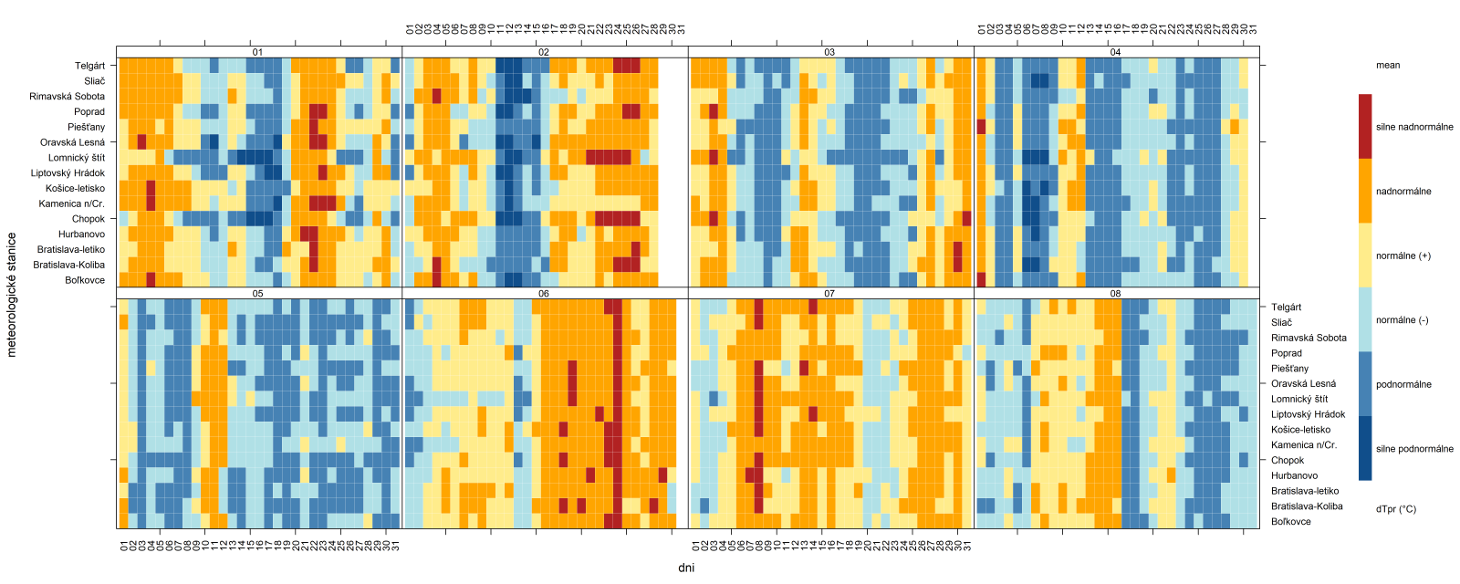▲ Obr. 8: Vývoj odchýlky priemernej dennej teploty vzduchu [°C] od normálu 1981 - 2010 na vybraných meteorologických staniciach v období od 1.1. do 31.8.2021; na oxi x-ovej sú dni v mesiaci a mesiace január - august 2021 sú označené číselnými hodnotami 01 - 08 (zdroj: SHMÚ).