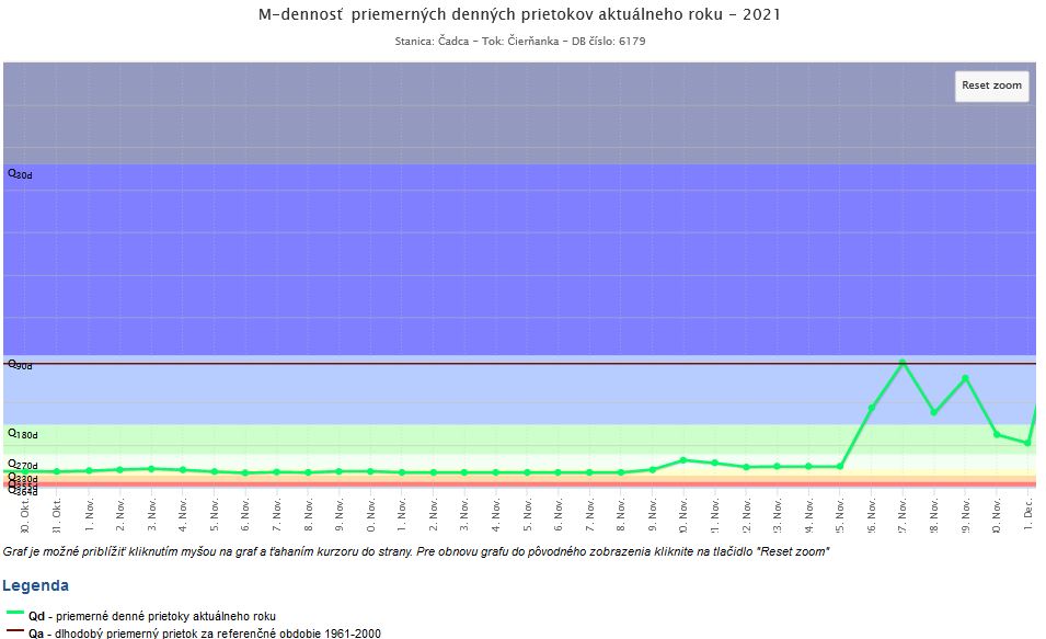 Celkovo hodnoty Qd na začiatku novembra na Slovensku odpovedali hodnotám dlhodobých M-denných prietokov* v rozmedzí Q180d až Q355d, ojedinele poklesli aj na nižšie hodnoty. K nárastu došlo ku koncu mesiaca, najväčšie M-dennosti boli zaznamenané 29.11.2021 (obr. 3).