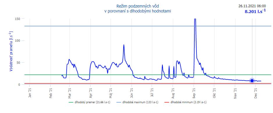 Nepriaznivá klimatická situácia v mesiaci október sa prejavila výraznejšie v podzemnej vode v mesiaci november, a to poklesom hladín a výdatností prameňov. Celkovo je tento mesiac z hľadiska podzemnej vody hodnotený ako priemerný až mierne podpriemerný. K poklesu hladiny oproti predošlému mesiacu došlo v 40 sondách (v rozmedzí hodnôt 0,01 až 0,34 m) a na 21 prameňoch (rozpätie poklesu výdatností bolo od 0,04 l/s do 181,17 l/s). Pod dlhodobým priemerom sa na konci mesiaca vyskytlo 97 objektov, ale ani jeden hodnotený objekt nepodkročil dlhodobé minimum. Aj na prameni Žiar (obr. 8) môžeme vidieť dlhodobejší režim tohto prameňa. V mesiaci november došlo k miernemu poklesu výdatnosti, ktorá sa pohybovala pod dlhodobým priemerom.