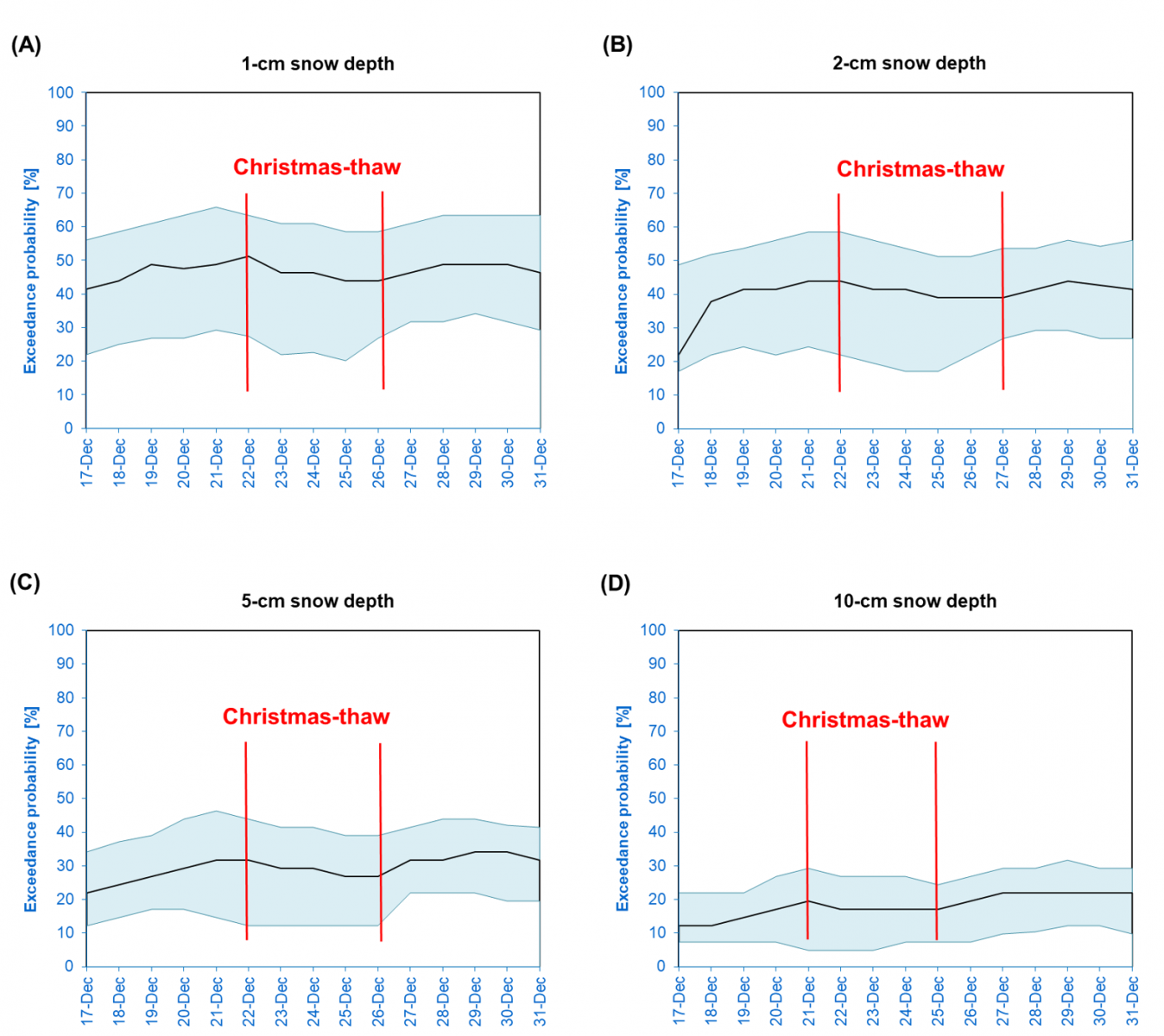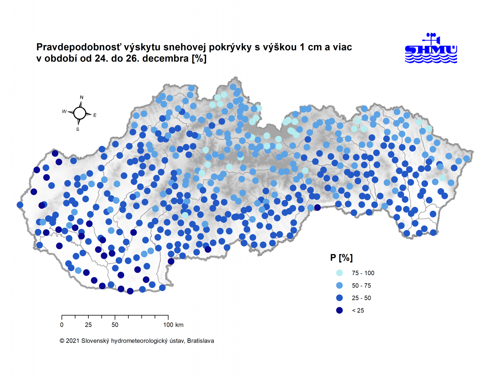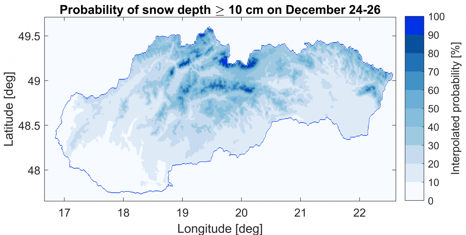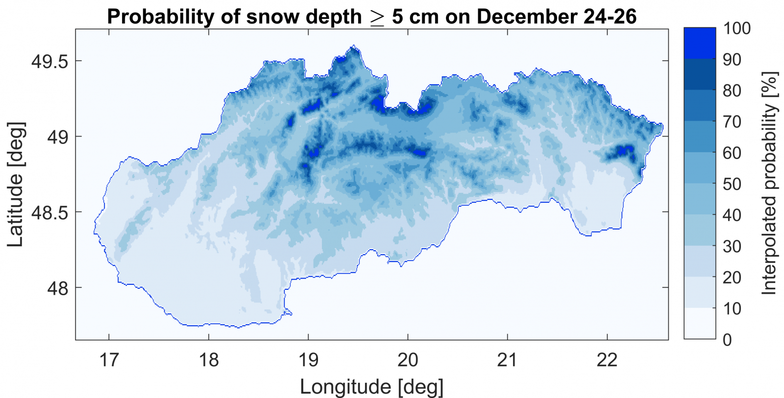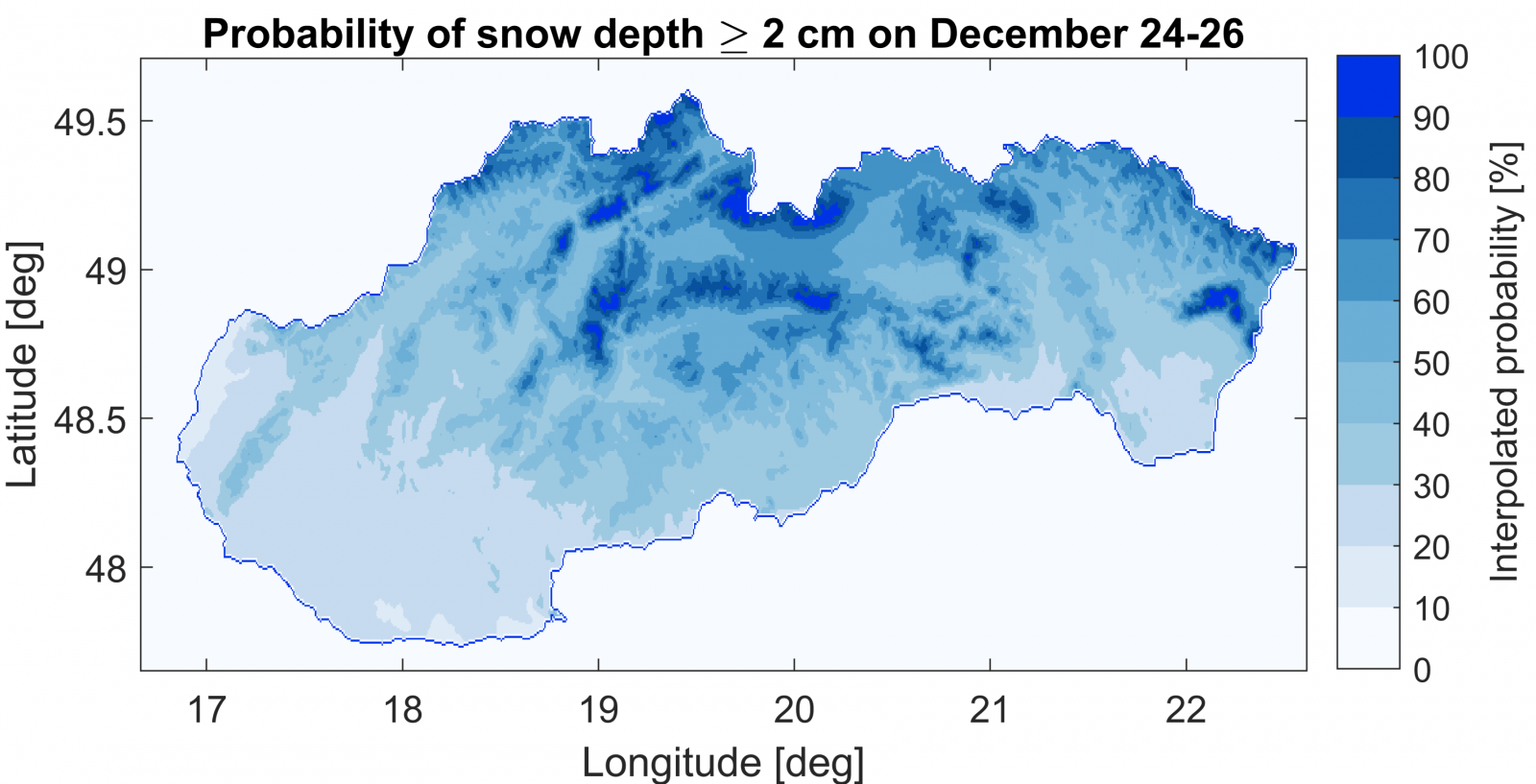 Výskyt snehovej pokrývky ≥ 1 cm počas vianočných sviatkov má vysokú pravdepodobnosť (> 80 %) iba v horských oblastiach Slovenska, resp. v oblastiach s nadmorskou výškou viac ako 700 metrov. Vo všeobecnosti možno prijať záver, že počas vianočných sviatkov je pravdepodobnosť výskytu snehovej pokrývky na území Slovenska najnižšia v oblasti Záhorskej nížiny a v južných okresoch západného Slovenska.