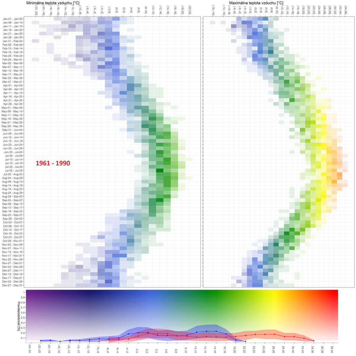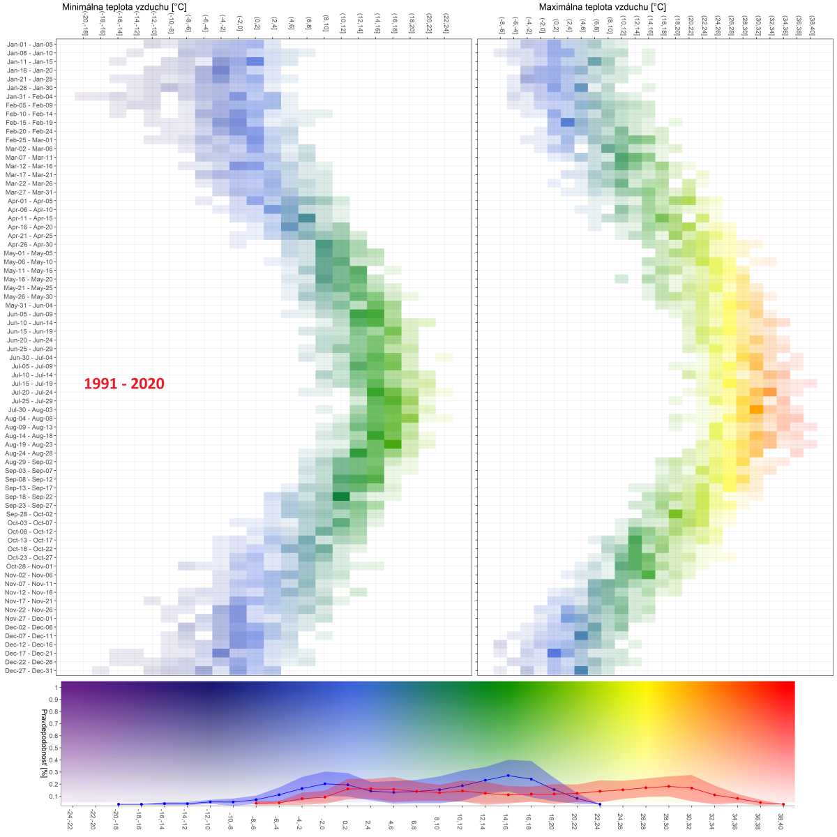 ▲ Obr. 5: Ročný režim pravdepodobnosti výskytu maximálnej a minimálnej dennej teploty vzduchu (podľa farebnej škály) v jednotlivých teplotných intervaloch (os x) a jednotlivých pentádach (os y) na meteorologickej stanici v Hurbanove medzi obdobiami 1961 − 1990 (vľavo) a 1991 − 2020 (vpravo); vianočná pentáda je zobrazená v dolnej časti časovej osi: 22. − 26. decembra; čím je farba v danom "štvorci" sýtejšia, tým je nadobudnutie intervalovej hodnoty Tmax a Tmin pravdepodobnejšia (Zdroj: SHMÚ).