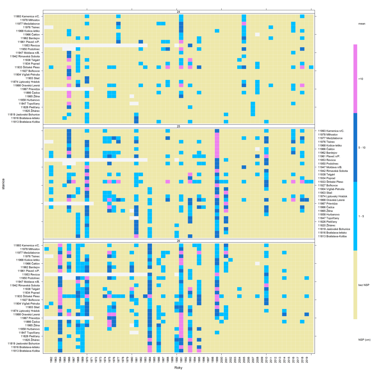 ▲ Obr. 6: Zaznamenaný výskyt novej (NSP; vľavo) a celkovej (CSP; vpravo) snehovej pokrývky na vybraných meteorologických staniciach na Slovensku v období 1961 − 2020 v dňoch 24. - 26. decembra; NSP a CSP je klasifikovaná podľa dosiahnutej výšky v cm (Zdroj: SHMÚ).