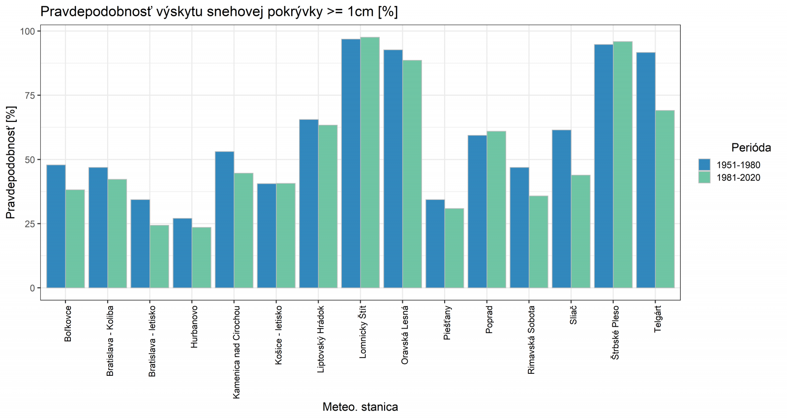▲ Obr. 4: Dlhodobé zmeny pravdepodobnosti výskytu celkovej snehovej pokrývky s výškou 1 cm a viac na vybraných meteorologických staniciach na Slovensku v období 1951 − 1980 a 1981 − 2020 (Zdroj: SHMÚ).