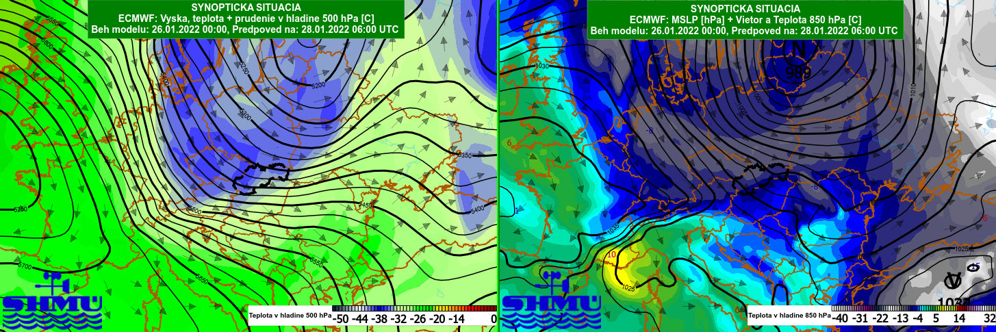 Obr. 6: Predpoveď výšky, teploty vzduchu a prúdenia v hladine 500 (cca 5500 m. n. m.) a 850 hPa (cca 1400 - 1500 m n. m.) na 28.1.2022 6:00 UTC.