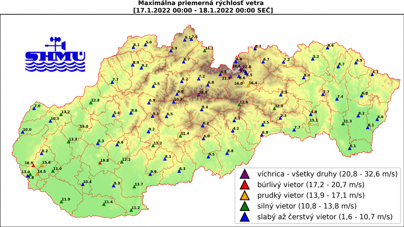 Obr. 1: Najvyššia priemerná rýchlosť vetra (10-minútový kĺzavý priemer) na území Slovenska dňa 17.1.2022.