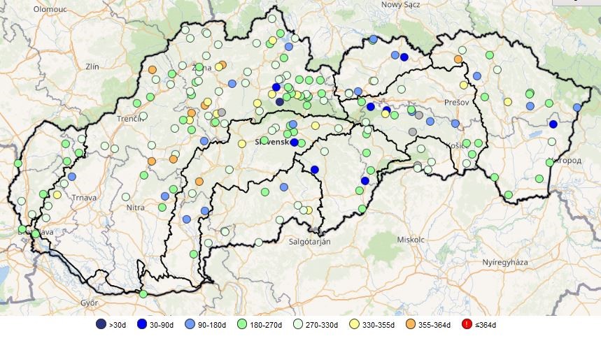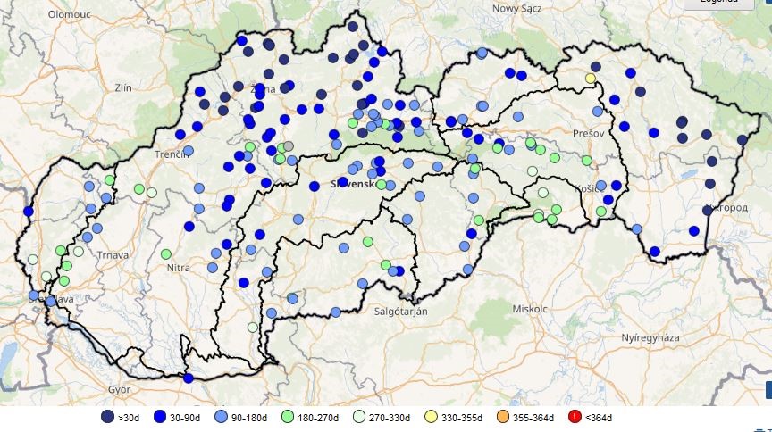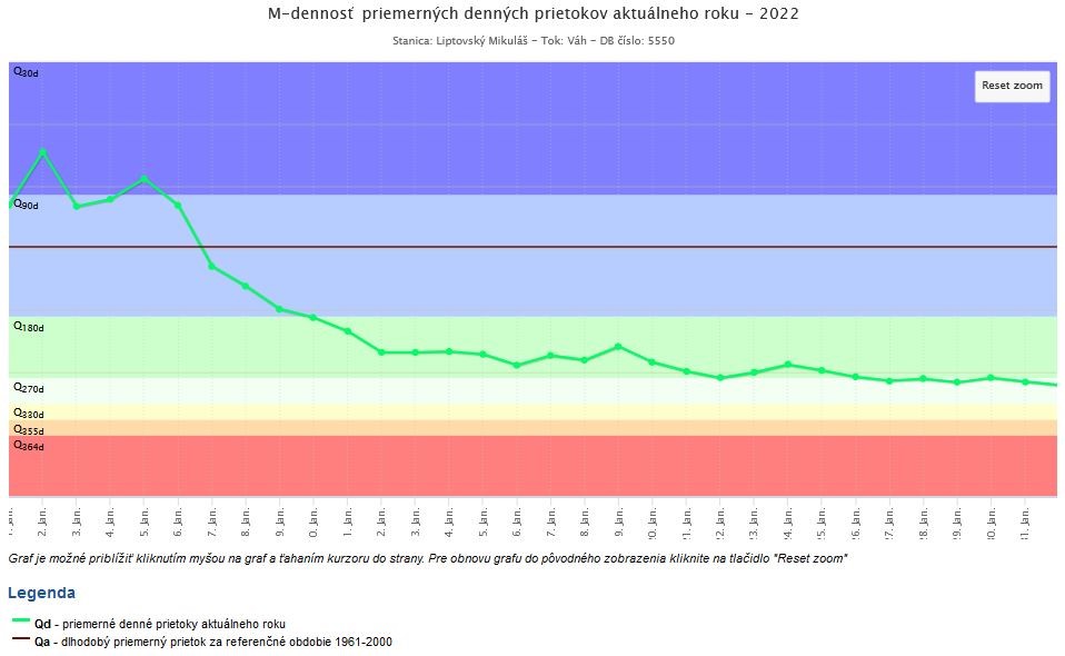* Poznámka: M-denný prietok predstavuje priemerný denný prietok dosiahnutý alebo prekročený po M dní v zvolenom období. To znamená, že napríklad 355-denný prietok (Q355d) je hodnota, ktorá by v danom profile na toku mala byť menšia v priemere len 10 dní v roku (365 dní mínus 355), po zvyšné dni roka by mala byť buď rovná tejto hodnote alebo väčšia. Za hodnoty blízke minimám (obdobie sucha) považujeme najmä hodnoty odpovedajúce Q355d, Q364d.