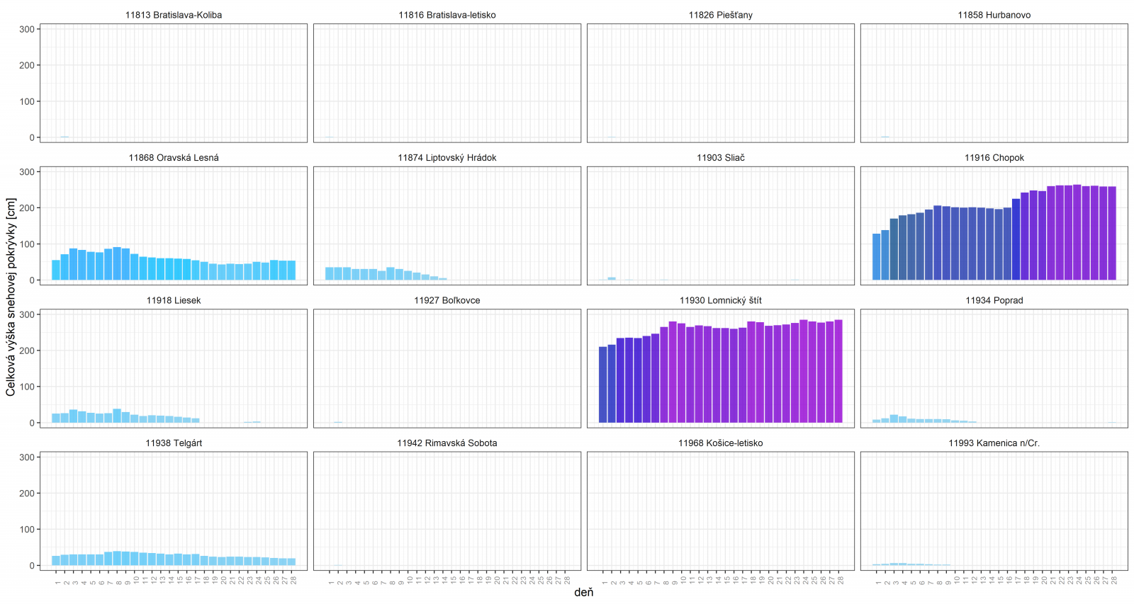 Vo vysokohorskom prostredí dochádzalo vplyvom relatívne chladnejšieho počasia a pravidelného výskytu tuhých zrážok k postupnému nárastu (kumulácii) celkovej výšky snehovej pokrývky. Napríklad, na meteorologickej stanici na Lomnickom štíte sme zaznamenali najvyššie hodnoty celkovej snehovej pokrývky v dňoch 24. a 28.2. (285 cm), na stanici Chopok to bolo dňa 24.2. (264 cm). Časový vývoj celkovej výšky snehovej pokrývky aj na ďalších meteorologických staniciach v priebehu februára je zobrazený na Obr. 6 (vpravo).