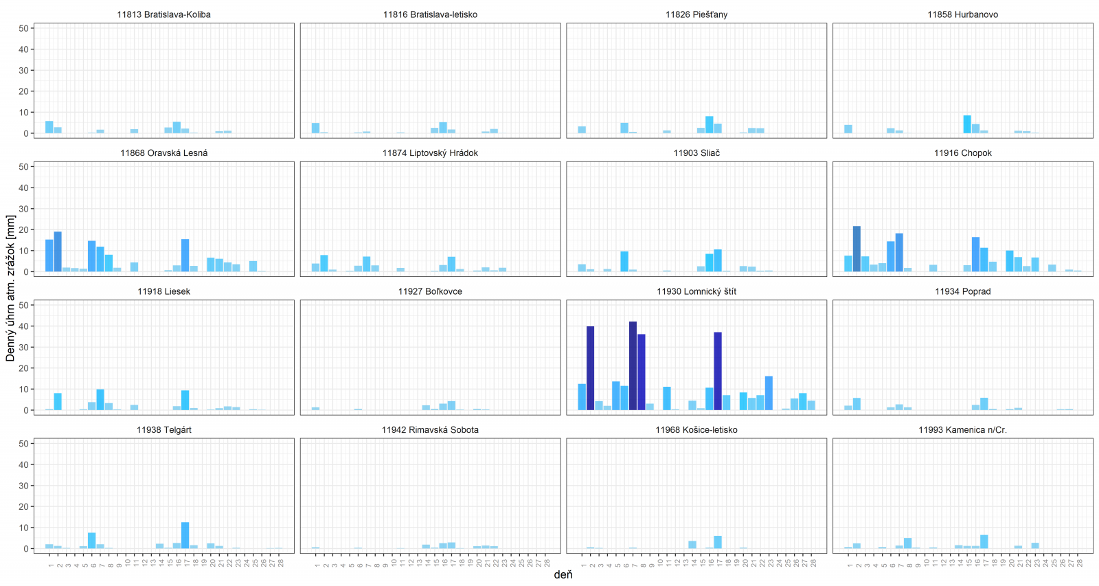 Mesačný úhrn zrážok bol vo februári prevažne v intervale od 20 do 60 mm, výrazne viac zrážok sme zaznamenali v horských a vysokohorských polohách stredného Slovenska, pričom v týchto oblastiach významne dominovali v priebehu uplynulého mesiaca tuhé zrážky – sneženie. Najnižší mesačný úhrn zrážok bol 5,1 mm v Lenartovciach. Veľmi nízky mesačný úhrn zrážok bol aj v Štrkovci 7,5 mm, Milhosti 8,1 mm a Hosticiach 8,9 mm. Najvyšší mesačný úhrn zrážok, mimo vysokohorských polôh, bol nameraný v obci Dolný Harmanec 127,6 mm. Nad 120 mm bol mesačný úhrn zrážok aj na zrážkomerných staniciach Oravská Lesná 127,1 mm, Donovaly 125,6 mm, Novoť 123,5 mm, Stará Bystrica 121,9 mm, Jarabá 121,7 mm a Horný Vadičov 120,9 mm. Časový vývoj denných úhrnov atmosférických zrážok na vybraných meteorologických staniciach v priebehu februára je zobrazený na Obr. 6 (vľavo).