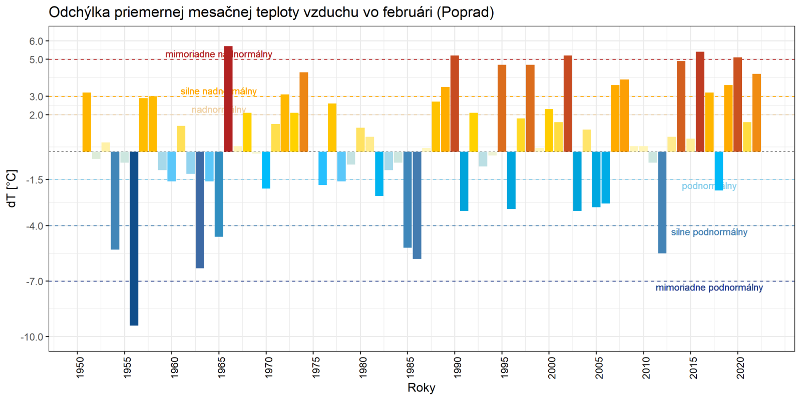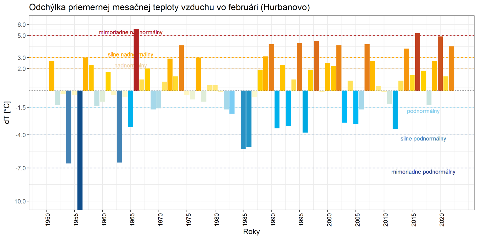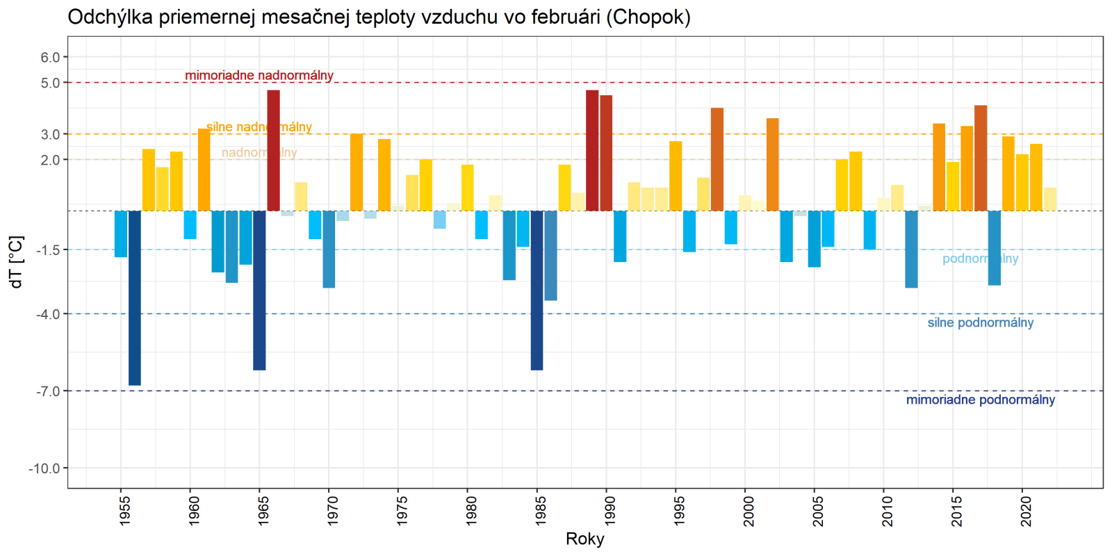 ▲ Obr. 7: Odchýlka priemernej mesačnej teploty vzduchu vo februári [°C] od normálu 1961 - 1990 na vybraných meteorologických staniciach v období rokov 1951 - 2022 (Chopok 1955 - 2022; zdroj: SHMÚ).