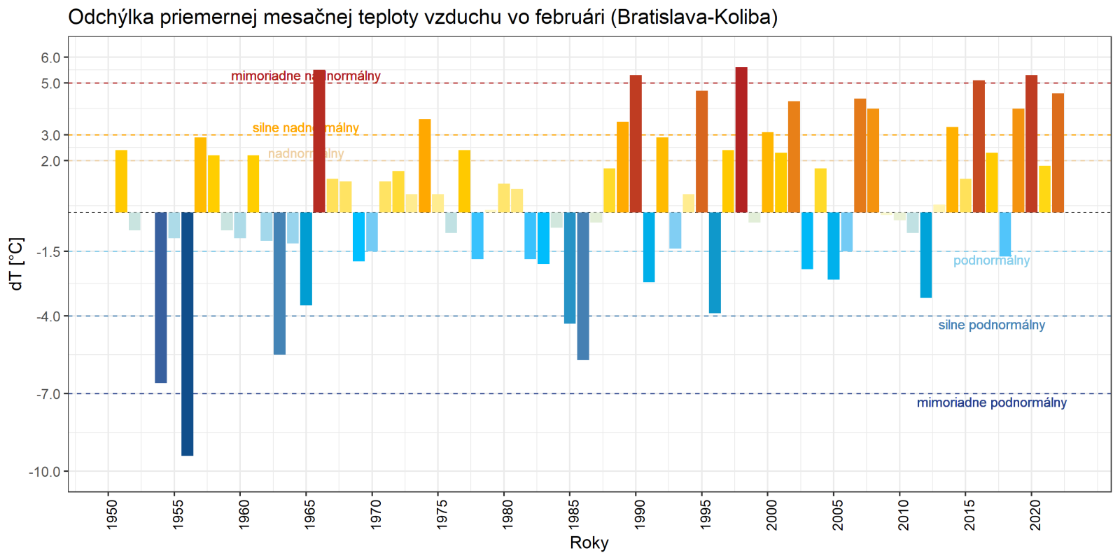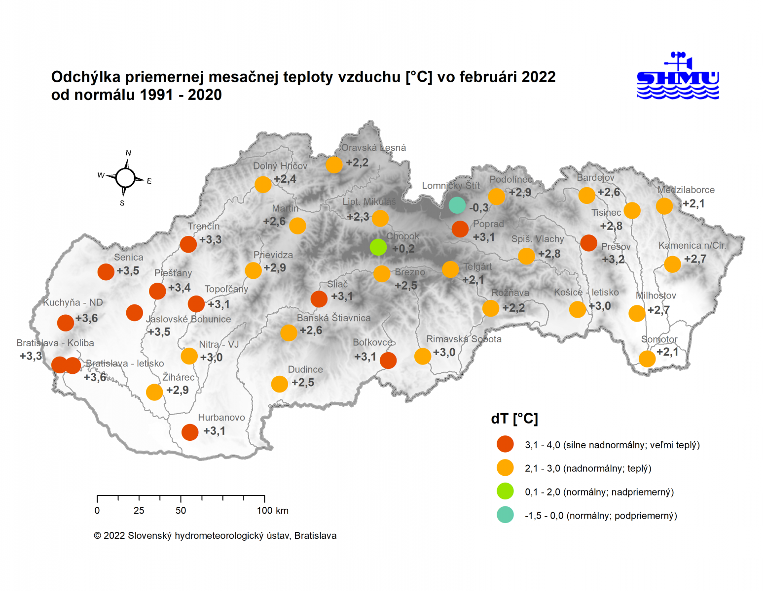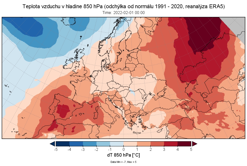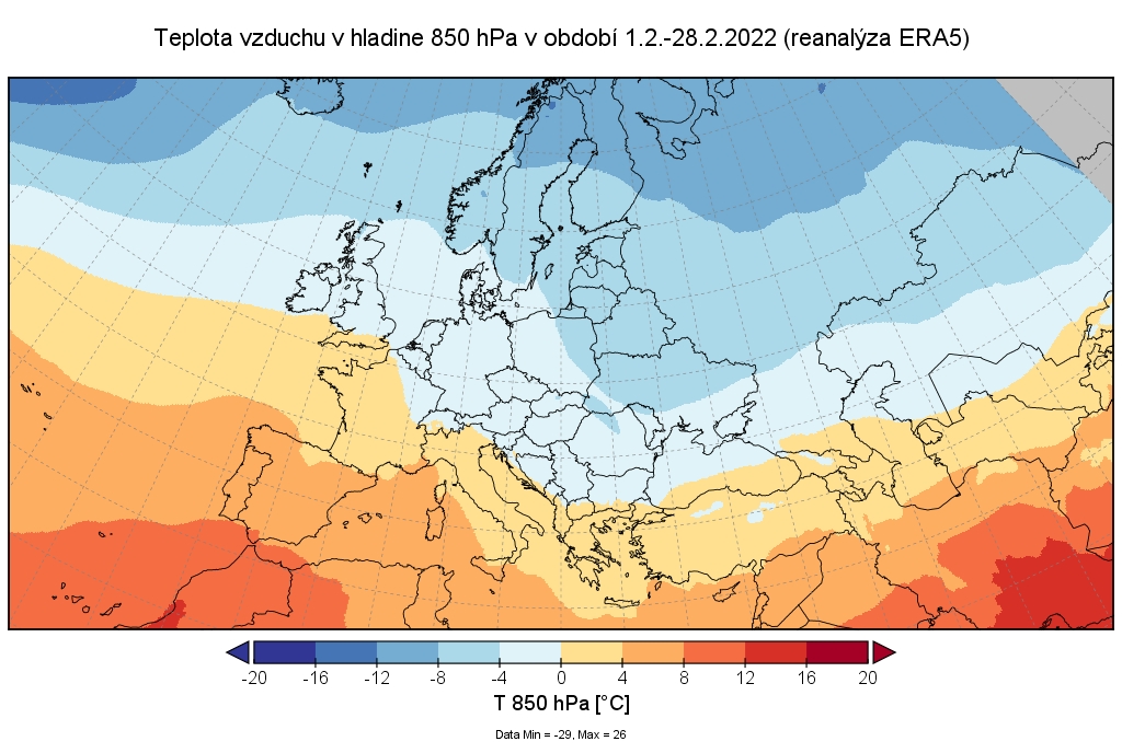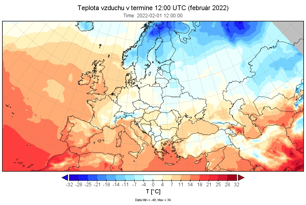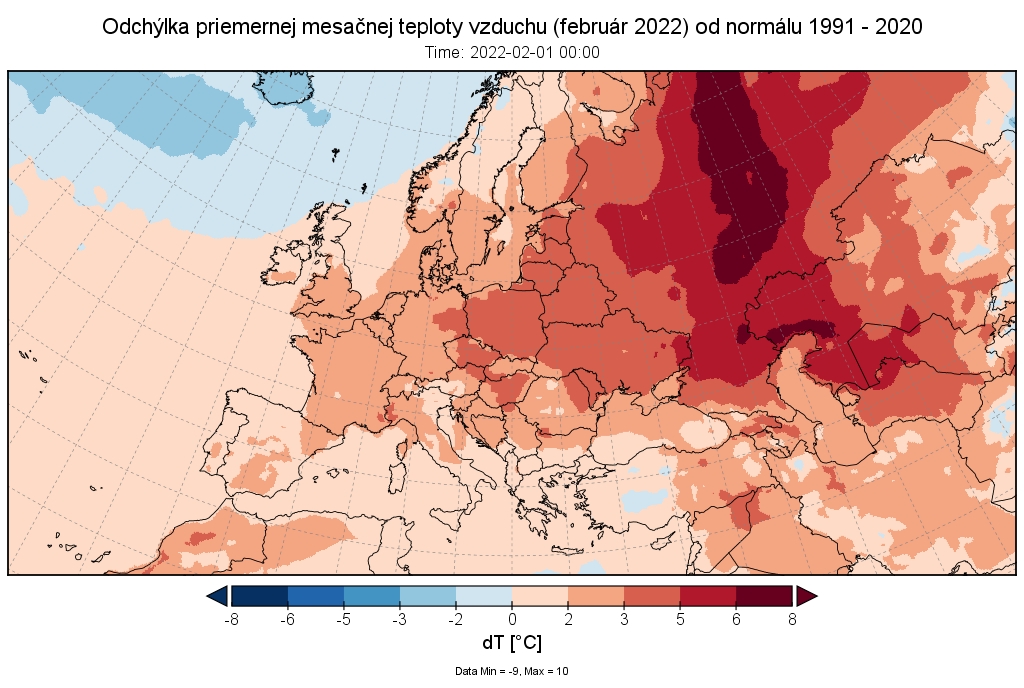 Február 2022 skončil na väčšine územia Slovenska ako teplotne nadnormálny (teplý) až silne nadnormálny (veľmi teplý), výnimkou boli len vysokohorské oblasti na strednom Slovensku, kde mesiac skončil ako teplotne normálny. Odchýlka priemernej mesačnej teploty vzduchu od normálu 1991 – 2020 bola vo februári prevažne v intervale od +2,0 do +3,5 °C, viac to bolo len na meteorologických staniciach Kuchyňa a Bratislava-letisko (+3,6 °C; podľa normálu 1981 – 2010 to bolo na letisku v Bratislave až +4,3 °C). Na vysokohorských staniciach bola odchýlka februárovej teploty vzduchu v intervale od -0,3 °C (Lomnický štít; podľa normálu 1981 – 2010 to bolo +0,6 °C) do +0,2 °C (Chopok).