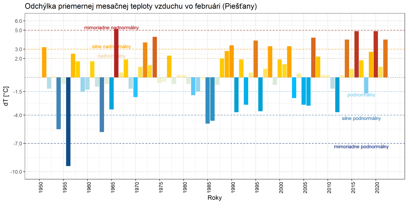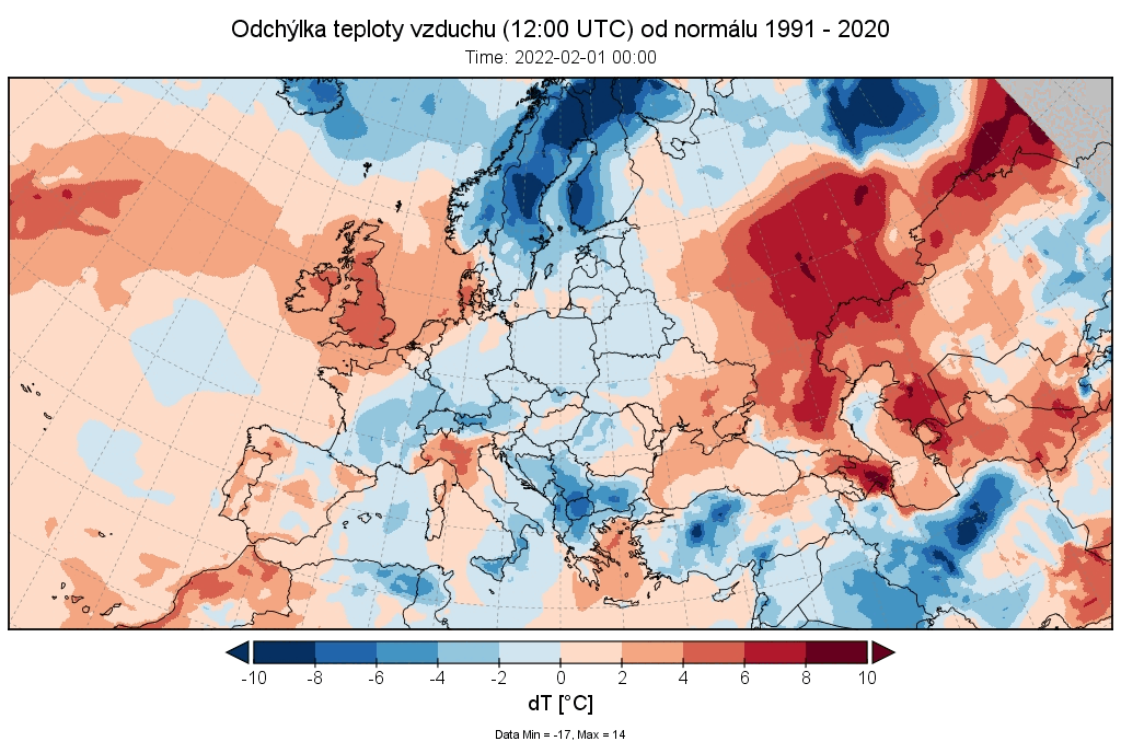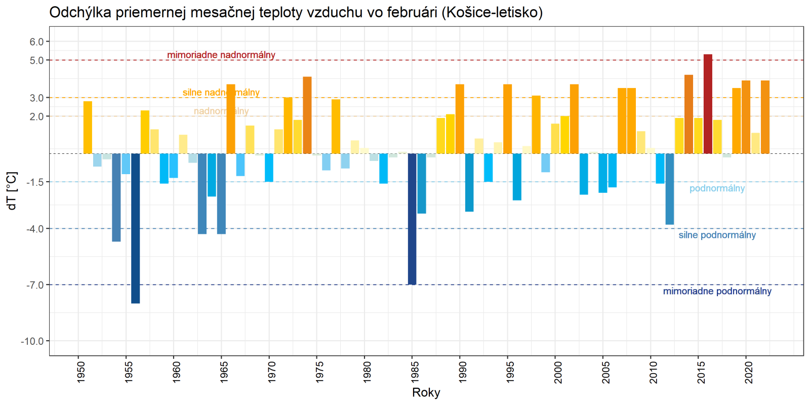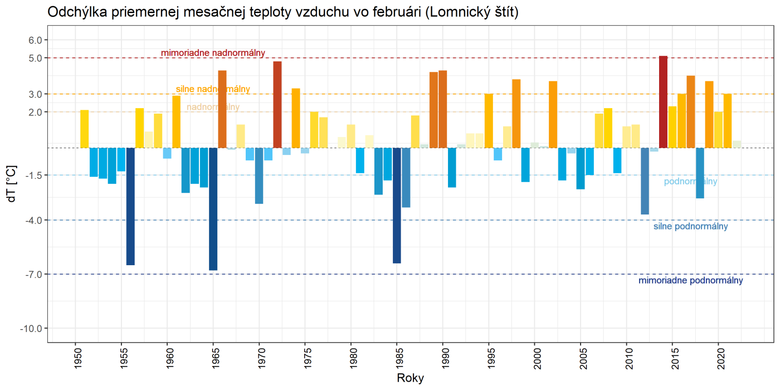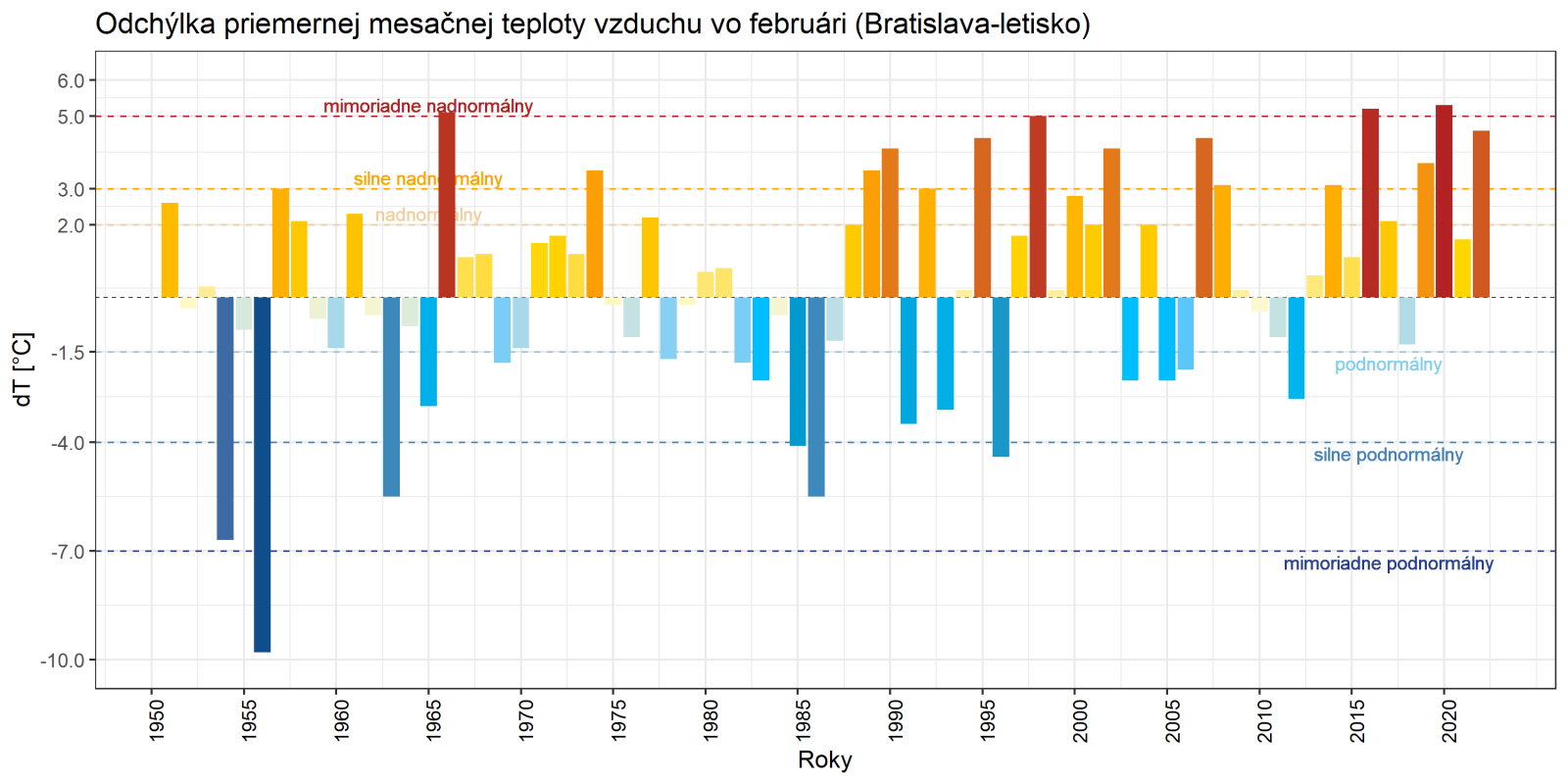 Február 2022 skončil na väčšine územia Slovenska ako teplotne nadnormálny (teplý) až silne nadnormálny (veľmi teplý), výnimkou boli len vysokohorské oblasti na strednom Slovensku, kde mesiac skončil ako teplotne normálny. Odchýlka priemernej mesačnej teploty vzduchu od normálu 1991 – 2020 bola vo februári prevažne v intervale od +2,0 do +3,5 °C, viac to bolo len na meteorologických staniciach Kuchyňa a Bratislava-letisko (+3,6 °C; podľa normálu 1981 – 2010 to bolo na letisku v Bratislave až +4,3 °C). Na vysokohorských staniciach bola odchýlka februárovej teploty vzduchu v intervale od -0,3 °C (Lomnický štít; podľa normálu 1981 – 2010 to bolo +0,6 °C) do +0,2 °C (Chopok).