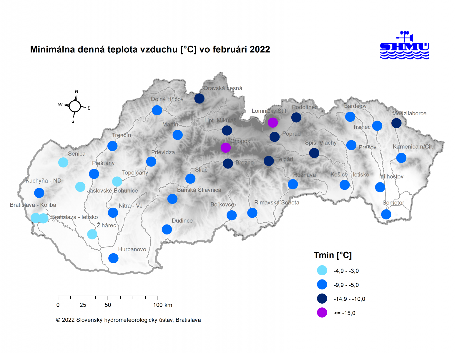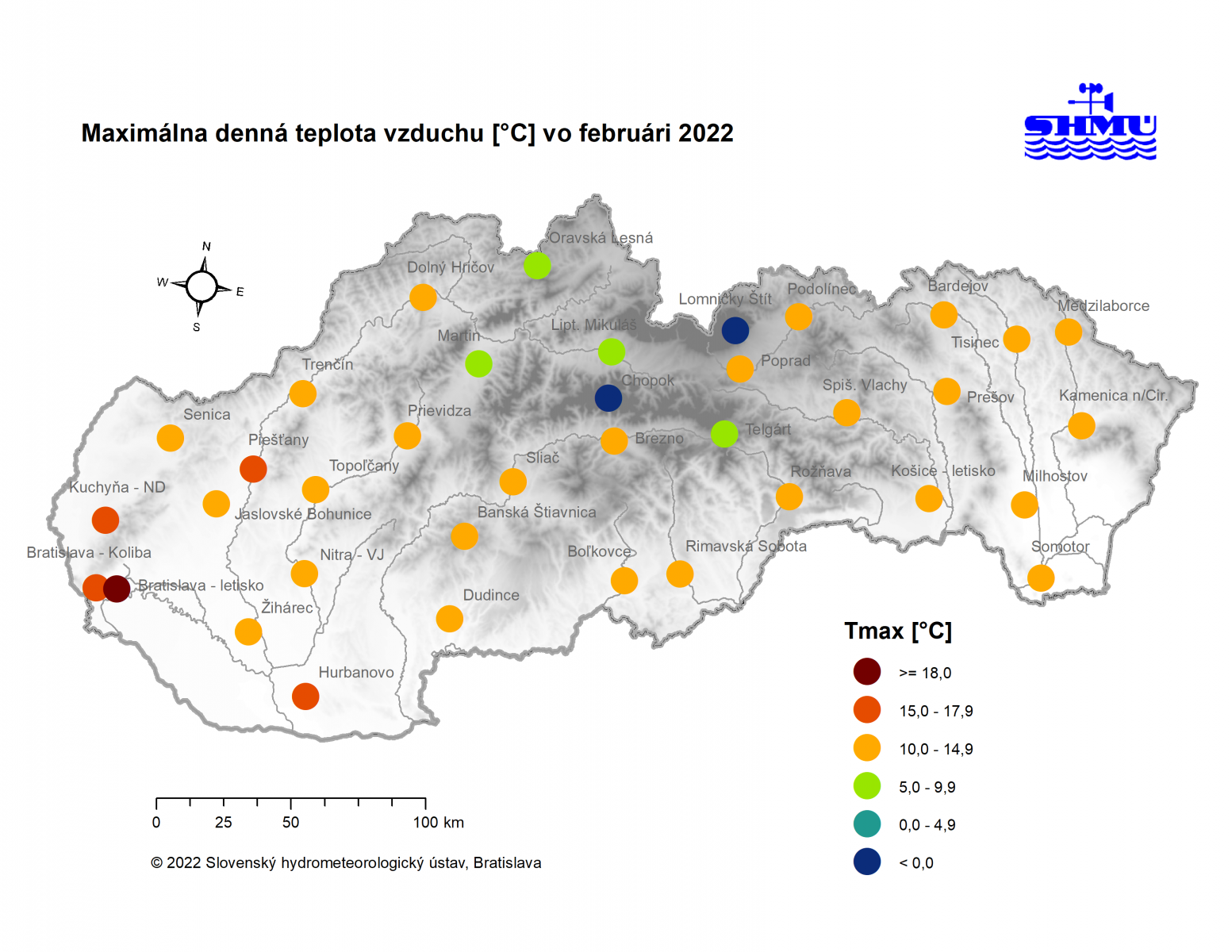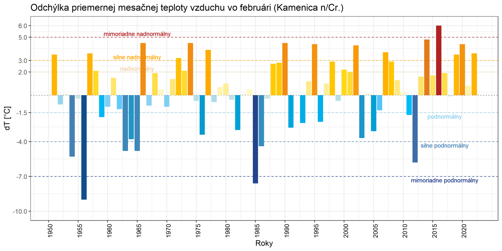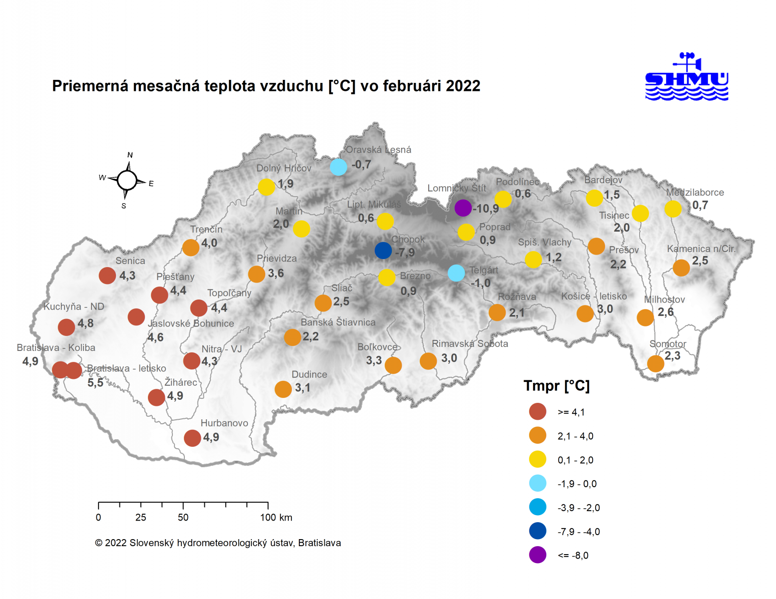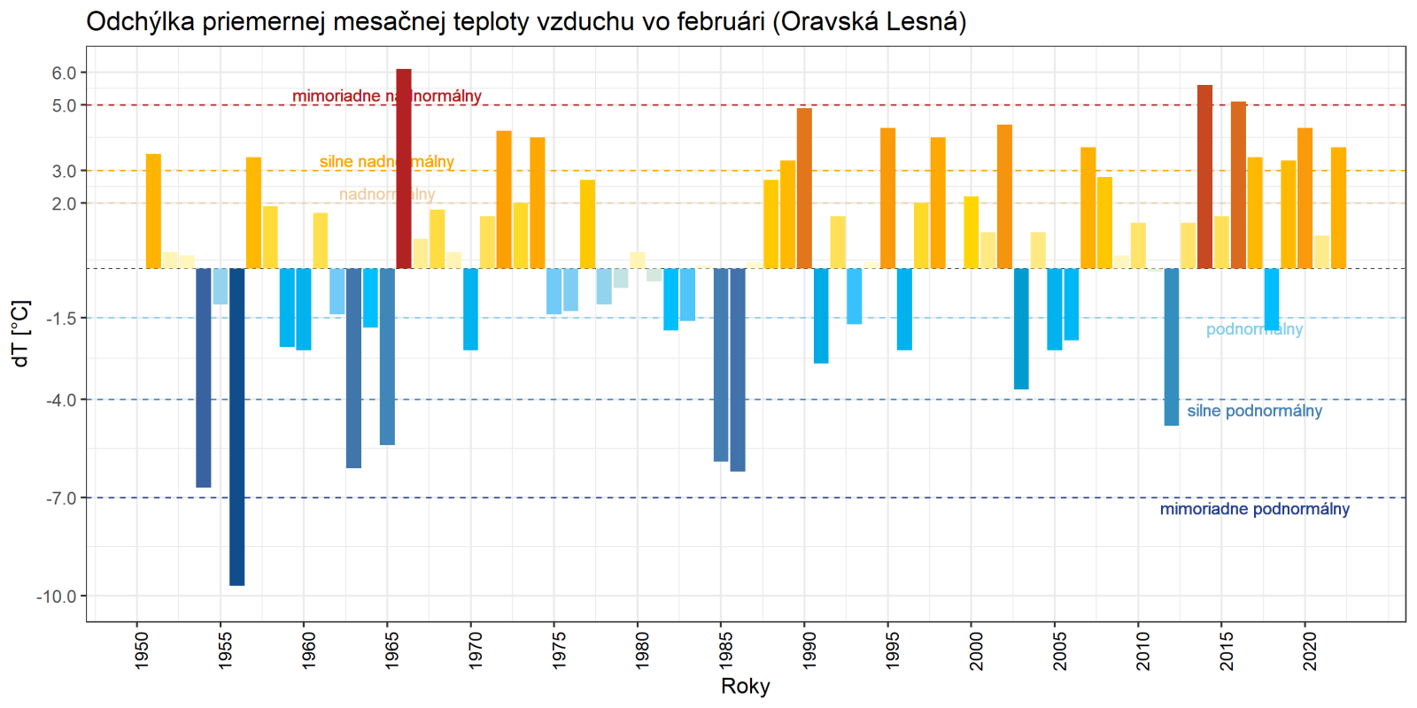 Február 2022 skončil na väčšine územia Slovenska ako teplotne nadnormálny (teplý) až silne nadnormálny (veľmi teplý), výnimkou boli len vysokohorské oblasti na strednom Slovensku, kde mesiac skončil ako teplotne normálny. Odchýlka priemernej mesačnej teploty vzduchu od normálu 1991 – 2020 bola vo februári prevažne v intervale od +2,0 do +3,5 °C, viac to bolo len na meteorologických staniciach Kuchyňa a Bratislava-letisko (+3,6 °C; podľa normálu 1981 – 2010 to bolo na letisku v Bratislave až +4,3 °C). Na vysokohorských staniciach bola odchýlka februárovej teploty vzduchu v intervale od -0,3 °C (Lomnický štít; podľa normálu 1981 – 2010 to bolo +0,6 °C) do +0,2 °C (Chopok).