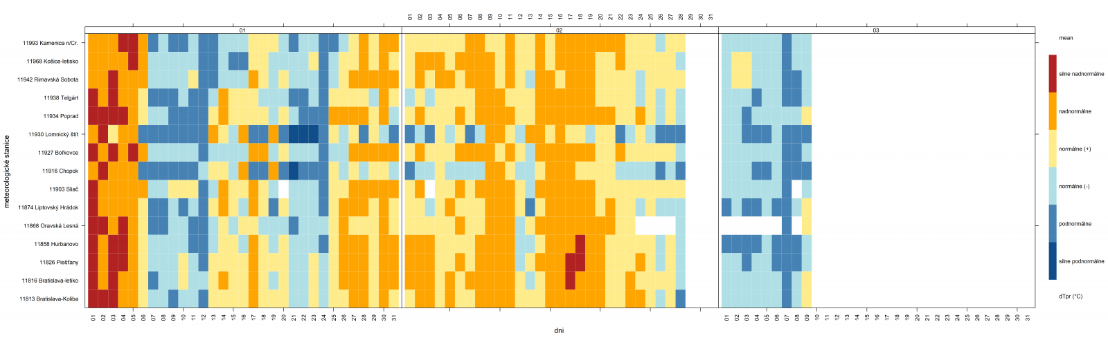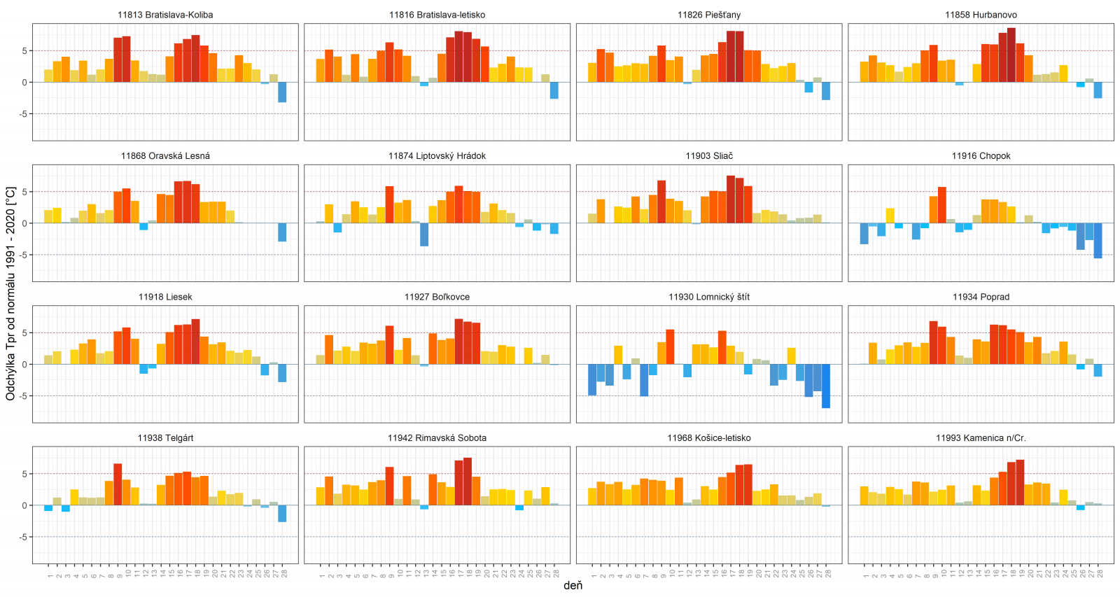 ▲ Obr. 5: Vývoj odchýlky priemernej dennej teploty vzduchu [°C] od normálu 1991 - 2020 na vybraných meteorologických staniciach na Slovensku v období v období 1.2. - 28.2.2022; v prílohe je dispozícii rastrový diagram za obdobie od 1.1. do 9.3.2022 (zdroj: SHMÚ).
