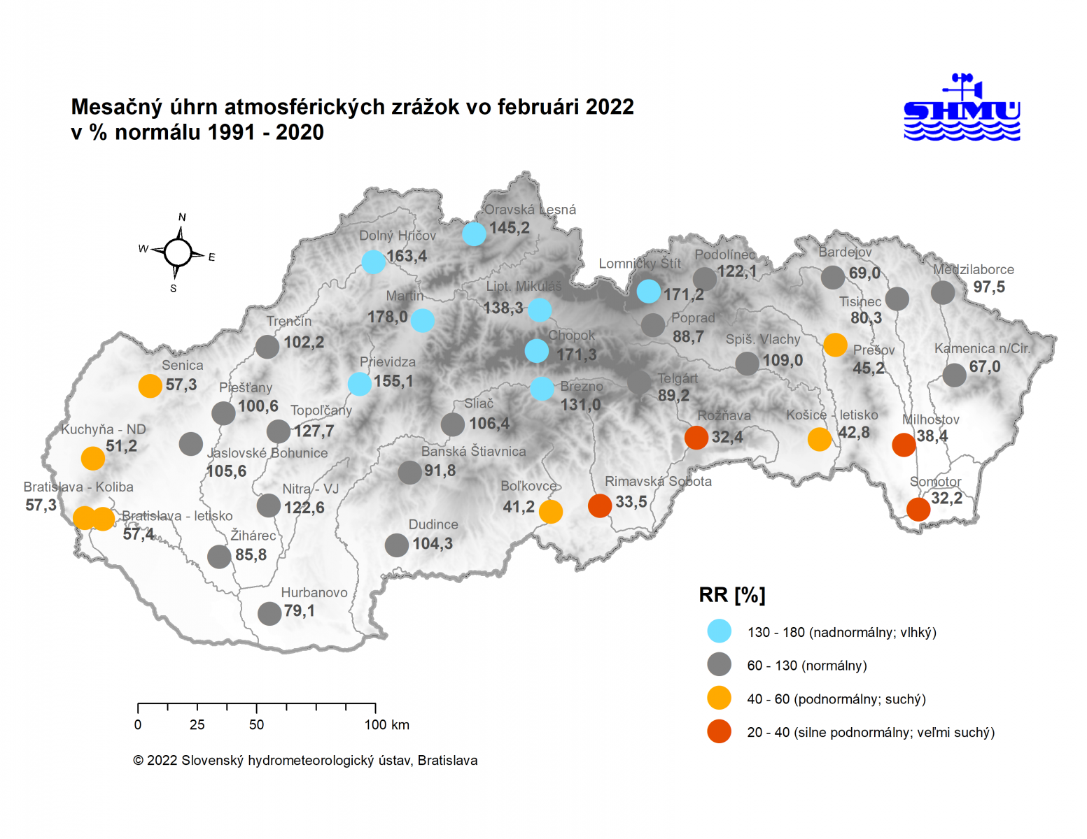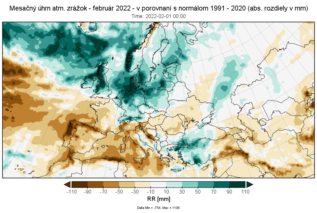 Február 2022 bol z hľadiska mesačného množstva atmosférických zrážok väčšinou normálny, na krajnom juhozápade, na Záhorí a na juhu stredného a východného Slovenska podnormálny (suchý) až silne podnormálny (veľmi suchý). Relatívne viac zrážok v porovnaní s normálom 1991 – 2020 sme zaznamenali v horských a kotlinových polohách severozápadného a severného Slovenska. Percento normálu mesačného úhrnu zrážok bolo najvyššie 178,0 % v Martine a najnižšie 32,2 % v Somotore (podľa normálu 1981 – 2010 to bolo 35,8 %).