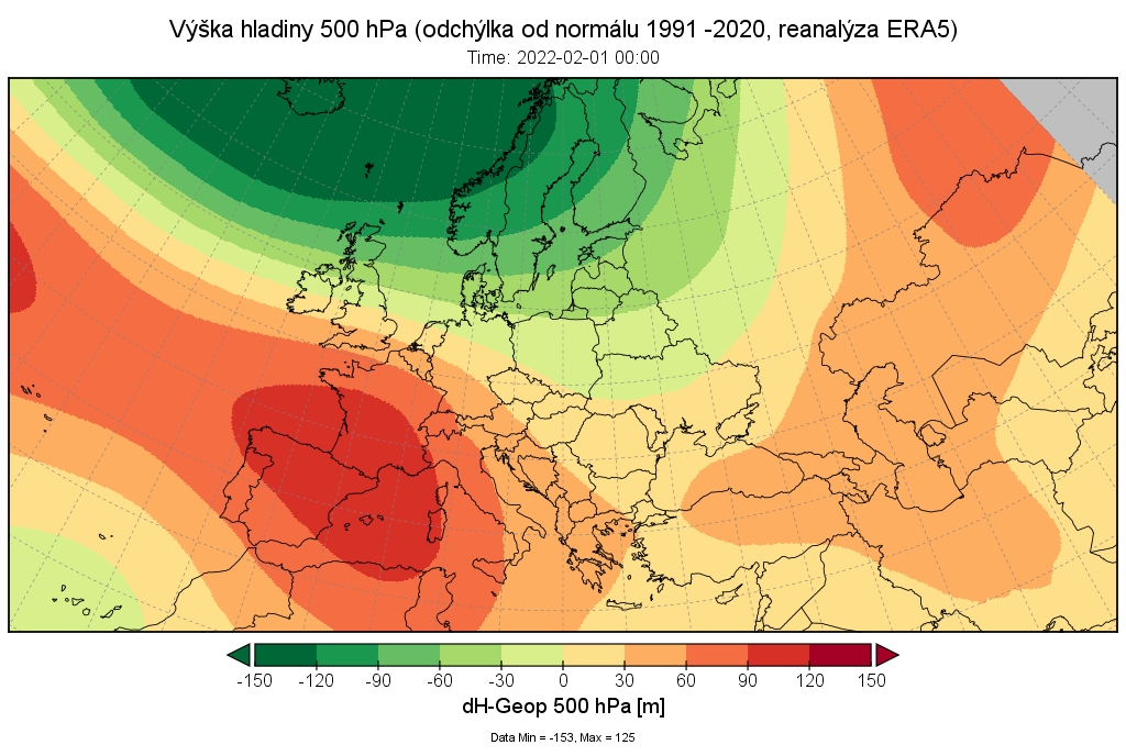 ▲ Obr. 1: Reanalýza priemernej výšky hladiny 500 hPa (vľavo - absolútne hodnoty; vpravo - odchýlka od normálu 1991 - 2020) v období 1.2. - 28.2.2022 (zdroj: ECMWF ERA5).