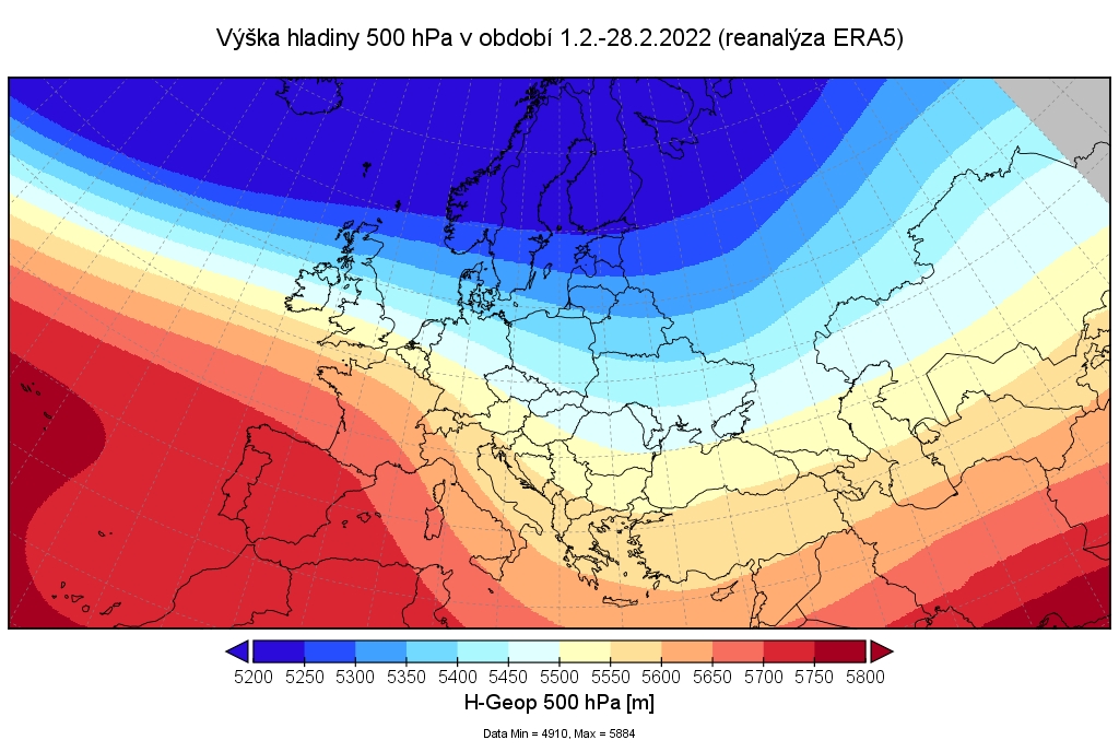 Počas mesiaca február sme zaznamenali veľkú dynamiku v atmosférickej cirkulácii. Výšková frontálna zóna sa tiahla od Severného mora nad Čiernomorskú oblasť. V oblasti Baltského mora sa počas mesiaca február prehĺbilo viacero tlakových níží. Za jednotlivými frontami alebo frontálnymi systémami sa k nám prechodne rozšírili od juhozápadu až západu výbežky vyššieho tlaku vzduchu alebo sa k nám presunula aj tlaková výš.
