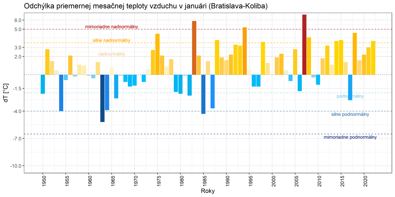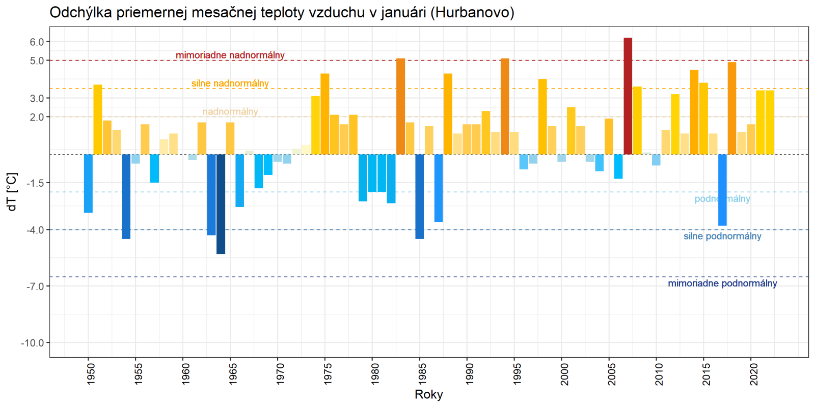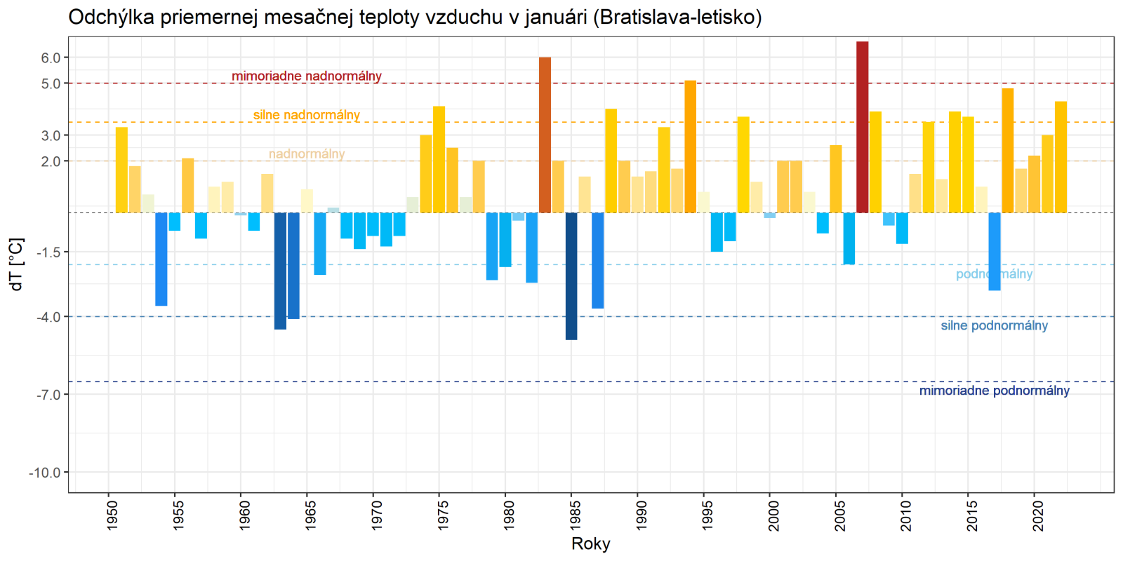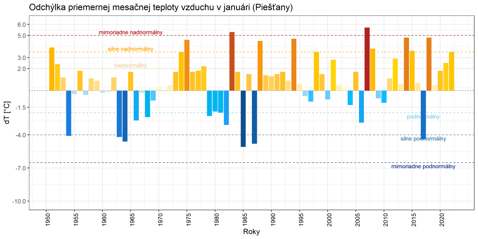 Na väčšine územia Slovenska skončil január 2022 ako teplotne normálny, výnimkou bolo len územie západného Slovenska, kde bol mesiac teplotne nadnormálny (teplý). Odchýlka priemernej mesačnej teploty vzduchu od normálu 1991 – 2020 bola v januári väčšinou v intervale od +1,0 do +2,0 °C, relatívne chladnejšie bolo v niektorých oblastiach na východnom Slovensku (napr.: Medzilaborce +0,5 °C, Kamenica n/Cr., Telgárt alebo Somotor +0,6 °C). Odchýlka vyššia ako +2,0 °C bola prevažne na území západného Slovenska a lokálne aj na Pohroní. Najvyššia odchýlka priemernej mesačnej teploty vzduchu od normálu 1991 – 2020 bola +2,6 °C na meteorologickej stanici Bratislava – letisko (podľa normálu 1981 – 2010 to bolo +3,2 °C, podľa normálu 1961 – 1990 to bolo až +4,3 °C). Najnižšia odchýlka teploty vzduchu bola -1,7 °C na Lomnickom štíte (podľa normálu 1981 – 2010 to bolo -1,5 °C).