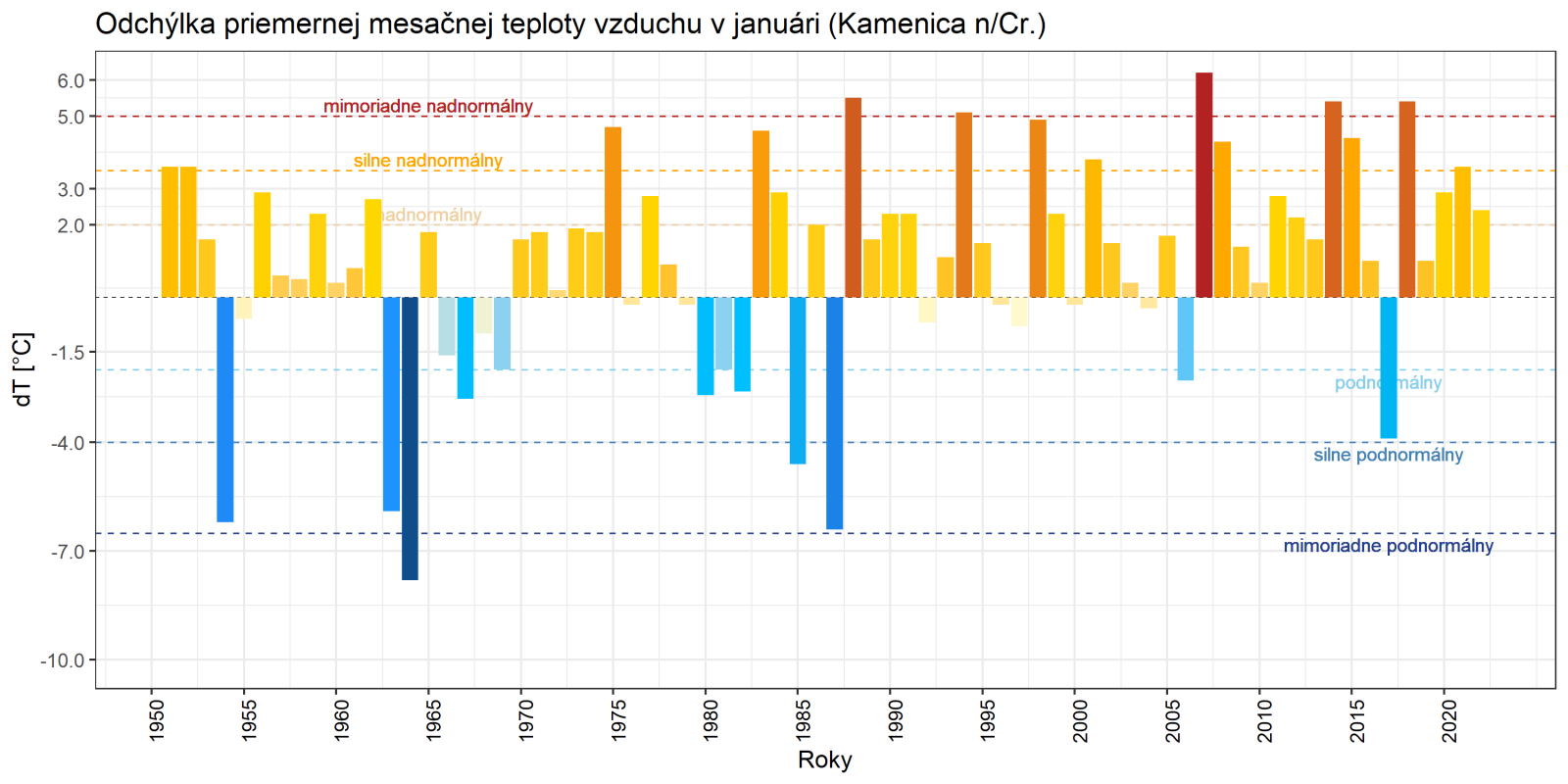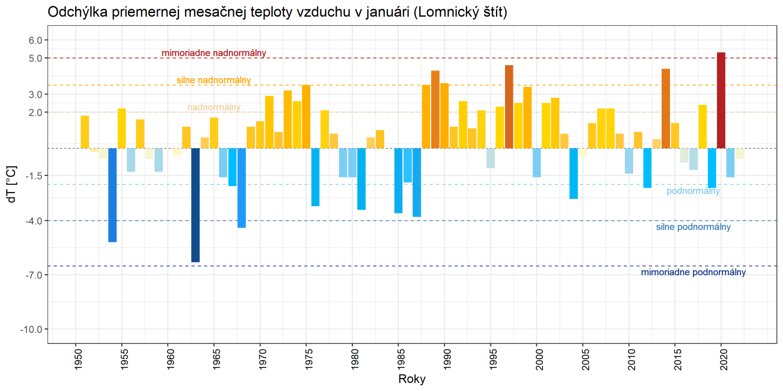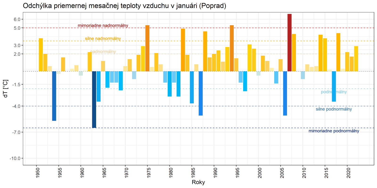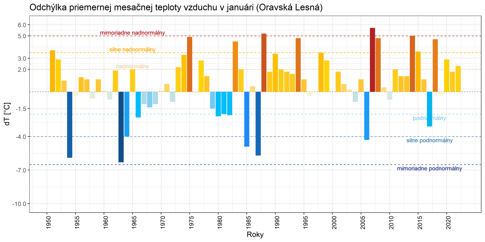 Na väčšine územia Slovenska skončil január 2022 ako teplotne normálny, výnimkou bolo len územie západného Slovenska, kde bol mesiac teplotne nadnormálny (teplý). Odchýlka priemernej mesačnej teploty vzduchu od normálu 1991 – 2020 bola v januári väčšinou v intervale od +1,0 do +2,0 °C, relatívne chladnejšie bolo v niektorých oblastiach na východnom Slovensku (napr.: Medzilaborce +0,5 °C, Kamenica n/Cr., Telgárt alebo Somotor +0,6 °C). Odchýlka vyššia ako +2,0 °C bola prevažne na území západného Slovenska a lokálne aj na Pohroní. Najvyššia odchýlka priemernej mesačnej teploty vzduchu od normálu 1991 – 2020 bola +2,6 °C na meteorologickej stanici Bratislava – letisko (podľa normálu 1981 – 2010 to bolo +3,2 °C, podľa normálu 1961 – 1990 to bolo až +4,3 °C). Najnižšia odchýlka teploty vzduchu bola -1,7 °C na Lomnickom štíte (podľa normálu 1981 – 2010 to bolo -1,5 °C).