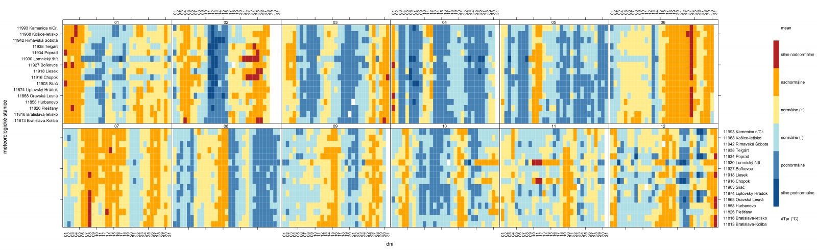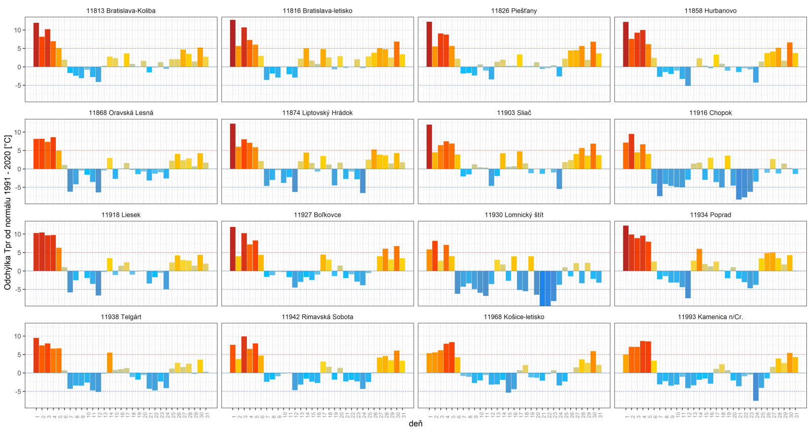 ▲ Obr. 5: Vývoj odchýlky priemernej dennej teploty vzduchu [°C] od normálu 1991 - 2020 na vybraných meteorologických staniciach na Slovensku v období v období 1.1. - 31.1.2022; v prílohe je dispozícii rastrový diagram za obdobie od 1.1.-31.12.2021 a v období 1.1.-31.1.2022 (zdroj: SHMÚ).