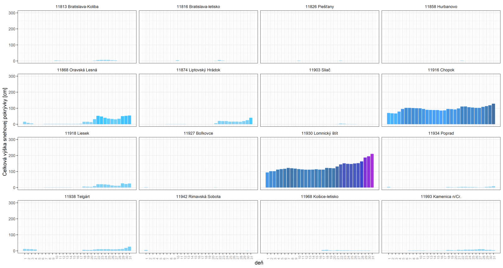 ▲ Obr. 6: (vľavo) Denný úhrn atmosférických zrážok [mm] a (vpravo) vývoj celkovej výšky snehovej pokrývky [cm] na vybraných meteorologických staniciach na Slovensku v období v období 1.1. - 31.1.2022 (zdroj: SHMÚ).