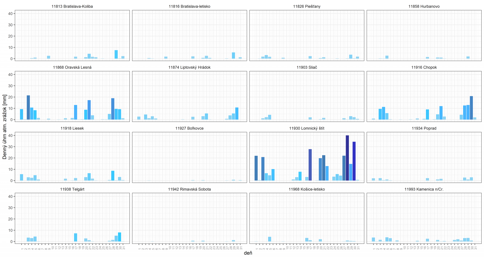 Najnižší mesačný úhrn zrážok bol 1,2 mm v Lenartovciach. Veľmi nízky úhrn zrážok bol aj v Ožďanoch 1,5 mm, Boľkovciach 1,8 mm, Štrkovci 2,3 mm a Skerešove 2,4 mm. Najvyšší mesačný úhrn zrážok bol nameraný v obci Mútne 151,5 mm. Nad 120 mm bol mesačný úhrn zrážok aj na zrážkomerných staniciach Zboj 144,9 mm, Oravská Lesná 142,2 mm a Makov 127,9 mm.