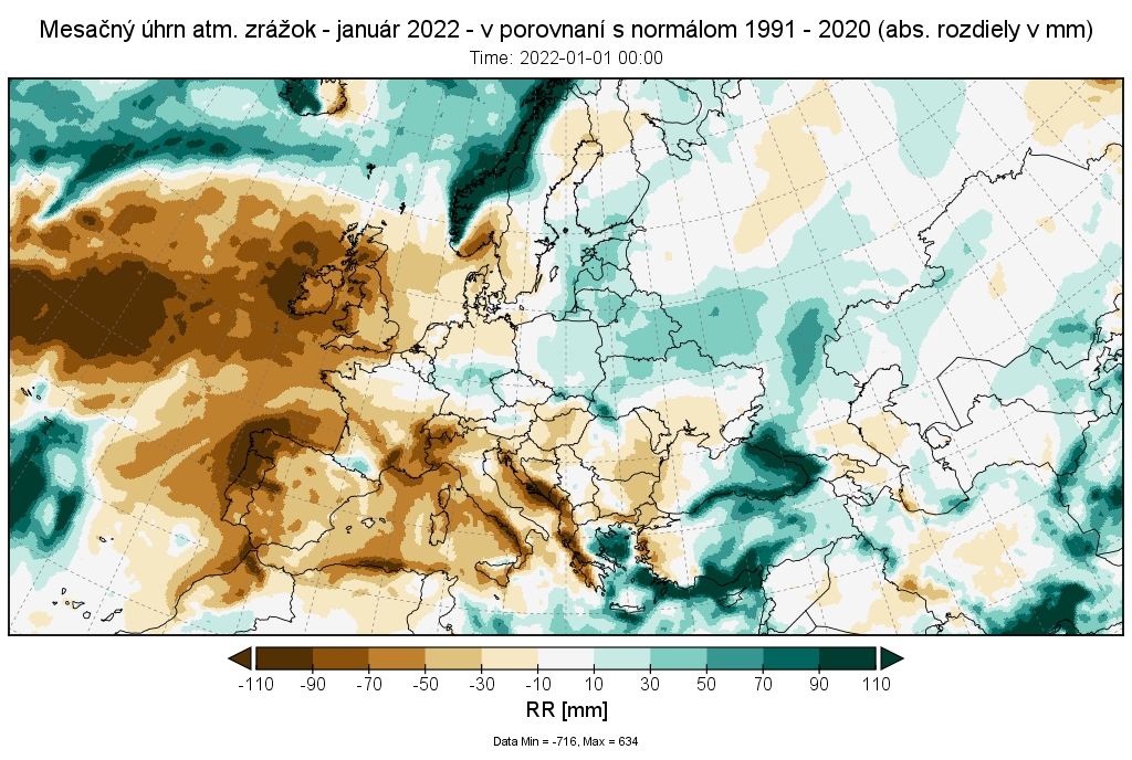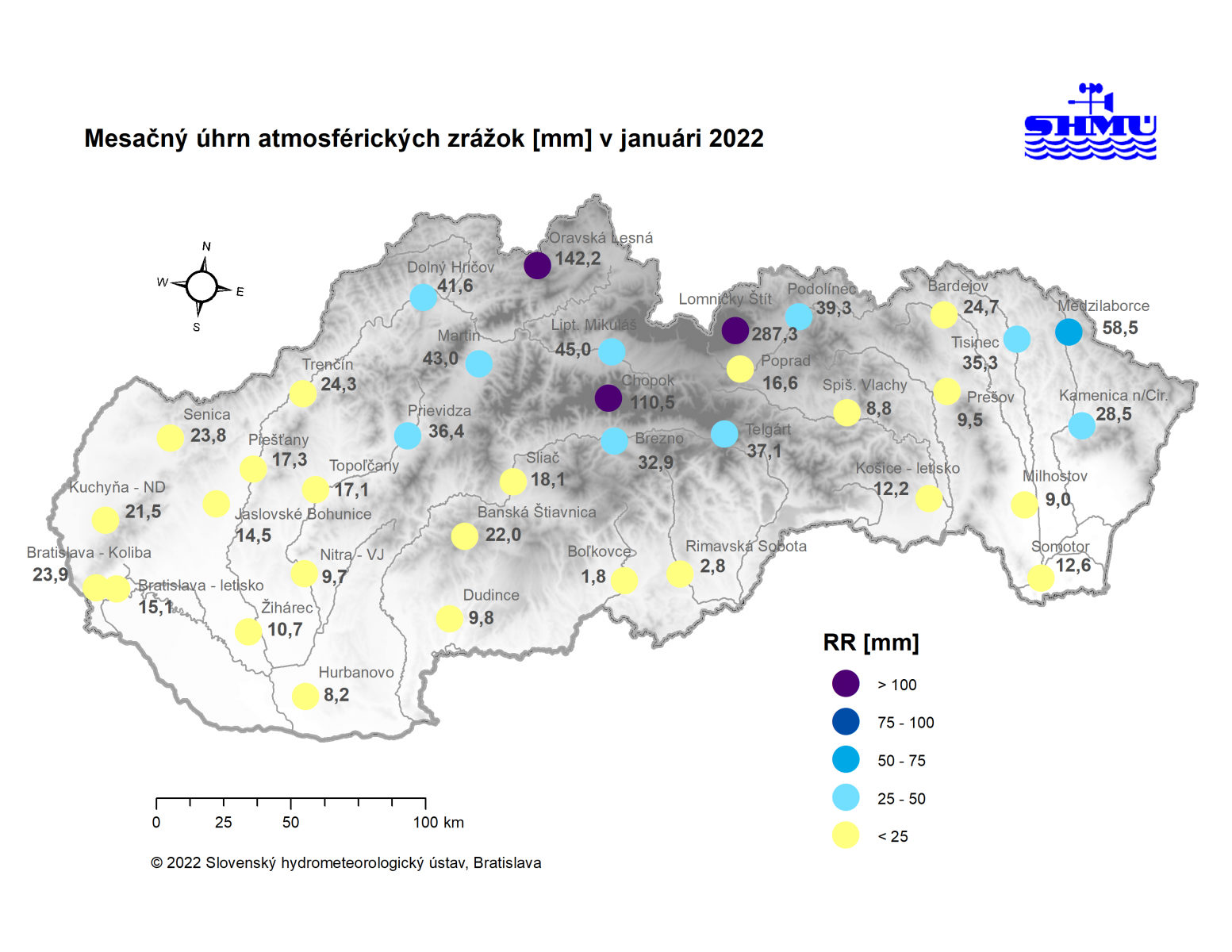 Mesačný úhrn zrážok bol v januári prevažne v intervale od 20 do 40 mm, výrazne viac zrážok sme zaznamenali v horských a vysokohorských polohách stredného Slovenska. Najvyššie mesačné úhrny zrážok sme zaznamenali na severozápade Kysúc a Oravy, v Malej a Veľkej Fatry, v Nízkych Tatrách a Tatrách a na krajnom severovýchode Slovenska, kde dosiahli na viacerých miestach 100 až 150 mm. Výrazne menej zrážok sme v priebehu januára 2022 zaznamenali na juhovýchode Podunajskej nížiny, juhu stredného Slovenska alebo na Východoslovenskej nížine, kde miestami spadlo aj menej ako 2,0 mm za celý mesiac.