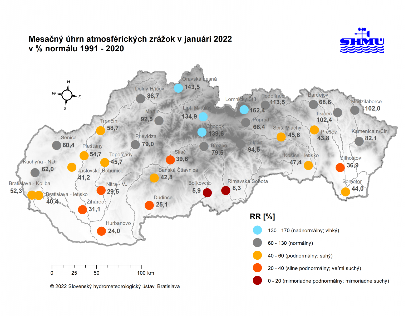 Mesačné úhrny zrážok boli v januári 2022 na území Slovenska veľmi nerovnomerne rozložené. Január bol podľa nového normálu 1991 – 2020 zrážkovo mimoriadne podnormálny (mimoriadne suchý) až nadnormálny (vlhký). Percento normálu mesačného úhrnu zrážok bolo najvyššie 143,5 % v Oravskej Lesnej (podľa normálu 1981 – 2010 to bolo 149,7 %) a najnižšie 5,9 % v Boľkovciach (podľa normálu 1981 – 2010 to bolo 6,7 %).
