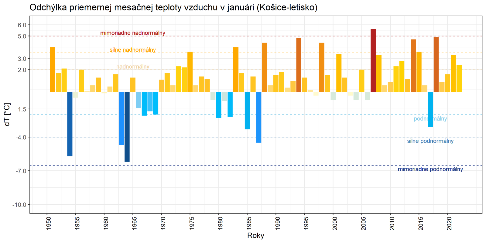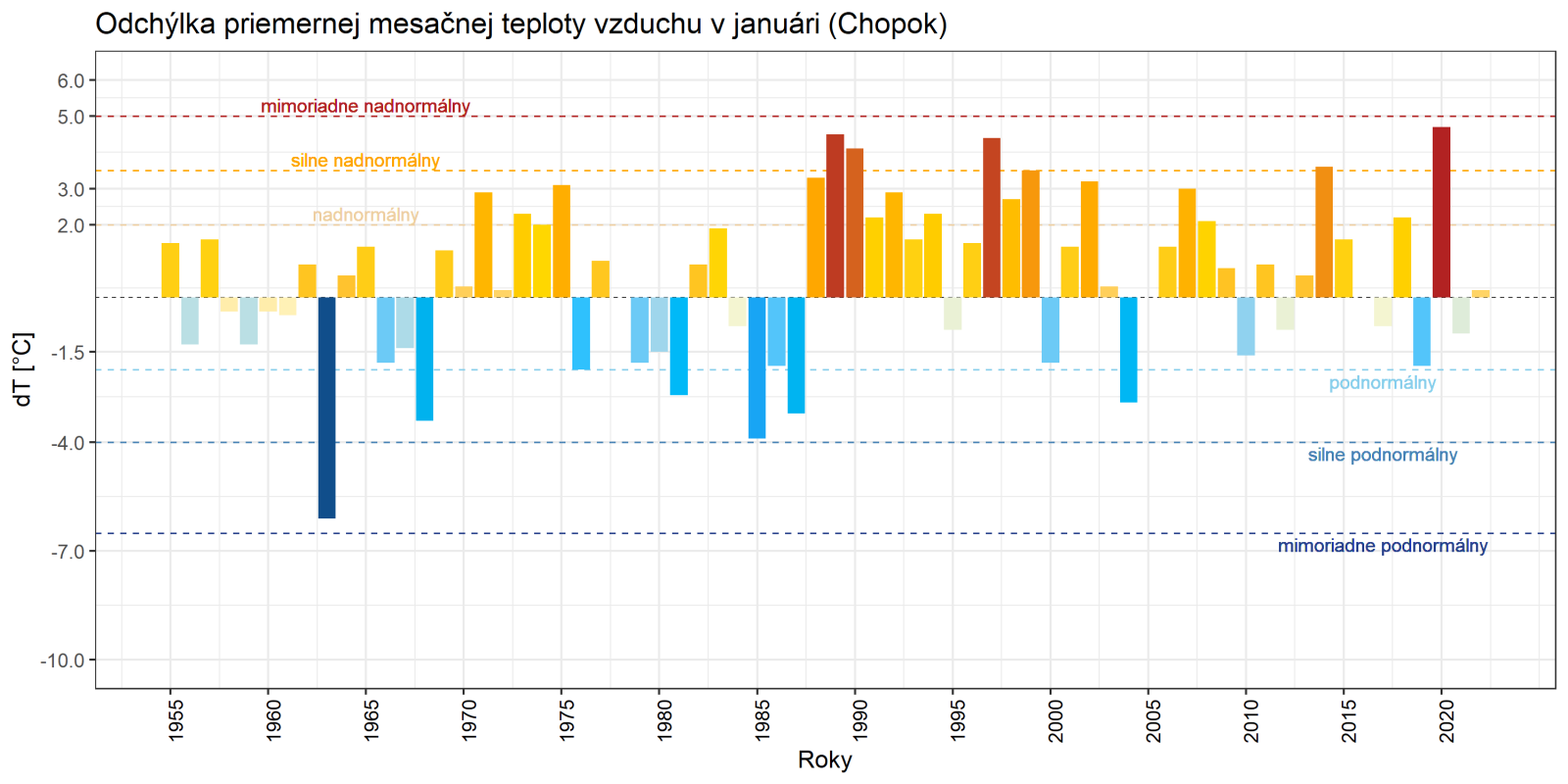 ▲ Obr. 7: Odchýlka priemernej mesačnej teploty vzduchu v januári [°C] od normálu 1961 - 1990 na vybraných meteorologických staniciach v období rokov 1951 - 2022 (Chopok 1955 - 2022; zdroj: SHMÚ).