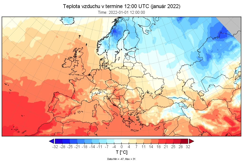 ▲ Obr. 4: (vľavo) Teplota vzduchu v úrovni 2 m v termíne 12:00 h UTC [°C] a jej odchýlka (vpravo) od normálu 1991 - 2020 v období 1.1. - 31.1.2022 na základe údajov globálnej reanalýzy ERA5 (zdroj: ECMWF).