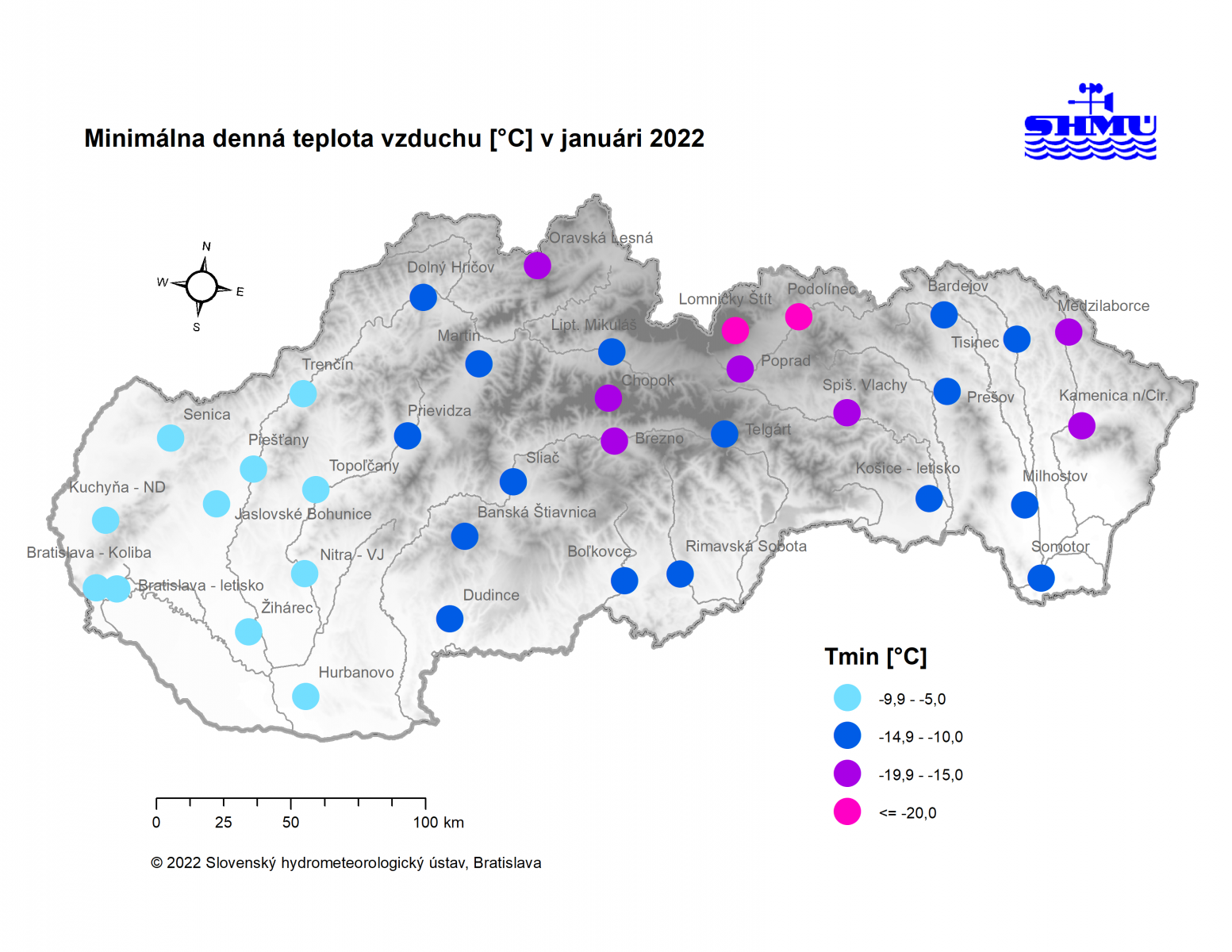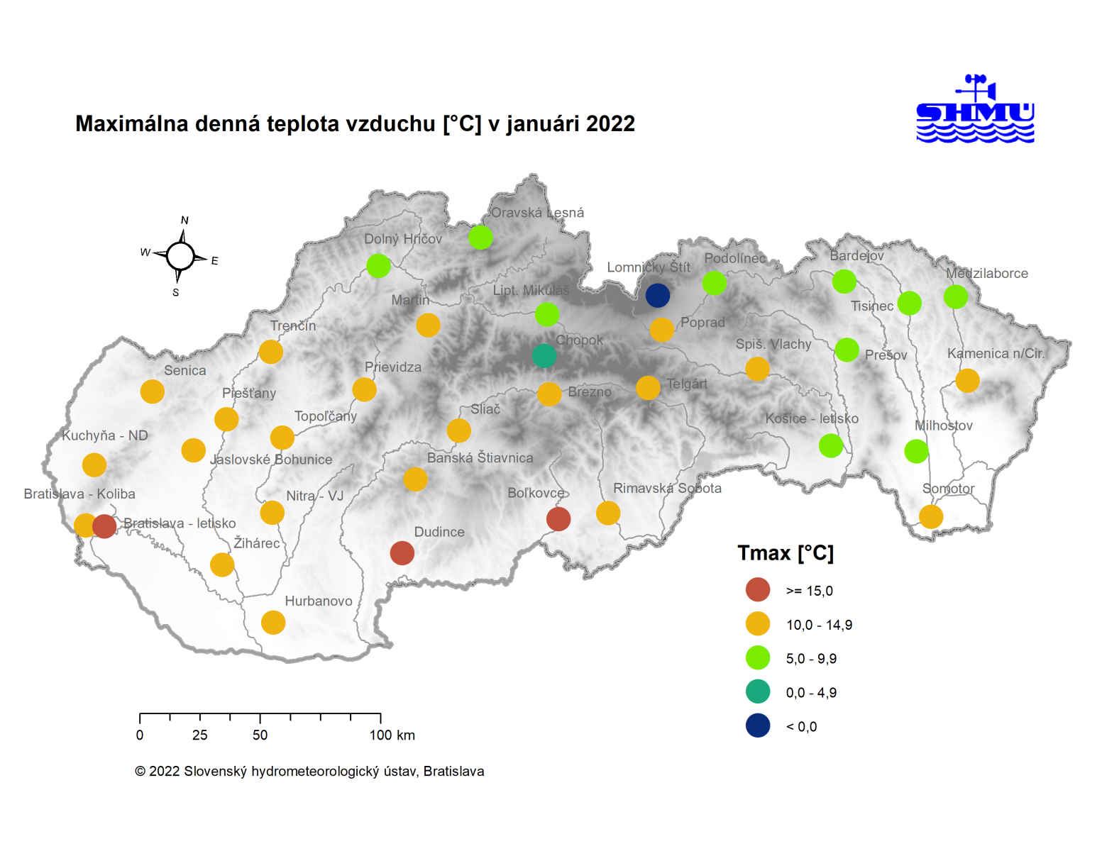 Absolútne najnižšia teplota vzduchu v polohách do 1000 m n. m. bola nameraná 24.1.2022 v Červenom Kláštore -21,6 °C (na Lomnickom štíte to bolo až -22,3 °C dňa 21.1.). Pod -20 °C klesla teplota vzduchu ešte aj v Podolínci. Absolútne najvyššia teplota vzduchu bola 16,9 °C, nameraná na zrážkomernej stanici v obci Blahová dňa 1.1. Z klimatologických staníc bola najvyššia teplota 16,0 °C na letisku v Bratislave, tiež nameraná dňa 1.1.2022.