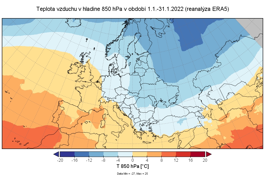 ▲ Obr. 2: Reanalýza priemernej teploty vzduchu v hladine 850 hPa (vľavo - absolútne hodnoty; vpravo - odchýlka od normálu 1991 - 2020) v období 1.1. - 31.1.2022 (zdroj: ECMWF ERA5).