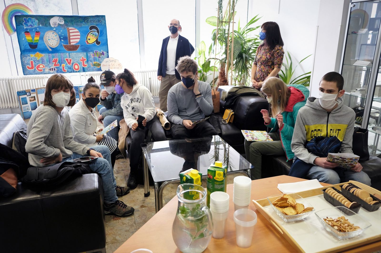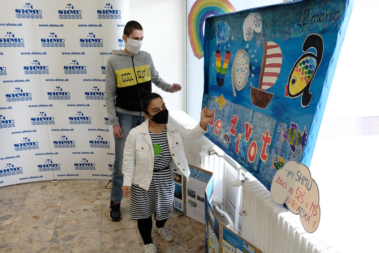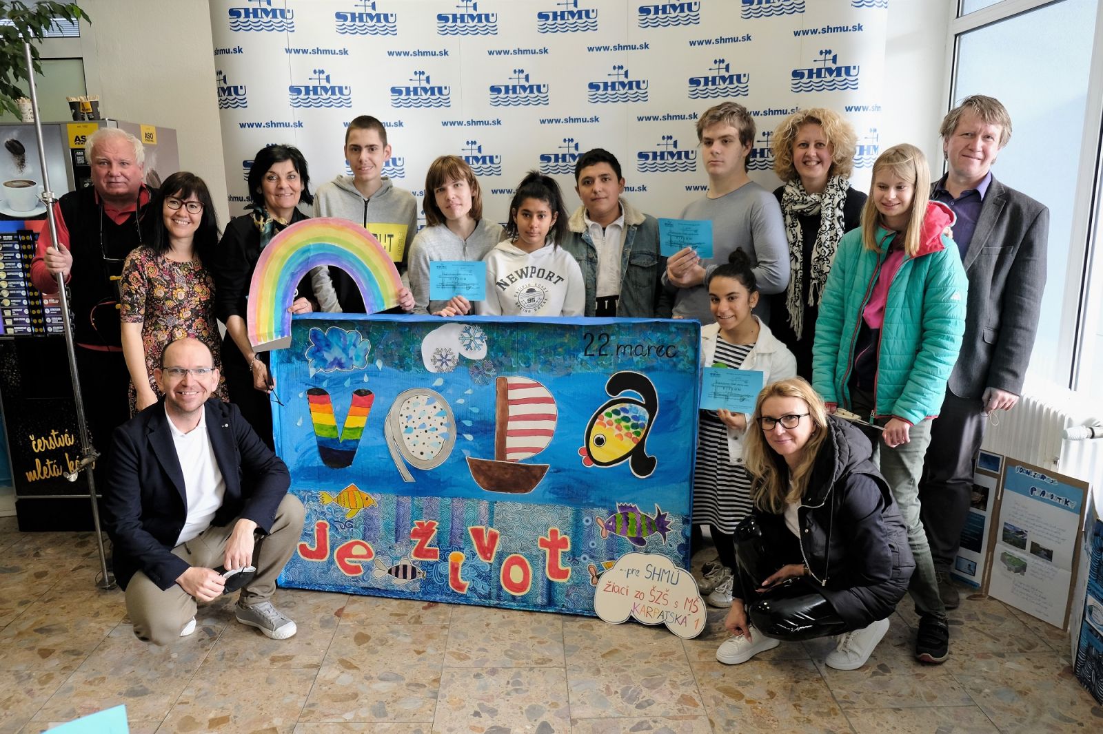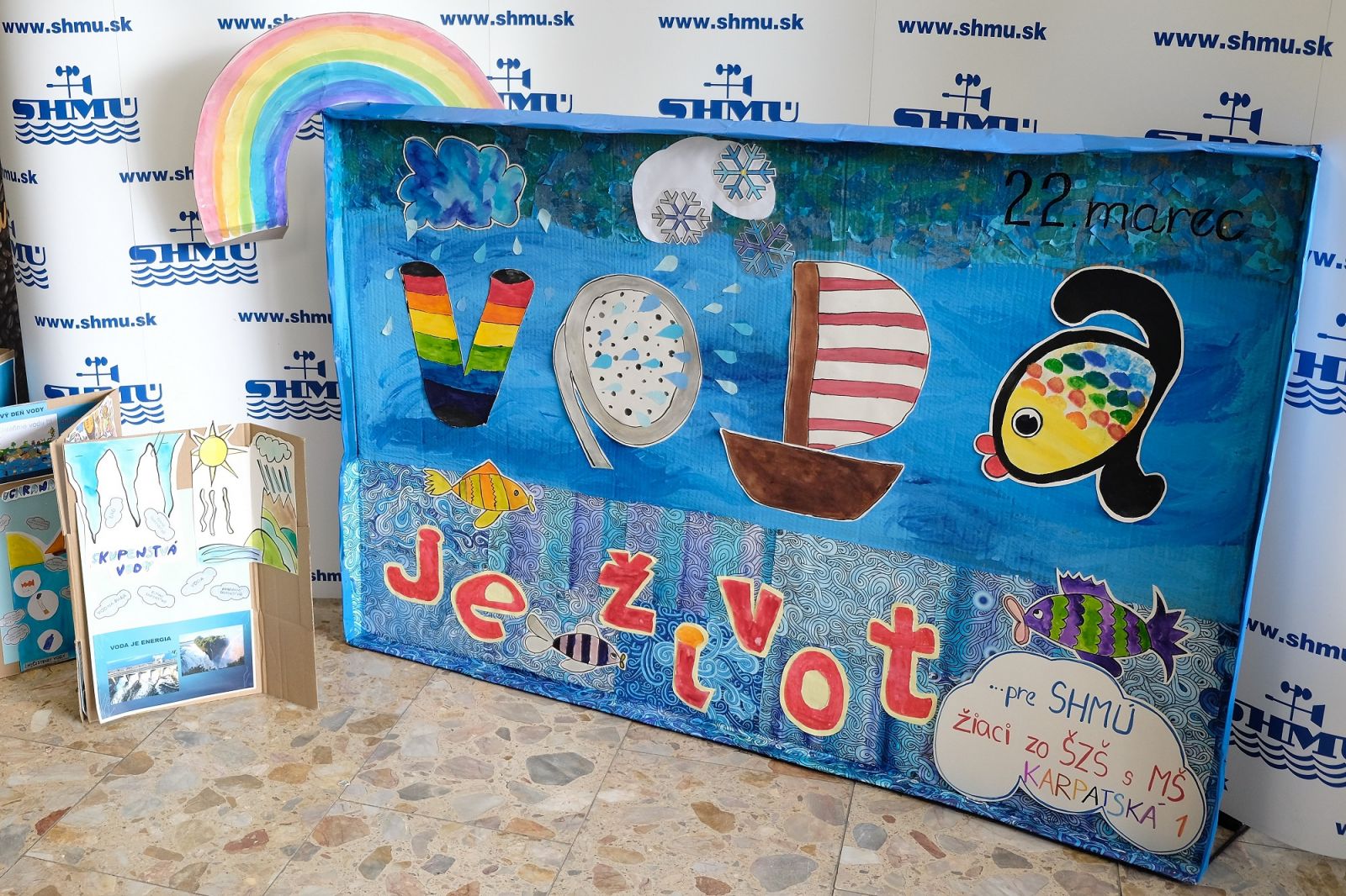 Deti zo Špeciálnej základnej školy s materskou školou na Karpatskej ulici v Bratislave nám dnes priniesli krásny dar. Pri príležitosti Svetového dňa vody namaľovali obraz - svoju predstavu o kolobehu vody v prírode a o živočíchoch, ktoré žijú v našich riekach. Ponúkame malú fotogalériu z tejto milej udalosti. Deťom - autorom diela veľmi pekne ďakujeme.