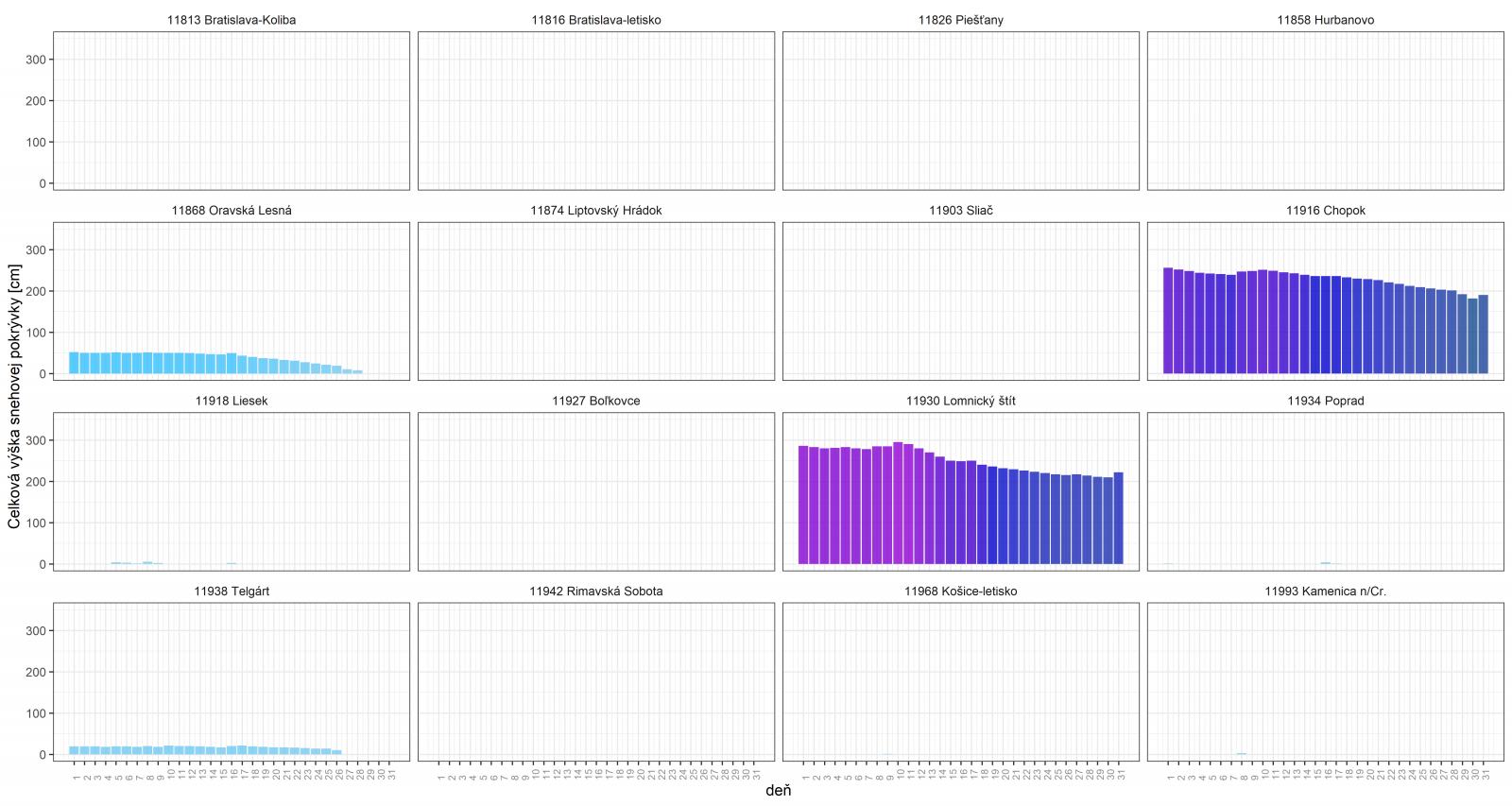 ▲ Obr. 6: (vľavo) Denný úhrn atmosférických zrážok [mm] a (vpravo) vývoj celkovej výšky snehovej pokrývky [cm] na vybraných meteorologických staniciach na Slovensku v období v období 1.3. - 31.3.2022; v prílohe je k dispozícii vývoj priemerných úhrnov zrážok v základných povodiach SR v období od 1.1 do 9.4.2022 (zdroj: SHMÚ).