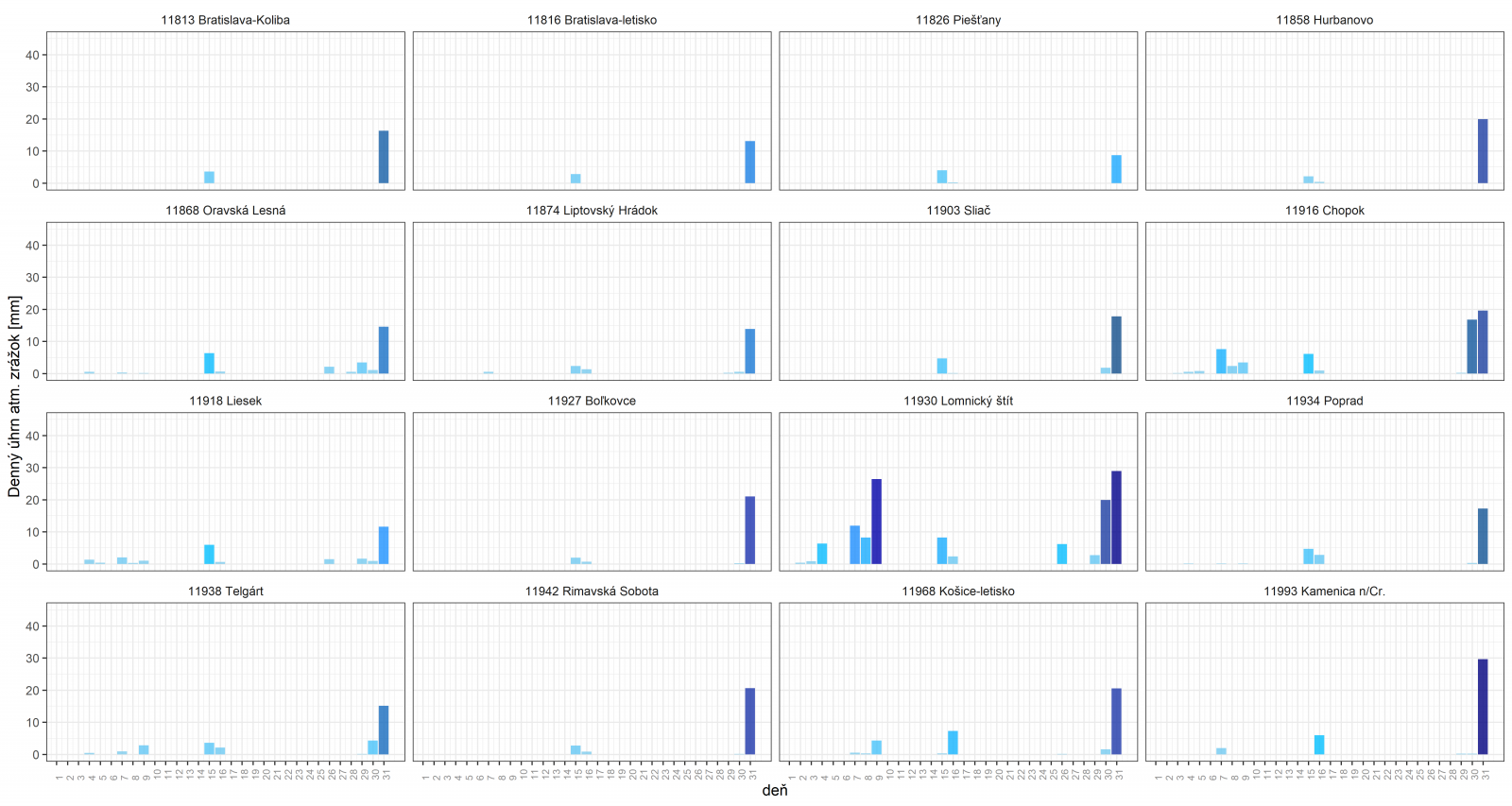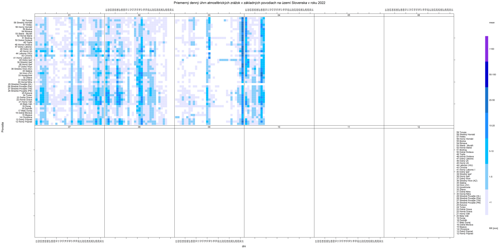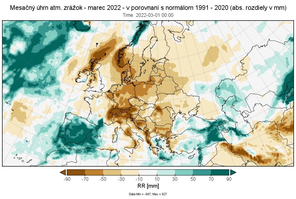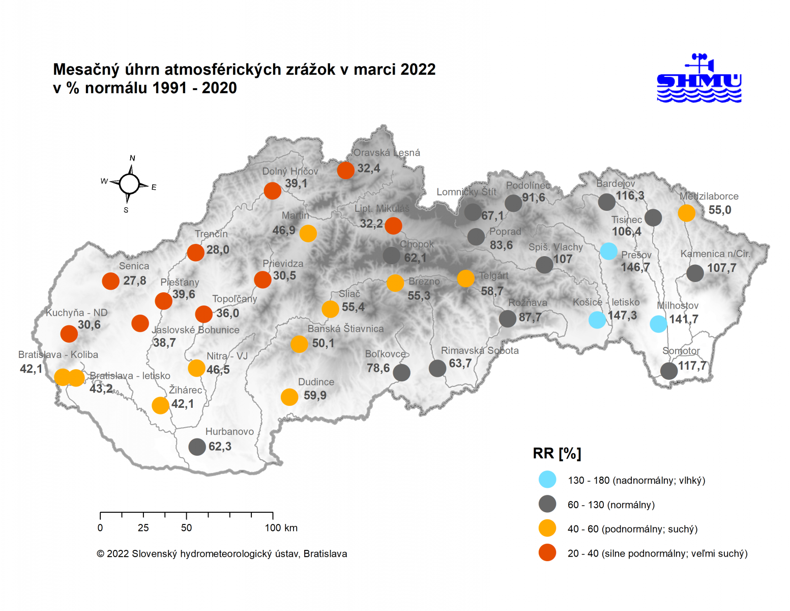 V dôsledku prevládajúcej anticyklonálnej situácie sa marec 2022 zaradil medzi výrazne suché mesiace. V západnej polovici územia Slovenska spadlo väčšinou od 30 do 60 % obvyklého mesačného úhrnu v marci, pričom v niektorých oblastiach Záhoria, stredného Považia, Ponitria alebo Oravy a Kysuc to bolo miestami výrazne menej ako 40 % marcového úhrnu. Marec 2022 tak skončil v porovnaní s normálom 1991 – 2020 na väčšine územia západného a stredného Slovenska ako zrážkovo podnormálny (suchý) a silne podnormálny (veľmi suchý). Na východnom Slovensku bola situácia vďaka výdatnejším zrážkam, ktoré padali v priebehu posledného marcového dňa (31.3.2022) priaznivejšia, tu skončil marec ako zrážkovo normálny až nadnormálny (vlhký). Percento normálu mesačného úhrnu zrážok bolo najvyššie 147,3 % v Košiciach, na letisku (podľa normálu 1981 – 2010 to bolo 124,3 %) a najnižšie 27,8 % v Senici (podľa normálu 1981 – 2010 to bolo 27,9 %).