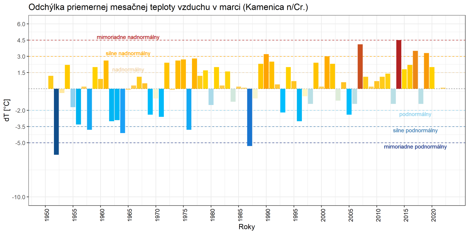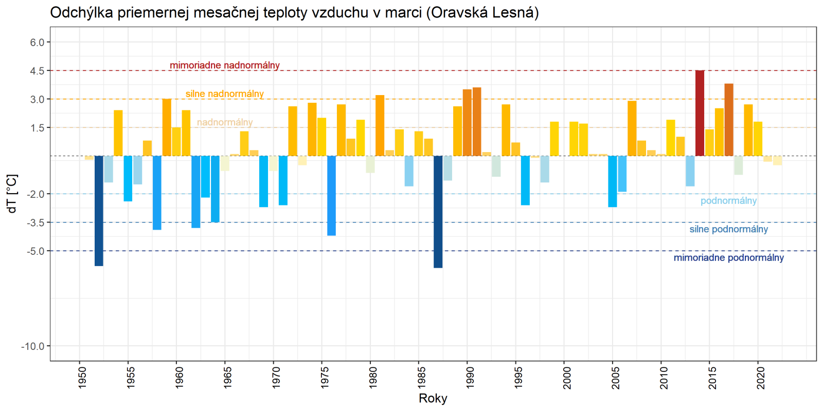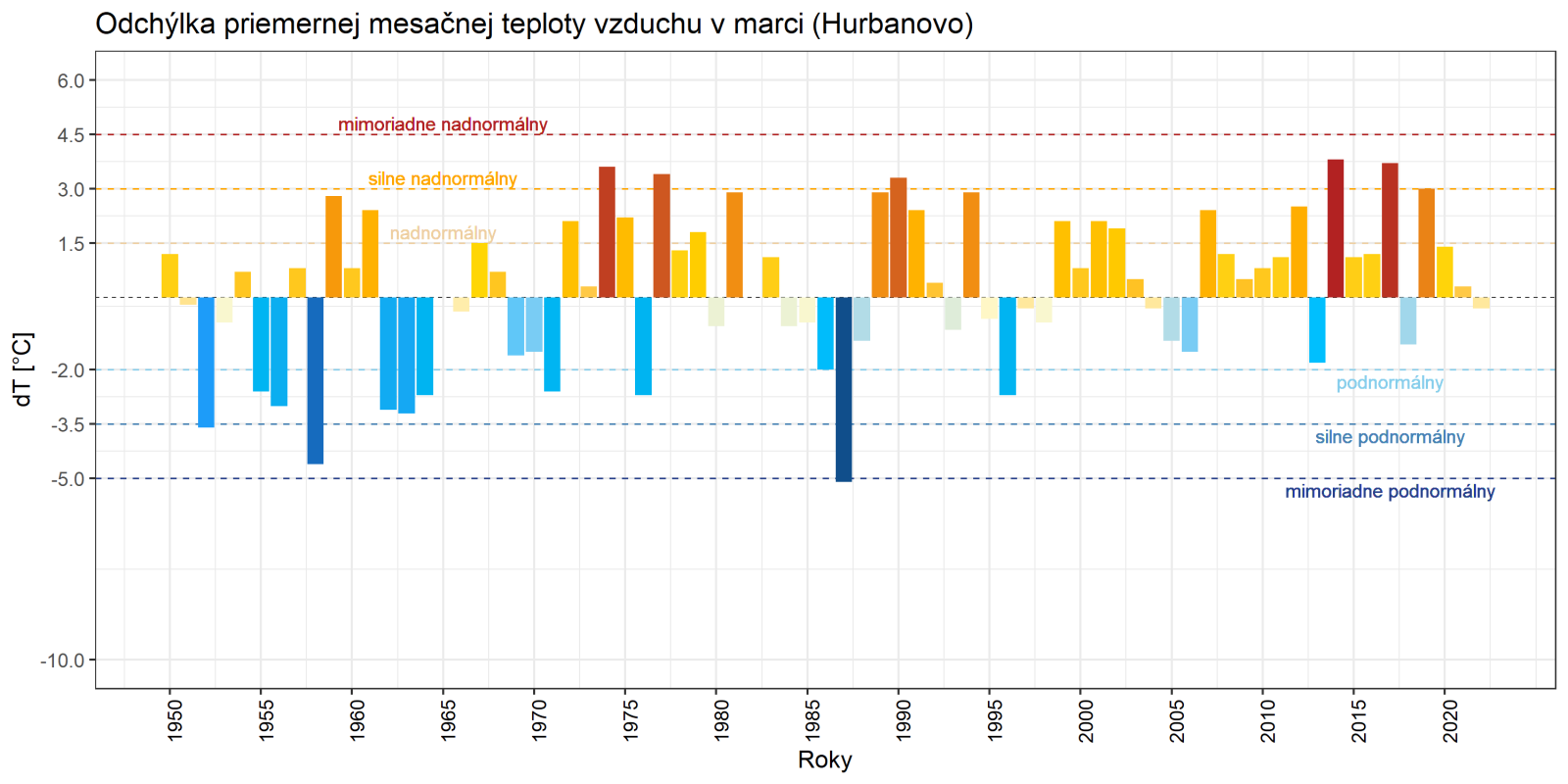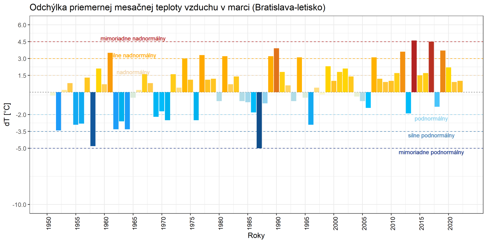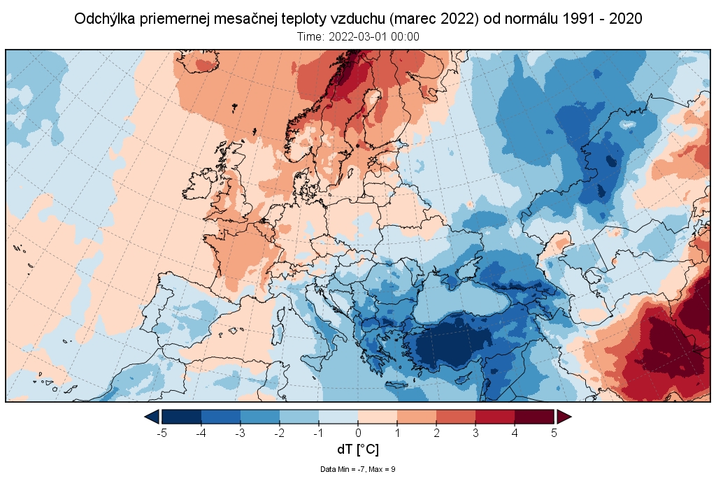Marec 2022 bol na Slovensku v porovnaní s normálom 1991 – 2020 teplotne normálny, pričom výrazne prevládali záporné odchýlky od normálu. Priemerná územná odchýlka mesačnej teploty vzduchu od uvedeného normálu bola -0,5 °C. Najvyššia odchýlka priemernej mesačnej teploty vzduchu od normálu 1991 – 2020 bola +0,6 °C na meteorologickej stanici Bratislava – Koliba (podľa normálu 1981 – 2010 to bolo až +1,2 °C). Najnižšia odchýlka teploty vzduchu bola -1,3 °C v Oravskej Lesnej a Dudinciach (podľa normálu 1981 – 2010 v Oravskej Lesnej bola odchýlka -0,9 °C).