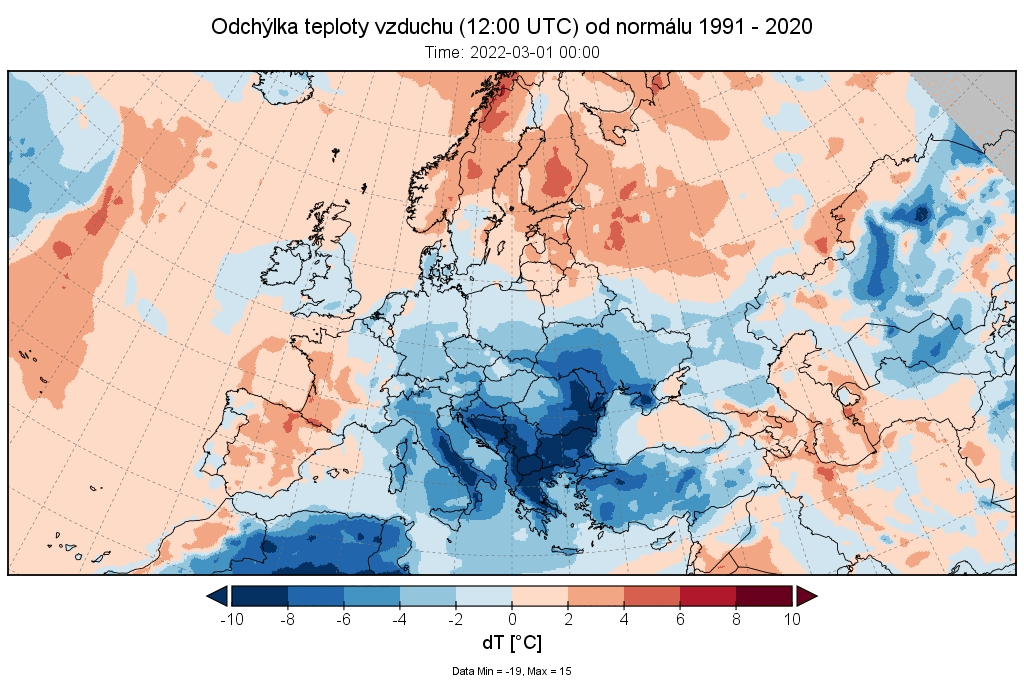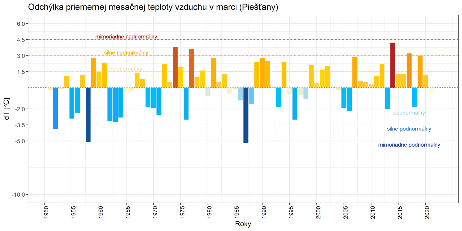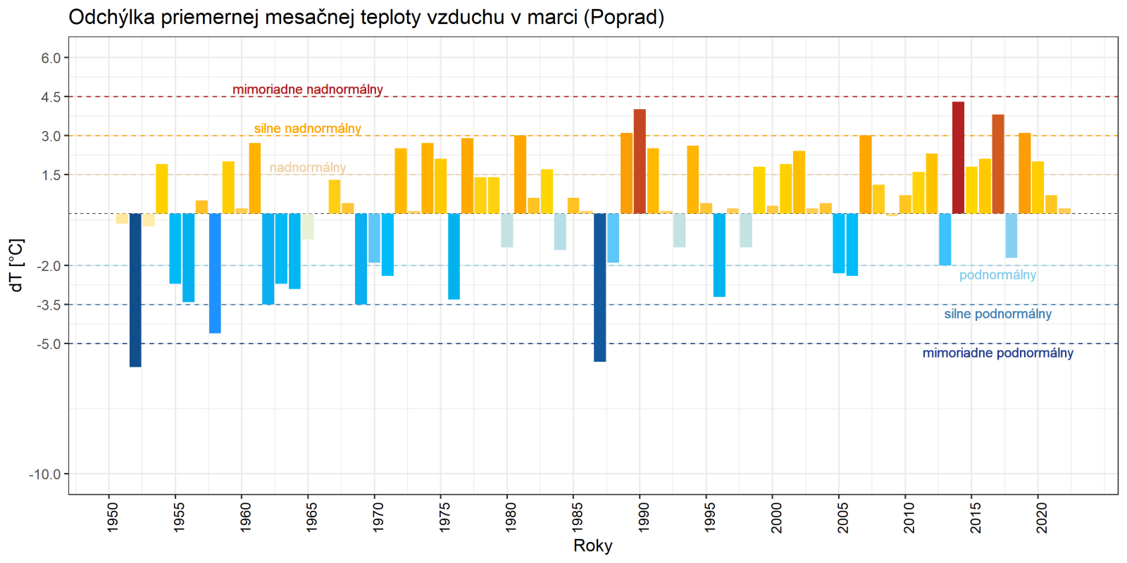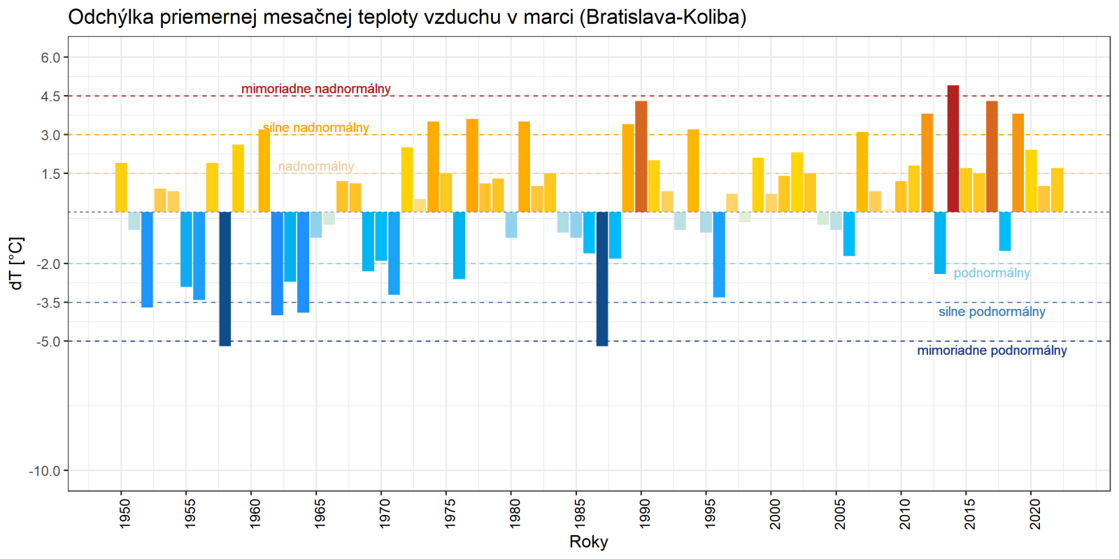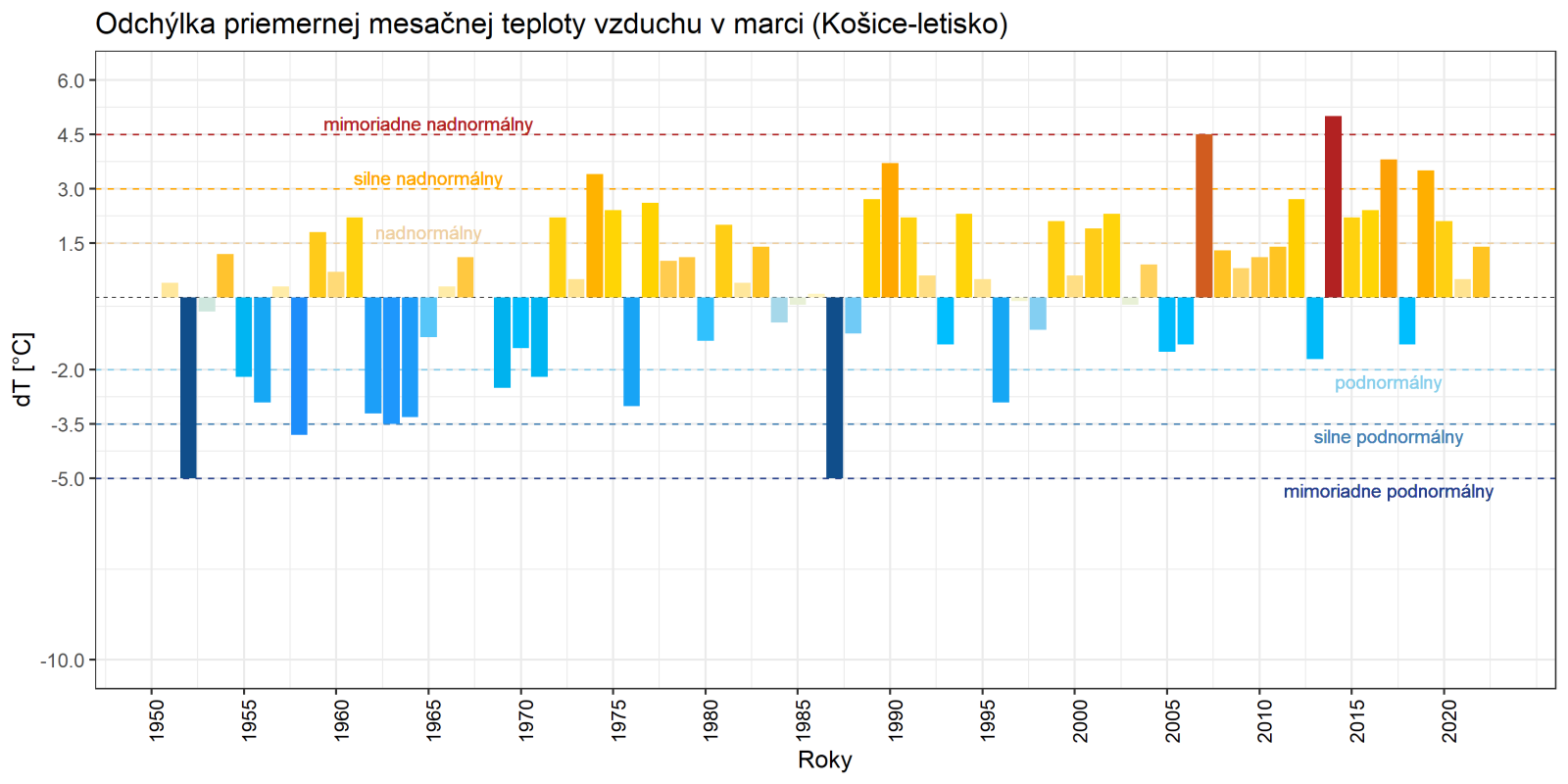 Marec 2022 bol na Slovensku v porovnaní s normálom 1991 – 2020 teplotne normálny, pričom výrazne prevládali záporné odchýlky od normálu. Priemerná územná odchýlka mesačnej teploty vzduchu od uvedeného normálu bola -0,5 °C. Najvyššia odchýlka priemernej mesačnej teploty vzduchu od normálu 1991 – 2020 bola +0,6 °C na meteorologickej stanici Bratislava – Koliba (podľa normálu 1981 – 2010 to bolo až +1,2 °C). Najnižšia odchýlka teploty vzduchu bola -1,3 °C v Oravskej Lesnej a Dudinciach (podľa normálu 1981 – 2010 v Oravskej Lesnej bola odchýlka -0,9 °C).