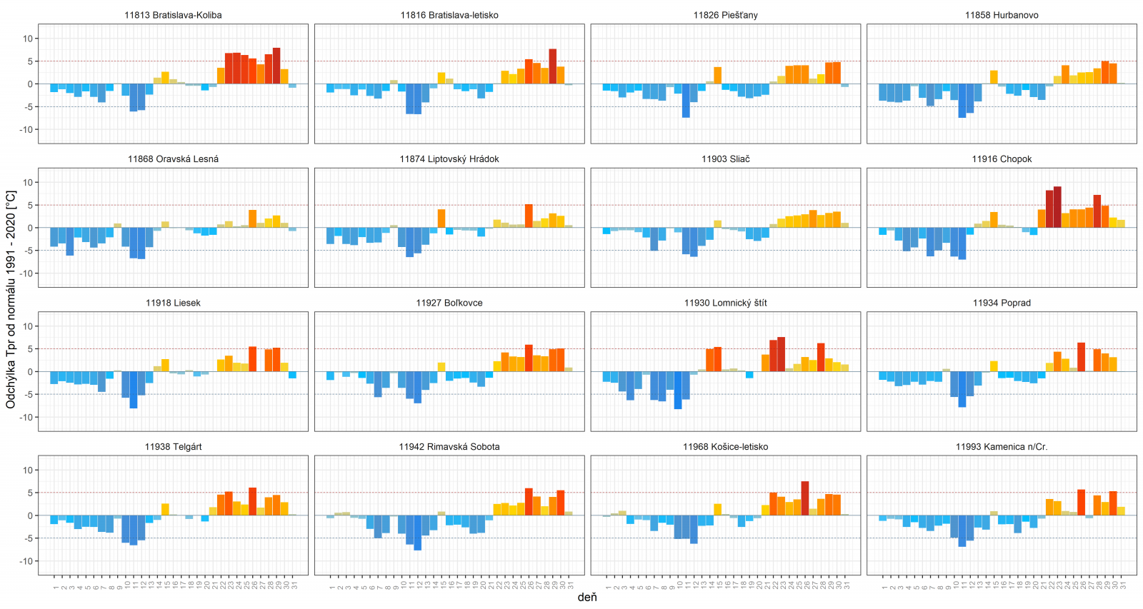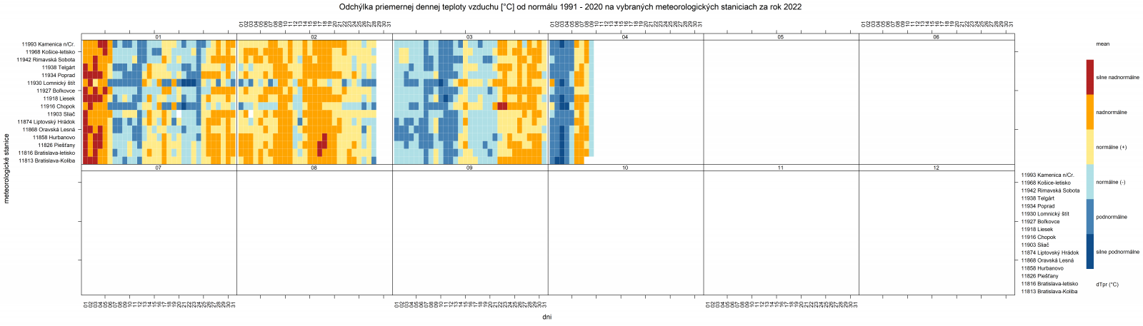 ▲ Obr. 5: Vývoj odchýlky priemernej dennej teploty vzduchu [°C] od normálu 1991 - 2020 na vybraných meteorologických staniciach na Slovensku v období v období 1.3. - 31.3.2022; v prílohe je k dispozícii rastrový diagram za obdobie od 1.1. do 9.4.2022 (zdroj: SHMÚ).