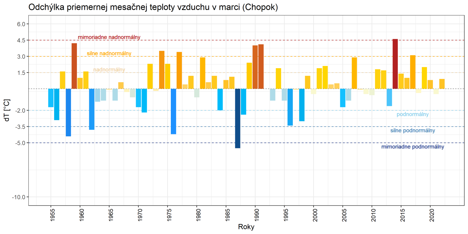 ▲ Obr. 7: Odchýlka priemernej mesačnej teploty vzduchu v marci [°C] od normálu 1961 - 1990 na vybraných meteorologických staniciach v období rokov 1951 - 2022 (Chopok 1955 - 2022; zdroj: SHMÚ).