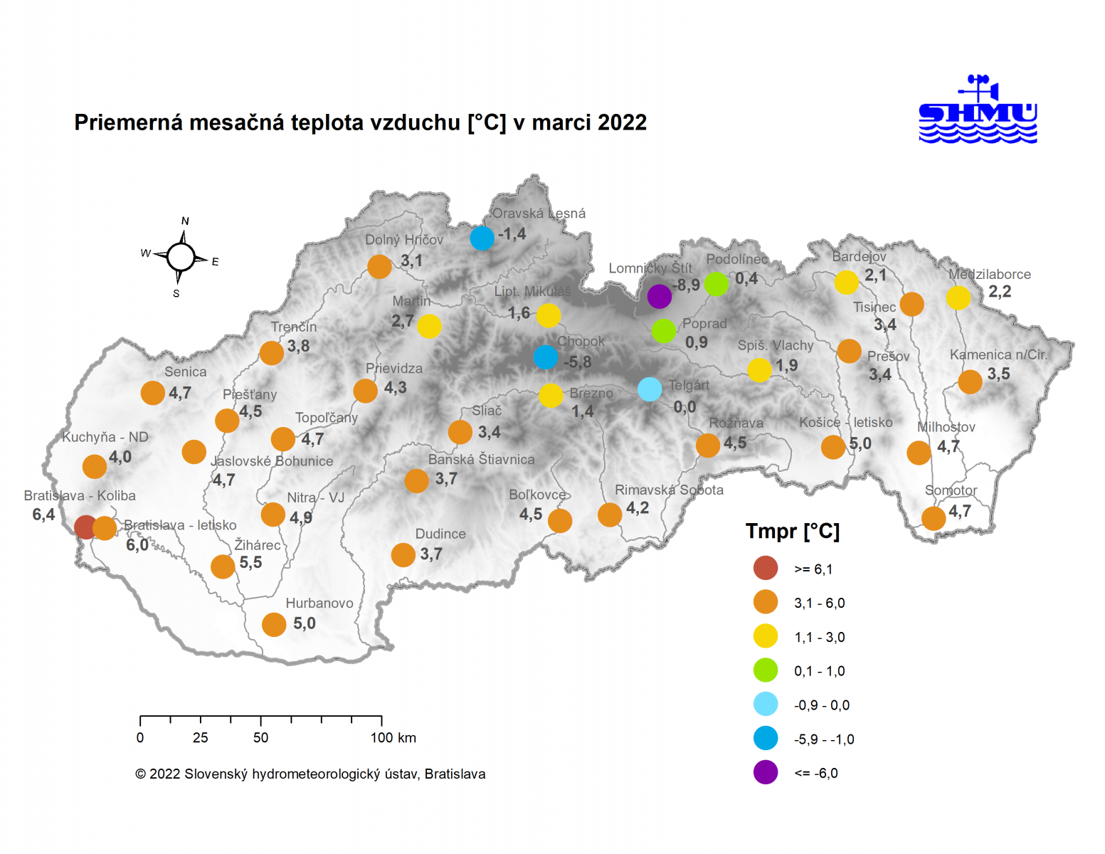 Priemerná mesačná teplota vzduchu v marci 2022 bola prevažne v intervale od 3,0 do 6,0 °C. Najvyššia priemerná mesačná teplota vzduchu bola 6,4 °C na meteorologickej stanici Bratislava – Koliba. Okrem vysokohorských polôh bolo chladnejšie len v niektorých kotlinách na severe stredného Slovenska (Telgárt 0,0 °C, Podolínec 0,4 °C alebo Poprad 0,9 °C). Najnižšia priemerná mesačná teplota vzduchu bola -1,4 °C v Oravskej Lesnej. Vo vysokých horských polohách bola priemerná mesačná teplota napr. na Lomnickom štíte -8,9 °C a na Chopku -5,8 °C.