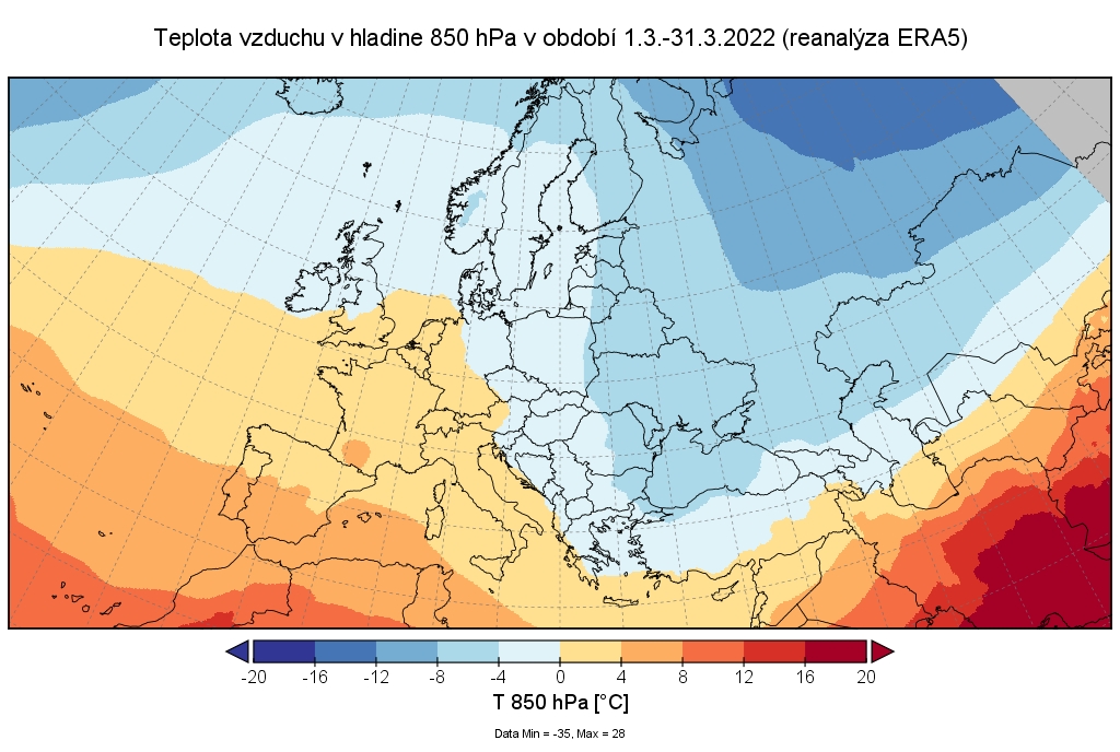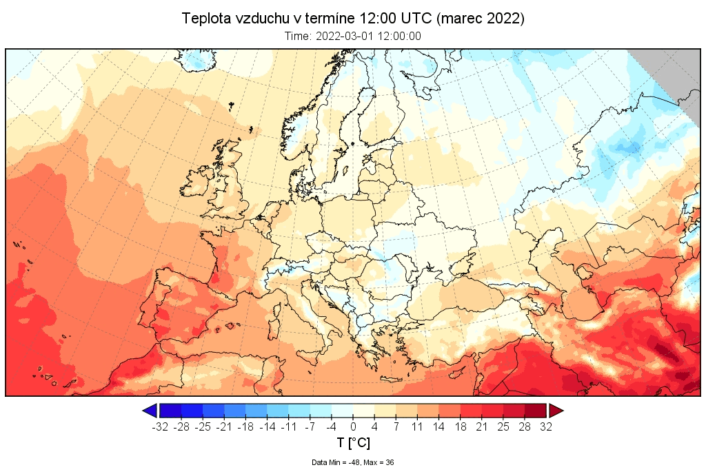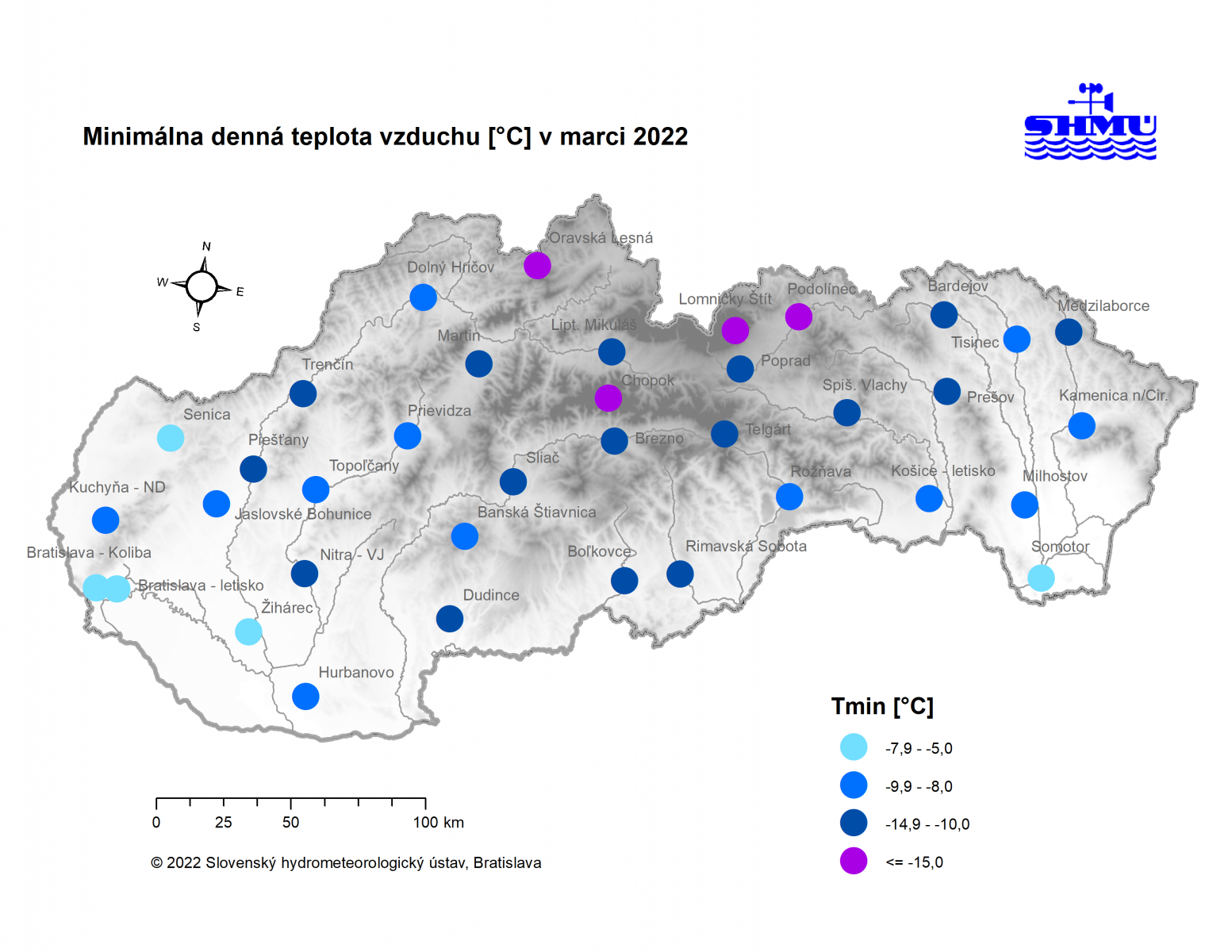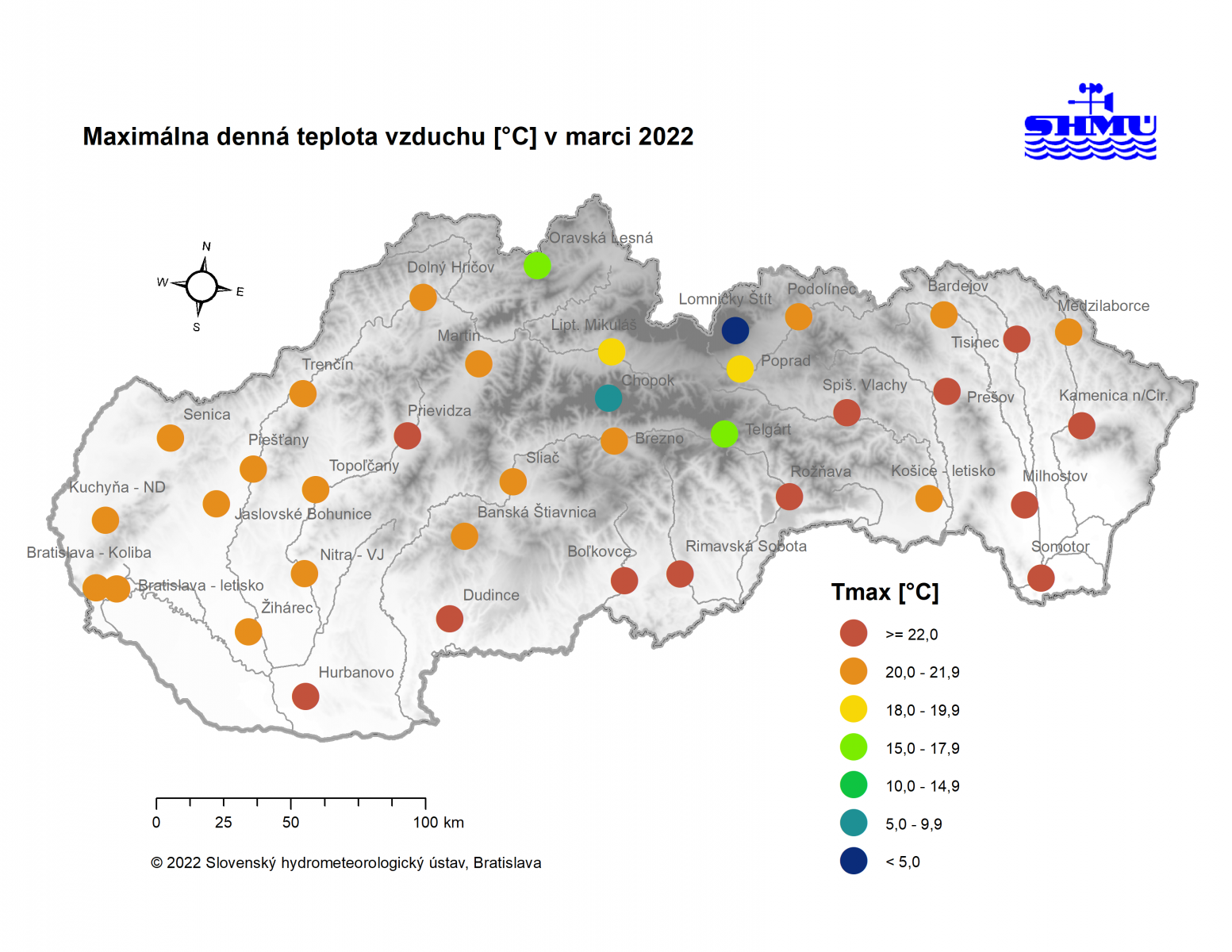 Na rozdiel februára, ktorých bol vo svojom priebehu prevažne teplotne nadnormálny, dominovali v prvých dvoch marcových dekádach dni s relatívne chladnejším počasím a nižšími priemernými dennými teplotami vzduchu (denné priemery teploty vzduchu boli pod normálom 1991 – 2020). Absolútne najnižšia teplota vzduchu v polohách do 1000 m n. m. bola nameraná 11.3. v obci Huty -18,3 °C (na Lomnickom štíte to bolo až -19,4 °C dňa 10.3). Pod hranicou -18 °C klesla teplota vzduchu aj v Červenom Kláštore -18,2 °C a Oraviciach -18,1 °C. Absolútne najvyššia teplota vzduchu bola 23,4 °C, nameraná v obci Kamenica nad Hronom dňa 24.3.2022. Teplota 23 °C a vyššia bola nameraná aj v Žiari nad Hronom (23,1 °C) a Rožňave (23,0 °C).