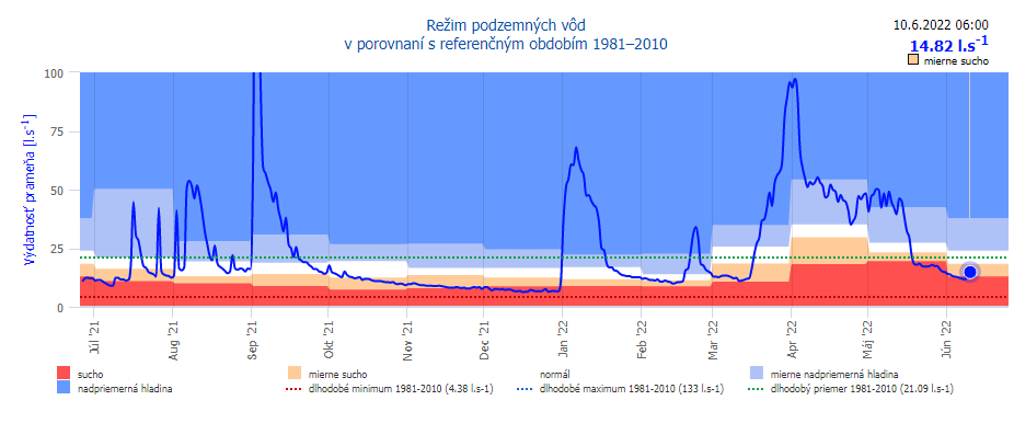 Z klimatického hľadiska bol celkovo mesiac máj hodnotený ako teplotne nadnormálny a zrážkovo silne až mimoriadne silne podnormálny mesiac hlavne na strednom a východnom Slovensku. V priebehu mesiaca máj pri absencií zrážok dochádzalo k poklesom hladiny podzemnej vody a výdatnosti prameňov v rámci celého územia Slovenska, ktorú môžete visieť aj na obrázku 6, kde je znázornený režim prameňa Žiar. Ako je z obrázka zrejmé, v druhej dekáde mája (16.5.) dochádzalo k výraznému poklesu výdatnosti na danom prameni. Výdatnosť prameňa bola od 19.5. pod dlhodobým priemerom a v porovnaní s dlhodobým normálom referenčného obdobia 1981-2010 bola výdatnosť výrazne nižšia ako je jej dlhodobý normál.