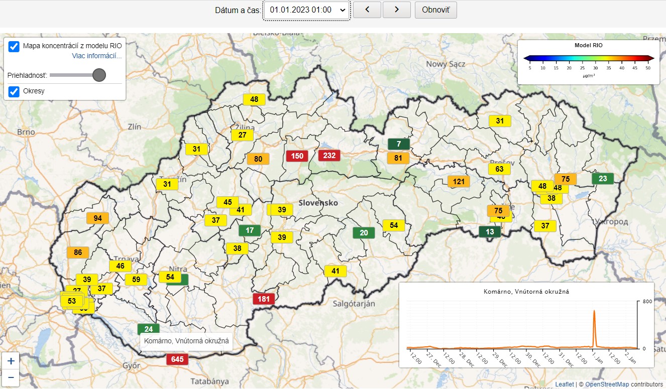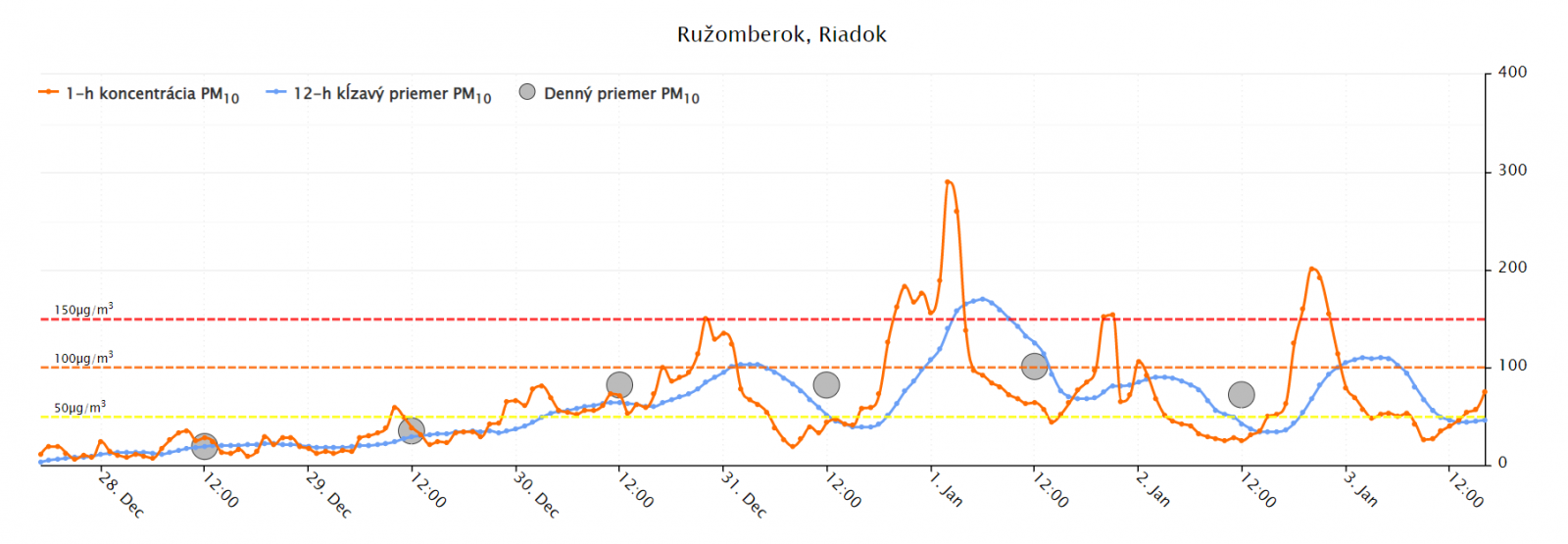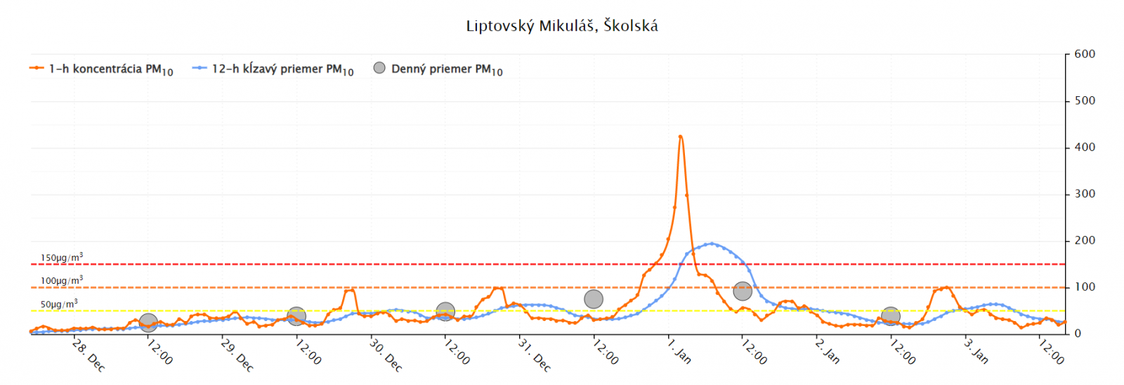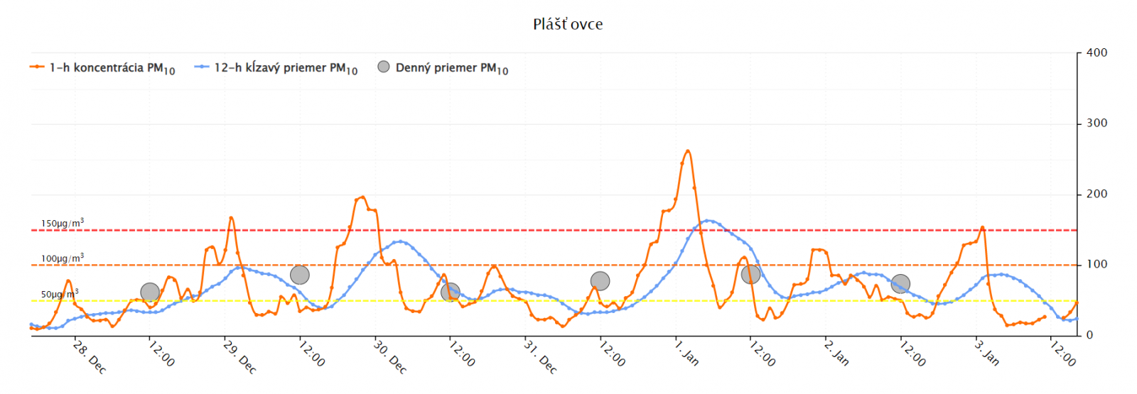 Vysoké hodnoty PM10 a PM2,5 boli zaznamenané na viacerých monitorovacích staniciach, pre zaujímavosť si môžete všimnúť na Obr. 1 stanice s najvyššími koncentráciami PM2,5.