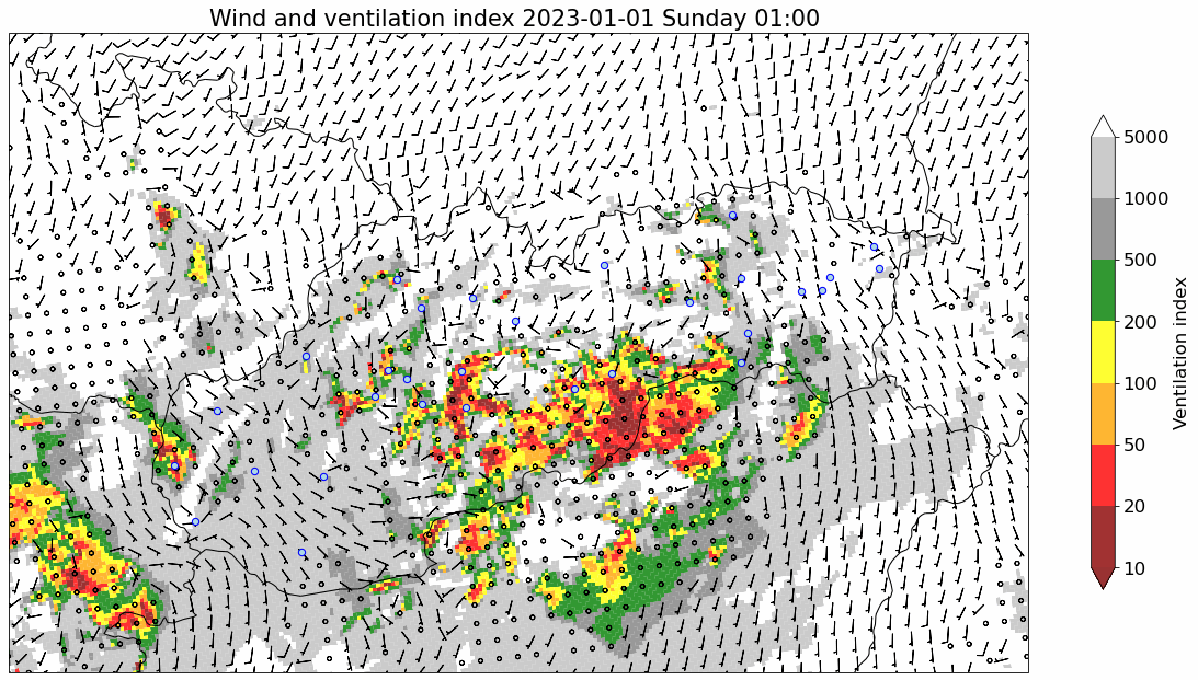Podľa Obr. 3, ktorý zobrazuje pole vetra vo výške 10 metrov a ventilačný index pre prvých 12 hodín roku 2023 na základe predpovede modelu ALADIN, môžeme predpokladať, že zhoršené rozptylové podmienky boli začiatkom roku na Gemeri, Above, Spiši, Horehroní aj na Považí.
