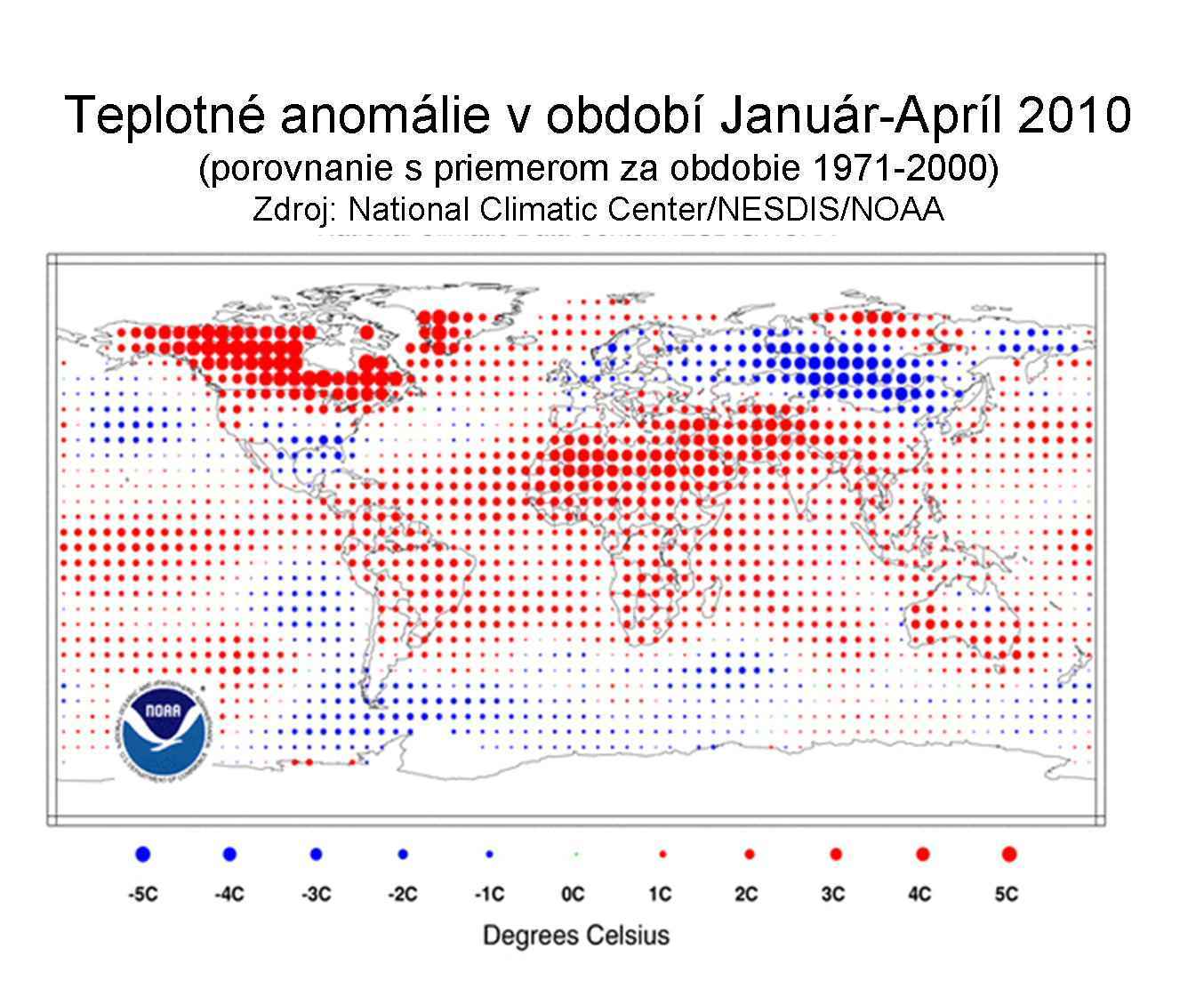- Globálny priemer teploty povrchu pevnín a oceánov dosiahol v období január-apríl 2010 hodnotu 13,3 °C, čo je o 0,69 °C viac ako je dlhodobý priemer v 20. storočí (12,6 °C). Rovnako ako v prípade apríla 2010 ide zatiaľ o najteplejšie obdobie január-apríl aspoň od roku 1880.