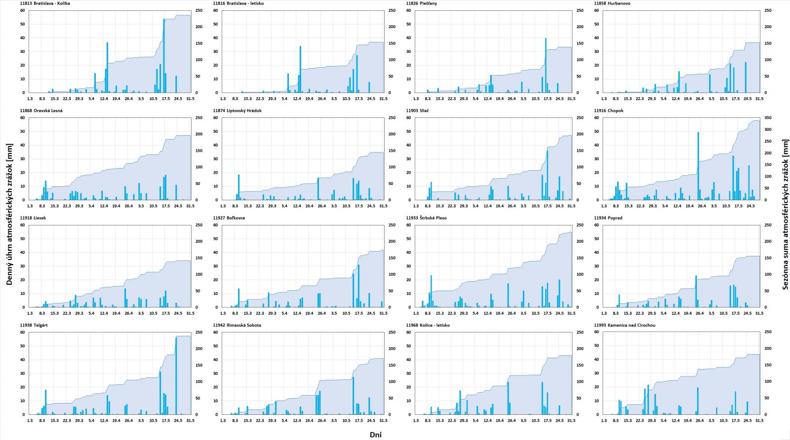 Obr. 3: Denný úhrn atmosférických zrážok [mm] a sezónna suma atmosférických zrážok [mm] na vybraných meteorologických staniciach na Slovensku v období 01.03.2023 - 31.05.2023 (zdroj: SHMÚ).