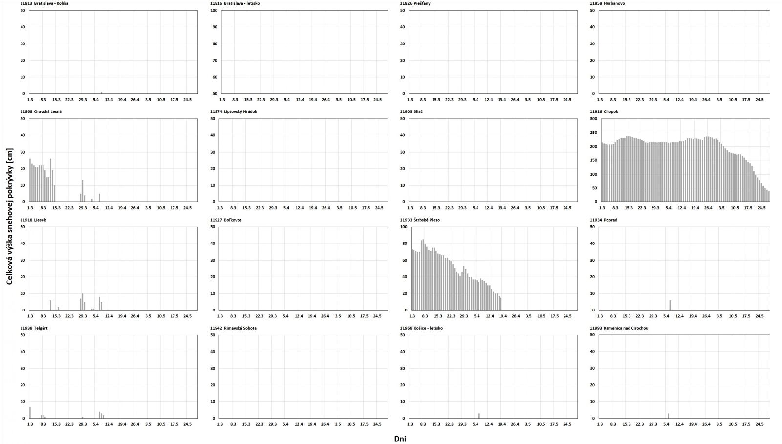 Obr. 4: Denný vývoj celkovej výšky snehovej pokrývky [cm] na vybraných meteorologických staniciach na Slovensku v období 01.03.2023 - 31.05.2023 (zdroj: SHMÚ).