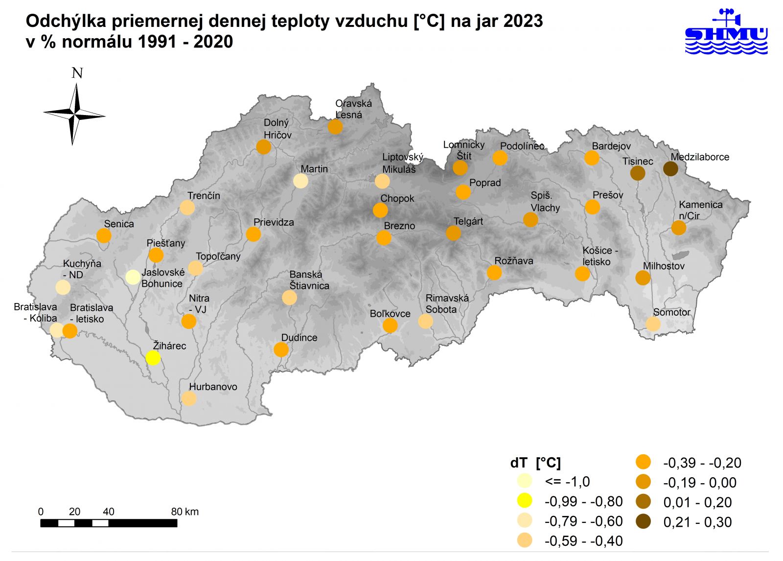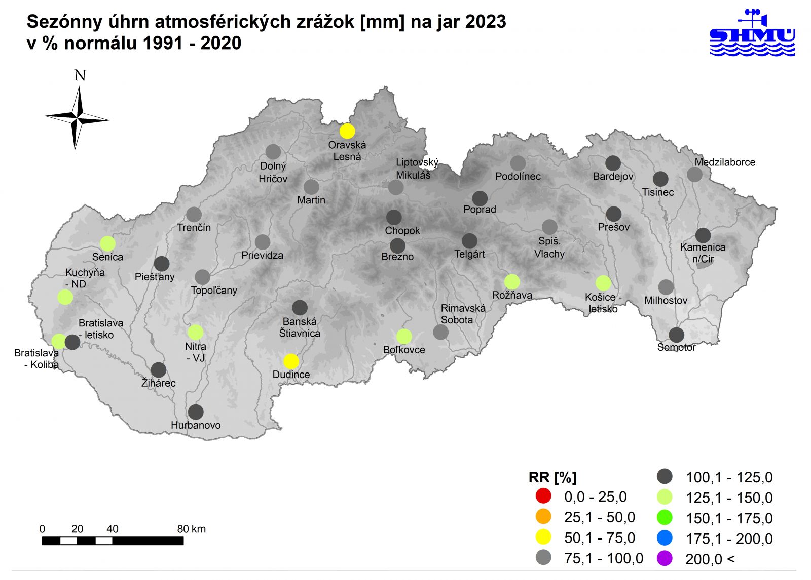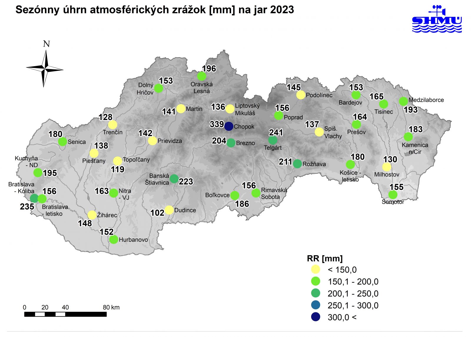 V roku 2023 bola dynamika zmien charakteru počasia na začiatku jari veľmi výrazná. Nezvyčajne premenlivý charakter počasia, v piatok (10.3.2023) popoludní a večer, potvrdili aj búrky, ktoré boli na niektorých miestach Slovenska veľmi silné. V sobotu (11.3.2023) potom zasiahol niektoré regióny Slovenska veľmi silný vietor. Noc na nedeľu (12.3.2023) bola už pokojnejšia a pri vyjasnení a utíšení vetra sa potom na niektorých miestach vyskytol pomerne silný mráz. Podobnými zvratmi a pomerne veľkými regionálnymi rozdielmi v rozložení atmosférických zrážok bol poznačený aj vývoj zrážok v priebehu tohtoročnej jari na Slovensku. V marci sa prejavovala v niektorých oblastiach Slovenska tendencia úbytku zrážok. Najmenej zrážok zaznamenali v tohtoročnom marci na Záhorí a v západných častiach Podunajskej nížiny, kde niekde nespadlo ani 10 mm zrážok. Zmena nastala v priebehu apríla, kedy sa začalo vyskytovať viac zrážok aj v oblastiach, kde sa dovtedy prejavoval ich určitý prechodný nedostatok. Tlaková níž, ktorá sa vytvorila na začiatku druhej aprílovej dekády nad severným Talianskom, spôsobila výdatné zrážky, ktorých jadro bolo juhozápadne až západne od Slovenska, ale významnejšie zrážky boli zaznamenané aj na krajnom juhozápade a západe Slovenska a tým sa v týchto oblastiach zmenil vývoj zrážok, ktorý práve na tomto území nebol na konci zimy a v prvej tretine tohtoročnej jari priaznivý, pretože sa tam vytváral deficit zrážok. Tieto tlakové níže na základe dráhy svojho postupu sú označované ako Vb – tlakové níže a boli relatívne viac aktívne napríklad v 60. rokoch 20. storočia. Určitým spôsobom prispeli k vyšším úhrnom zrážok, ktoré boli zaregistrované v niektorých rokoch tejto dekády 20. storočia v niektorých oblastiach strednej Európy. Pripomenúť treba, že práve v tomto období bola v roku 1965 u nás na Dunaji povodeň s katastrofálnymi dôsledkami na veľkej časti Žitného ostrova. Vplyv uvádzanej tlakovej níže sa prejavil aj na denných úhrnoch zrážok. Denný úhrn zrážok 32 mm v Kuchyni na letisku (14.4.2023) bol tam štvrtým najvyšším denným úhrnom zrážok v apríli aspoň od roku 1961. Denný úhrn zrážok 37 mm v Bratislave, Mlynskej doline (14.4.2023) bol dokonca druhým najvyšším denným úhrnom zrážok na tejto meteorologickej stanici v apríli aspoň od roku 1982 a vyšší denný úhrn zrážok tam v tomto druhom jarnom mesiaci zaregistrovali iba 2.4.1996 (43 mm). Naopak, dosah pásma zrážok spojeného s uvádzanou tlakovou nížou sa takmer neprejavil na niektorých miestach stredného Považia a na krajnom severovýchode Slovenska. V apríli, podobne ako v marci, boli v tomto roku zaznamenané dosť veľké rozdiely v územnom rozložení atmosférických zrážok. V tohtoročnom apríli zaznamenali na krajnom západe a juhozápade Slovenska ojedinele viac ako 100 mm zrážok, čo je v tomto mesiaci v týchto oblastiach výnimočné. Napríklad na Záhorí, v Kuchyni na letisku spadlo v apríli 103 mm zrážok a bol to na tejto meteorologickej stanici štvrtý najvyšší mesačný úhrn zrážok pre apríl aspoň od roku 1961. Viac zrážok ako v tohtoročnom apríli tam zaznamenali v posledných 63 rokoch v tomto druhom jarnom mesiaci iba v rokoch 1973 (134 mm), 2006 (108 mm) a 1965 (104 mm). Podobne to bolo v Bratislave, Mlynskej doline, kde v tomto mesiaci zaregistrovali tesne menej ako 100 mm zrážok (92 mm), ale bol to tam pre tento mesiac druhý najvyšší mesačný úhrn zrážok od začiatku prevádzky tejto meteorologickej stanice v roku 1982. Viac zrážok tam v apríli zaznamenali iba v roku 1996 (100 mm). V druhej dekáde mája sa vyskytli na území Slovenska opakovane výdatné dažde. Regionálny rozsah ich výskytu bol v jednotlivých prípadoch rôzny. V máji, v poslednom jarnom mesiaci, boli v tomto roku mesačné úhrny zrážok na Slovensku ešte vyššie ako v apríli. Ale podobne ako v apríli, boli priestorovo dosť rozdielne, čo spôsobili už aj búrky, ale hlavnou príčinou boli jednotlivé zrážkovo významné poveternostné situácie, pri ktorých boli najvýdatnejšie veľkopriestorové zrážky sústredené na krajný západ a juhozápad Slovenska a ešte aj do niektorých oblastí v južnej polovici stredného Slovenska a na juhozápade východného Slovenska. Okrem toho v poli mesačných úhrnov zrážok v tohtoročnom máji sa prejavili aj lokálne vplyvy búrkových lejakov, pri ktorých ojedinele spadlo v krátkom čase (väčšinou menej ako 1 hodina) aj viac desiatok milimetrov zrážok. Najvyššie mesačné úhrny zrážok dosiahli na Slovensku v máji v roku 2023 viac ako 120 mm a ojedinele to bolo aj viac ako 150 mm. Boli to hodnoty, ktoré sa blížili k rekordným mesačným úhrnom zrážok pre mesiac máj na príslušných meteorologických staniciach. Napríklad v Bratislave na Kolibe spadlo v tohtoročnom máji za celý mesiac 129 mm zrážok a bol to tam v tomto mesiaci 5. najvyšší mesačný úhrn zrážok aspoň od roku 1951, takže za posledných 73 rokov tam v máji zaznamenali viac zrážok ako teraz, iba v rokoch 2010 186 mm, 2019 165 mm, 1965 158 mm a 1987 140 mm. Veľmi podobne to bolo aj v Bratislave, Mlynskej doline, kde v tohtoročnom máji spadlo 124 mm zrážok a viac zrážok tam v tomto mesiaci zaregistrovali od roku 1982 iba trikrát, v roku 2019 162 mm, v roku 2010 156 mm a v roku 1991 127 mm. Medzi oblasti Slovenska, kde bolo v tohtoročnom máji menej atmosférických zrážok patril širší priestor Východoslovenskej nížiny, kde napríklad vo Vysokej nad Uhom a v neďalekej Orechovej zaznamenali za celý mesiac iba 29 mm zrážok. Opakované chladnejšie počasie v niektorých obdobiach tohtoročnej jari spôsobilo, že pomerne veľká časť zrážok vo vysokohorských polohách Slovenska v tomto ročnom období ešte padala v tuhej fo
