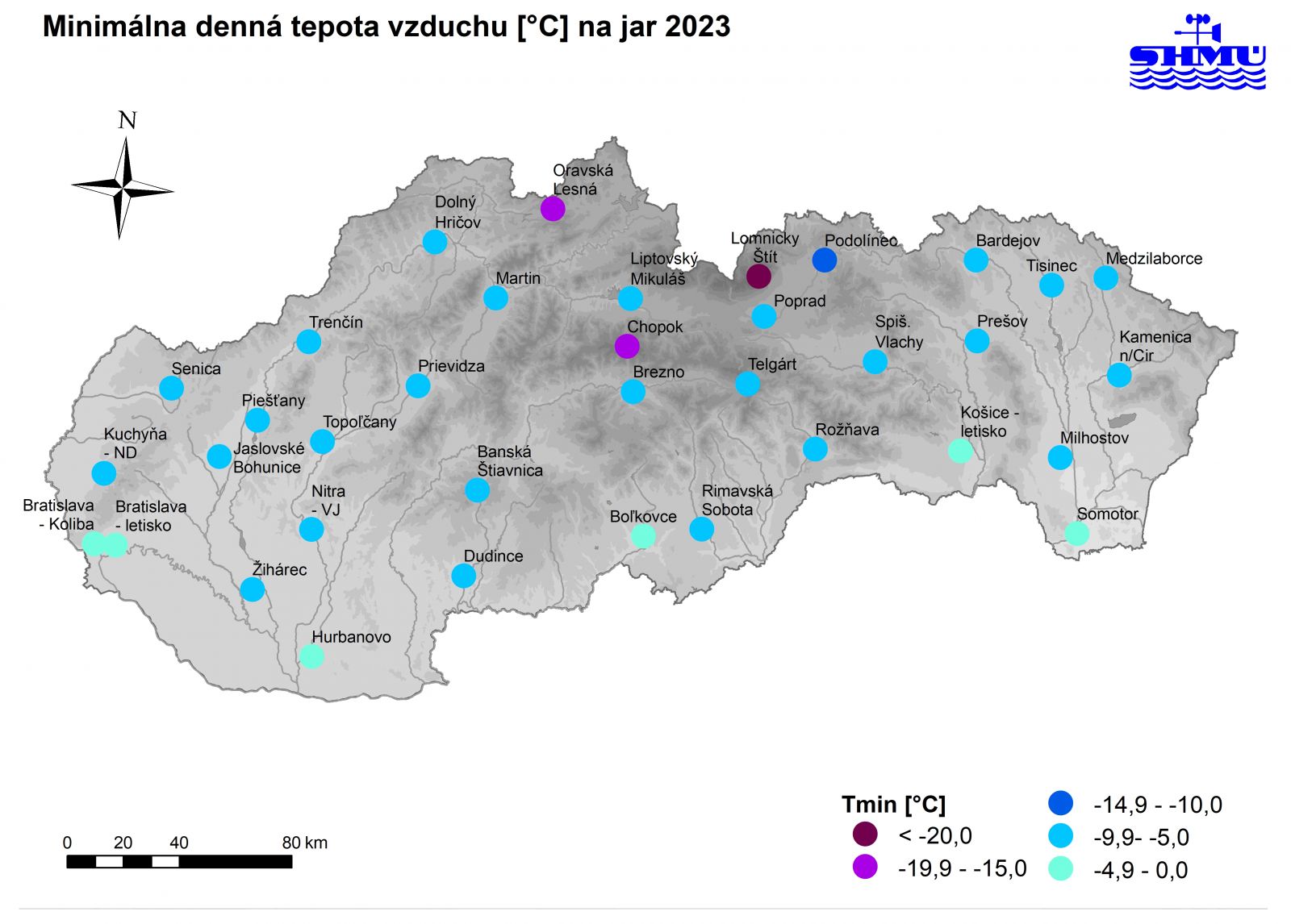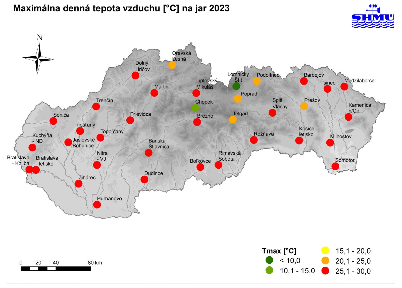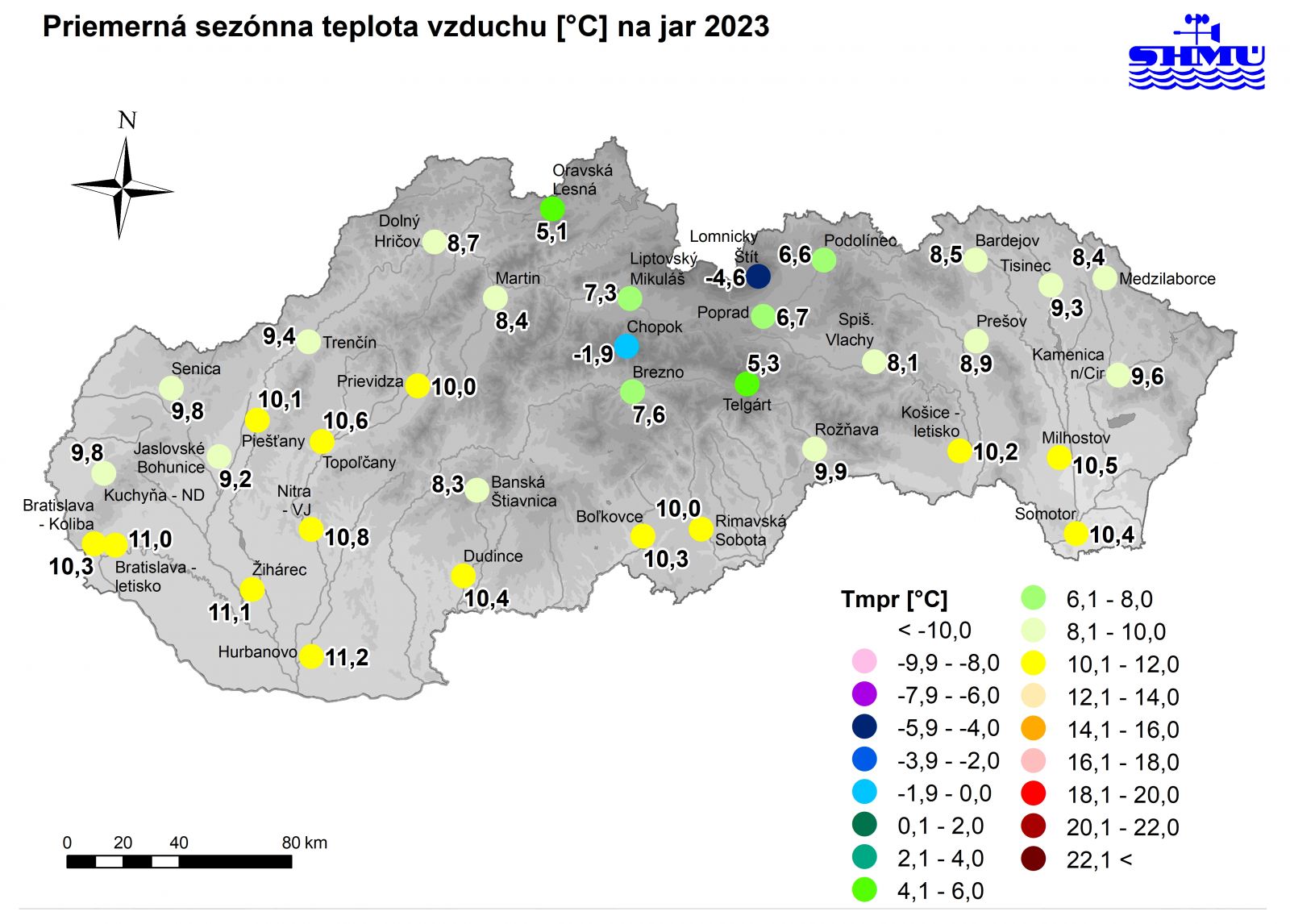 V roku 2023 bola dynamika zmien charakteru počasia na začiatku jari veľmi výrazná. Nezvyčajne premenlivý charakter počasia, v piatok (10.3.2023) popoludní a večer, potvrdili aj búrky, ktoré boli na niektorých miestach Slovenska veľmi silné. V sobotu (11.3.2023) potom zasiahol niektoré regióny Slovenska veľmi silný vietor. Noc na nedeľu (12.3.2023) bola už pokojnejšia a pri vyjasnení a utíšení vetra sa potom na niektorých miestach vyskytol pomerne silný mráz. Podobnými zvratmi a pomerne veľkými regionálnymi rozdielmi v rozložení atmosférických zrážok bol poznačený aj vývoj zrážok v priebehu tohtoročnej jari na Slovensku. V marci sa prejavovala v niektorých oblastiach Slovenska tendencia úbytku zrážok. Najmenej zrážok zaznamenali v tohtoročnom marci na Záhorí a v západných častiach Podunajskej nížiny, kde niekde nespadlo ani 10 mm zrážok. Zmena nastala v priebehu apríla, kedy sa začalo vyskytovať viac zrážok aj v oblastiach, kde sa dovtedy prejavoval ich určitý prechodný nedostatok. Tlaková níž, ktorá sa vytvorila na začiatku druhej aprílovej dekády nad severným Talianskom, spôsobila výdatné zrážky, ktorých jadro bolo juhozápadne až západne od Slovenska, ale významnejšie zrážky boli zaznamenané aj na krajnom juhozápade a západe Slovenska a tým sa v týchto oblastiach zmenil vývoj zrážok, ktorý práve na tomto území nebol na konci zimy a v prvej tretine tohtoročnej jari priaznivý, pretože sa tam vytváral deficit zrážok. Tieto tlakové níže na základe dráhy svojho postupu sú označované ako Vb – tlakové níže a boli relatívne viac aktívne napríklad v 60. rokoch 20. storočia. Určitým spôsobom prispeli k vyšším úhrnom zrážok, ktoré boli zaregistrované v niektorých rokoch tejto dekády 20. storočia v niektorých oblastiach strednej Európy. Pripomenúť treba, že práve v tomto období bola v roku 1965 u nás na Dunaji povodeň s katastrofálnymi dôsledkami na veľkej časti Žitného ostrova. Vplyv uvádzanej tlakovej níže sa prejavil aj na denných úhrnoch zrážok. Denný úhrn zrážok 32 mm v Kuchyni na letisku (14.4.2023) bol tam štvrtým najvyšším denným úhrnom zrážok v apríli aspoň od roku 1961. Denný úhrn zrážok 37 mm v Bratislave, Mlynskej doline (14.4.2023) bol dokonca druhým najvyšším denným úhrnom zrážok na tejto meteorologickej stanici v apríli aspoň od roku 1982 a vyšší denný úhrn zrážok tam v tomto druhom jarnom mesiaci zaregistrovali iba 2.4.1996 (43 mm). Naopak, dosah pásma zrážok spojeného s uvádzanou tlakovou nížou sa takmer neprejavil na niektorých miestach stredného Považia a na krajnom severovýchode Slovenska. V apríli, podobne ako v marci, boli v tomto roku zaznamenané dosť veľké rozdiely v územnom rozložení atmosférických zrážok. V tohtoročnom apríli zaznamenali na krajnom západe a juhozápade Slovenska ojedinele viac ako 100 mm zrážok, čo je v tomto mesiaci v týchto oblastiach výnimočné. Napríklad na Záhorí, v Kuchyni na letisku spadlo v apríli 103 mm zrážok a bol to na tejto meteorologickej stanici štvrtý najvyšší mesačný úhrn zrážok pre apríl aspoň od roku 1961. Viac zrážok ako v tohtoročnom apríli tam zaznamenali v posledných 63 rokoch v tomto druhom jarnom mesiaci iba v rokoch 1973 (134 mm), 2006 (108 mm) a 1965 (104 mm). Podobne to bolo v Bratislave, Mlynskej doline, kde v tomto mesiaci zaregistrovali tesne menej ako 100 mm zrážok (92 mm), ale bol to tam pre tento mesiac druhý najvyšší mesačný úhrn zrážok od začiatku prevádzky tejto meteorologickej stanice v roku 1982. Viac zrážok tam v apríli zaznamenali iba v roku 1996 (100 mm). V druhej dekáde mája sa vyskytli na území Slovenska opakovane výdatné dažde. Regionálny rozsah ich výskytu bol v jednotlivých prípadoch rôzny. V máji, v poslednom jarnom mesiaci, boli v tomto roku mesačné úhrny zrážok na Slovensku ešte vyššie ako v apríli. Ale podobne ako v apríli, boli priestorovo dosť rozdielne, čo spôsobili už aj búrky, ale hlavnou príčinou boli jednotlivé zrážkovo významné poveternostné situácie, pri ktorých boli najvýdatnejšie veľkopriestorové zrážky sústredené na krajný západ a juhozápad Slovenska a ešte aj do niektorých oblastí v južnej polovici stredného Slovenska a na juhozápade východného Slovenska. Okrem toho v poli mesačných úhrnov zrážok v tohtoročnom máji sa prejavili aj lokálne vplyvy búrkových lejakov, pri ktorých ojedinele spadlo v krátkom čase (väčšinou menej ako 1 hodina) aj viac desiatok milimetrov zrážok. Najvyššie mesačné úhrny zrážok dosiahli na Slovensku v máji v roku 2023 viac ako 120 mm a ojedinele to bolo aj viac ako 150 mm. Boli to hodnoty, ktoré sa blížili k rekordným mesačným úhrnom zrážok pre mesiac máj na príslušných meteorologických staniciach. Napríklad v Bratislave na Kolibe spadlo v tohtoročnom máji za celý mesiac 129 mm zrážok a bol to tam v tomto mesiaci 5. najvyšší mesačný úhrn zrážok aspoň od roku 1951, takže za posledných 73 rokov tam v máji zaznamenali viac zrážok ako teraz, iba v rokoch 2010 186 mm, 2019 165 mm, 1965 158 mm a 1987 140 mm. Veľmi podobne to bolo aj v Bratislave, Mlynskej doline, kde v tohtoročnom máji spadlo 124 mm zrážok a viac zrážok tam v tomto mesiaci zaregistrovali od roku 1982 iba trikrát, v roku 2019 162 mm, v roku 2010 156 mm a v roku 1991 127 mm. Medzi oblasti Slovenska, kde bolo v tohtoročnom máji menej atmosférických zrážok patril širší priestor Východoslovenskej nížiny, kde napríklad vo Vysokej nad Uhom a v neďalekej Orechovej zaznamenali za celý mesiac iba 29 mm zrážok. Opakované chladnejšie počasie v niektorých obdobiach tohtoročnej jari spôsobilo, že pomerne veľká časť zrážok vo vysokohorských polohách Slovenska v tomto ročnom období ešte padala v tuhej fo