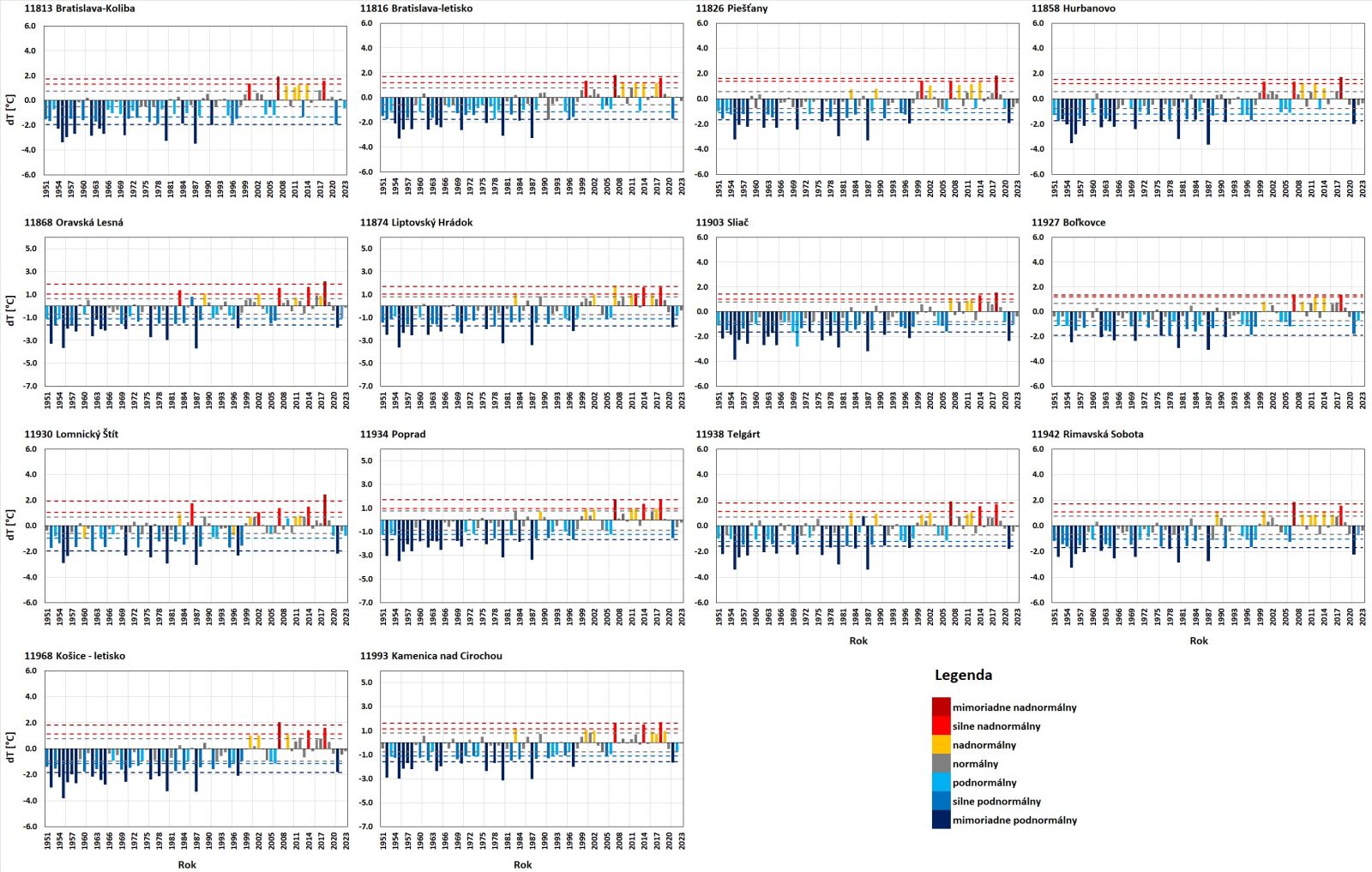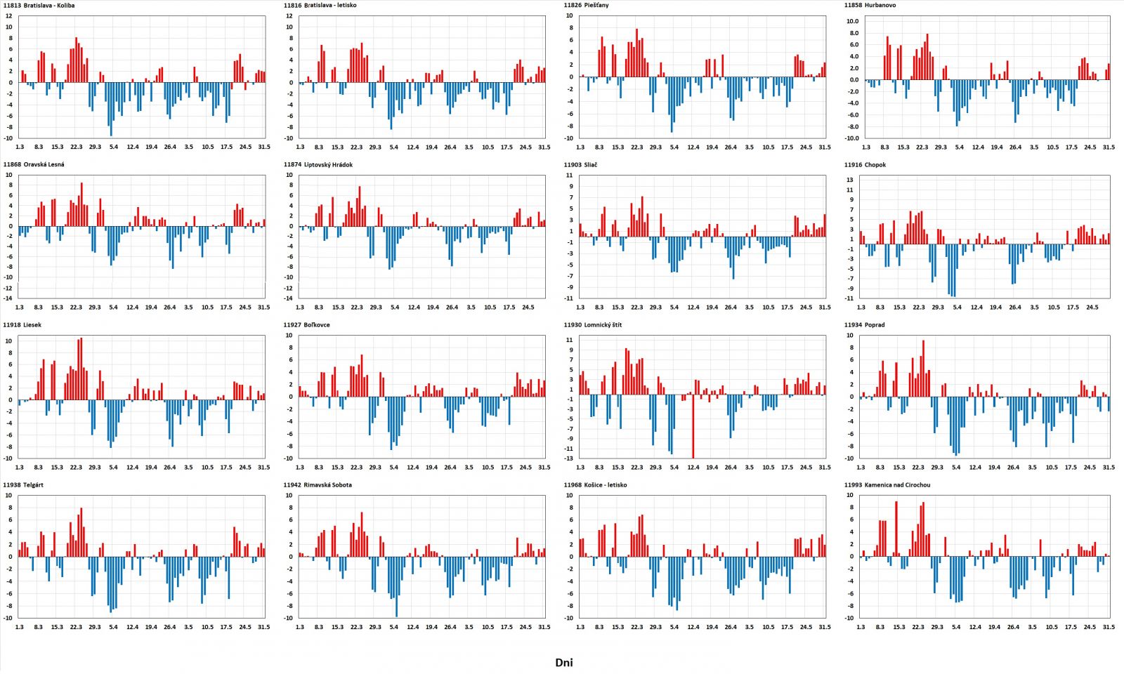 Obr. 1: Vývoj odchýlky priemernej dennej teploty vzduchu [°C] od normálu 1991 - 2020 na vybraných meteorologických staniciach na Slovensku v období 01.03.2023 - 31.05.2023 (zdroj: SHMÚ).