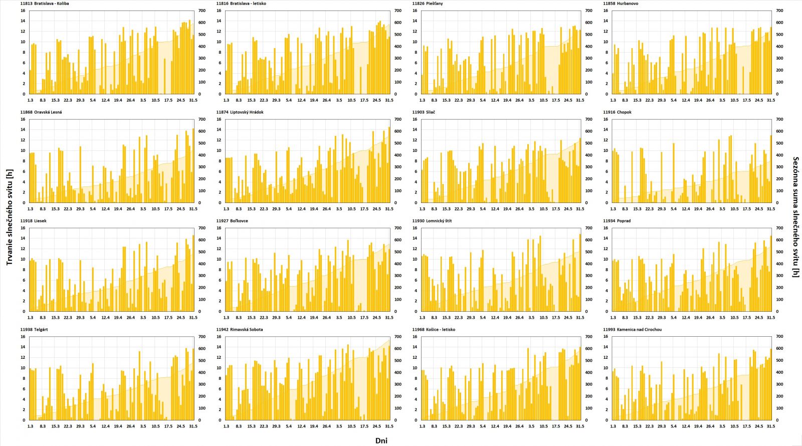 Obr. 6: Denný vývoj slnečného svitu [h] a sezónna suma slnečného svitu [h] na vybraných meteorologických staniciach na Slovensku v období 01.03.2023 - 31.05.2023 (zdroj: SHMÚ).